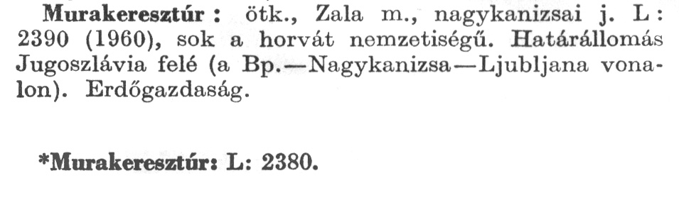 Nyilvános 2329 | 5930 | A szócikkek felismertetett szövege: | (A csillag után az 1972-es kiadású kiegészítő kötetből származó szöveg következik) Murakeresztúr: ötk., Zala m., nagykanizsai j. L: 2390 (1960), sok a horvát nemzetiségű. Határállomás Jugoszlávia felé (a Bp.–Nagykanizsa–Ljubljana vonalon). Erdőgazdaság. *Murakeresztúr: L: 2380. A szócikkek a következő lexikonból származnak: Cím: Új magyar lexikon Közreműködő: Berei Andor (1900-1979) (szerk.) Szerz. közl.: [szerk. Berei Andor et al.] Kiadás jelzés: 2. lny. Kiadás: Budapest : Akad. K., 1961-1962 Kötetei: 1., A - C 2., D - F 3., G - J 4., K - Me 5., Mf - R 6., S - Z 7. köt., A-Z Kiegészítő kötet (1972) Kiegészítő kötet, 1962÷1980 (1981) ETO jelzet: 03=945.11 Szakjelzet: 030 Cutter: U 28 Nyelv: magyar Megjegyzés: Bibliogr. a címszavak egy részének végén |