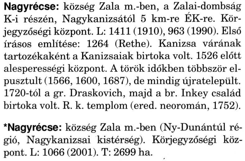 Nyilvános 2719 | 6810 | A szócikkek felismertetett szövege: | (A csillag után a kiegészítő kötetből származó szöveg következik) Nagyrécse: község Zala m.-ben, a Zalai-dombság K-i részén, Nagykanizsától 5 km-re ÉK-re. Körjegyzőségi központ. L: 1411 (1910), 963 (1990). Első írásos említése: 1264 (Rethe). Kanizsa várának tartozékaként a Kanizsaiak birtoka volt. 1526 előtt alesperességi központ. A török időkben többször elpusztult (1566, 1600, 1687), de mindig újratelepült. 1720-tól a gr. Draskovich, majd a br. Inkey család birtoka volt. R. k. templom (ered. neoromán, 1752). *Nagyrécse: község Zala m.-ben (Ny-Dunántúl régió, Nagykanizsai kistérség). Körjegyzőségi központ. L: 1066 (2001). T: 2699 ha. A szócikkek a következő lexikonból származnak: Cím: Magyar nagylexikon Közreműködő: Élesztős László (1949) (szerk.) ; Barabás Éva (1943) (szerk.) ; Berényi Gábor (1946) (szerk.) ; Bárány Lászlóné (szerk.) ; Adelmann-né Kertész Judit (1945) (közrem.) ; Froemel Károlyné Jáky Éva (1936) (közrem.) ; Akadémiai Kiadó és Nyomda Vállala Szerz. közl.: [... Élesztős László főszerk.] ; [szerk. Barabás Éva et al.] ; [bibliogr. Adelmanné Kertész Judit] ; [kész. az Akadémiai Kiadó Magyar Nagylexikon Szerkesztőségében] Kiadás: Budapest : Akad. K., 1993- Kötetei: 1. köt., A - Anc 2. köt., And - Bag 3. köt., Bah - Bij 4. köt., Bik - Bz 5. köt., C - Csem 6. köt., Csen - Ec 7. köt., Ed - Fe 8. köt., Ff - Gyep 9. köt., Gyer - Iq 10. köt., Ir - Kip 11. köt., Kir - Lem 12. köt., Len - Mep 13. köt., Mer - Nyk 14. köt., Nyl - Pom 15. köt., Pon - Sek 16. köt., Sel - Szö 17. köt., Szp - Ung 18. köt., Unh - Z 19. köt., Kiegészítő kötet, A - Z ETO jelzet: 030=945.11 Szakjelzet: 030 Cutter: M 14 ISBN: 963-05-6611-7 [!ISBN 963-05-6615-X] Nyelv: magyar Megjegyzés: Az 5. kötettől kiad. a Magyar Nagylexikon Kiadó ; A 6. kötettől főszerk. Berényi Gábor ; A 6. kötettől szakszerk. Bárány Lászlóné et al. ; A 6. kötettől bibliogr. Froemel Károlyné ; Bibliogr. a szócikkek végén |