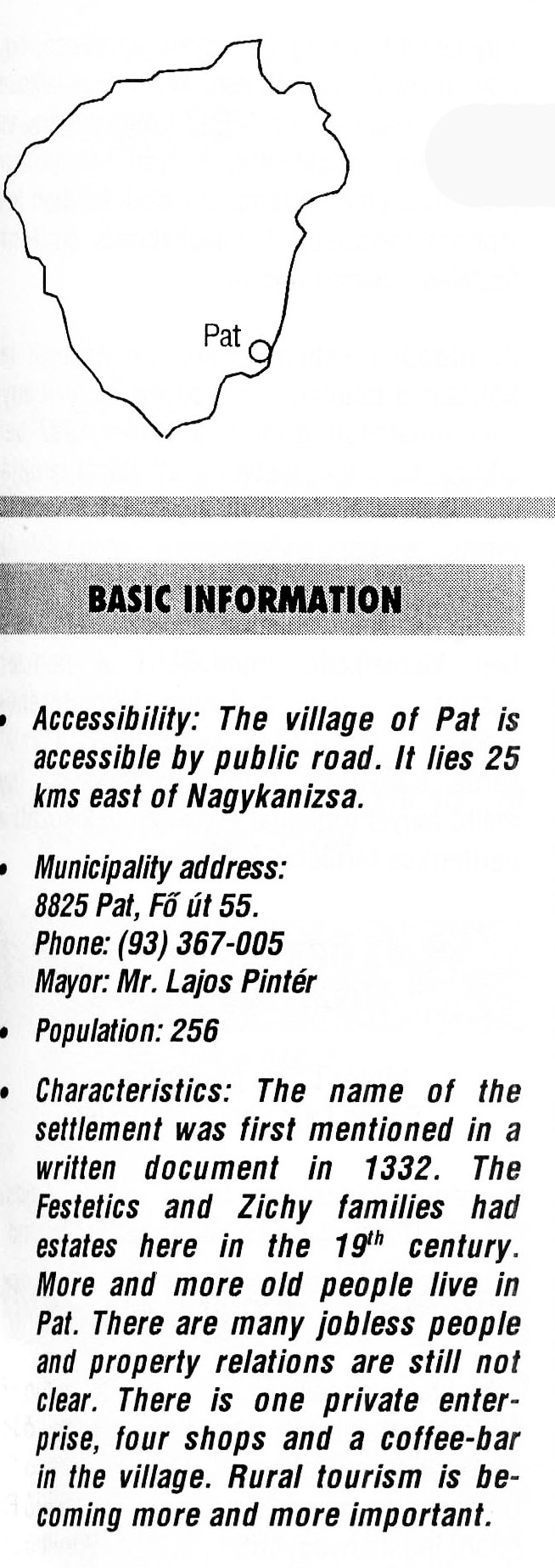 Nyilvános 2842 | 6524 | Pat | BASIC INFORMATION Accessibility: The village of Pat is accessible by public road. It lies 25 kms east of Nagykanizsa. Municipality address: 8825 Pat, Fő út 55. Phone: (93) 367-005 Mayor: Mr. Lajos Pintér Population: 256 Characteristics: The name of the settlement was first mentioned in a written document in 1332. The Festetics and Zichy families had estates here in the 19th century. More and more old people live in Pat. There are many jobless people and property relations are still not clear. There is one private enter¬prise, four shops and a coffee-bar in the village. Rural tourism is be¬coming more and more important. This text came from the following book: Title: Handbook of Zala county (Zala megye kézikönyve) Series: County handbooks of Hungary (Magyarország megyei kézikönyvei) Chief editor: Hóbor József Publisher: (Hatvan), CEBA-Hungary Ltd, 1998 ETO: 908.439.121(035) ; 050.8(439.121) ISBN: 963-9089-18-2 Pages: 488-1040 p. Remark: Closed on: 1998. márc. 31. |