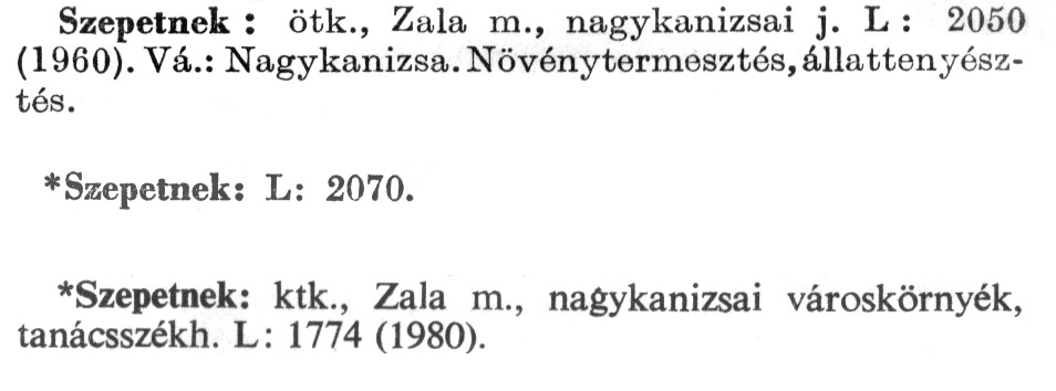 Nyilvános 2405 | 5990 | A szócikkek felismertetett szövege: | (Az első csillag után az 1972-es, a második csillag után az 1981-es kiadású kiegészítő kötetből származó szöveg következik) Szepetnek: ötk., Zala m., nagykanizsai j. L: 2050 (1960). Vá.: Nagykanizsa. Növénytermesztés, állattenyésztés. *Szepetnek: L: 2070. *Szepetnek: ktk., Zala m., nagykanizsai városkörnyék, tanácsszékh. L: 1774 (1980). A szócikkek a következő lexikonból származnak: Cím: Új magyar lexikon Közreműködő: Berei Andor (1900-1979) (szerk.) Szerz. közl.: [szerk. Berei Andor et al.] Kiadás jelzés: 2. lny. Kiadás: Budapest : Akad. K., 1961-1962 Kötetei: 1., A - C 2., D - F 3., G - J 4., K - Me 5., Mf - R 6., S - Z 7. köt., A-Z Kiegészítő kötet (1972) Kiegészítő kötet, 1962÷1980 (1981) ETO jelzet: 03=945.11 Szakjelzet: 030 Cutter: U 28 Nyelv: magyar Megjegyzés: Bibliogr. a címszavak egy részének végén |