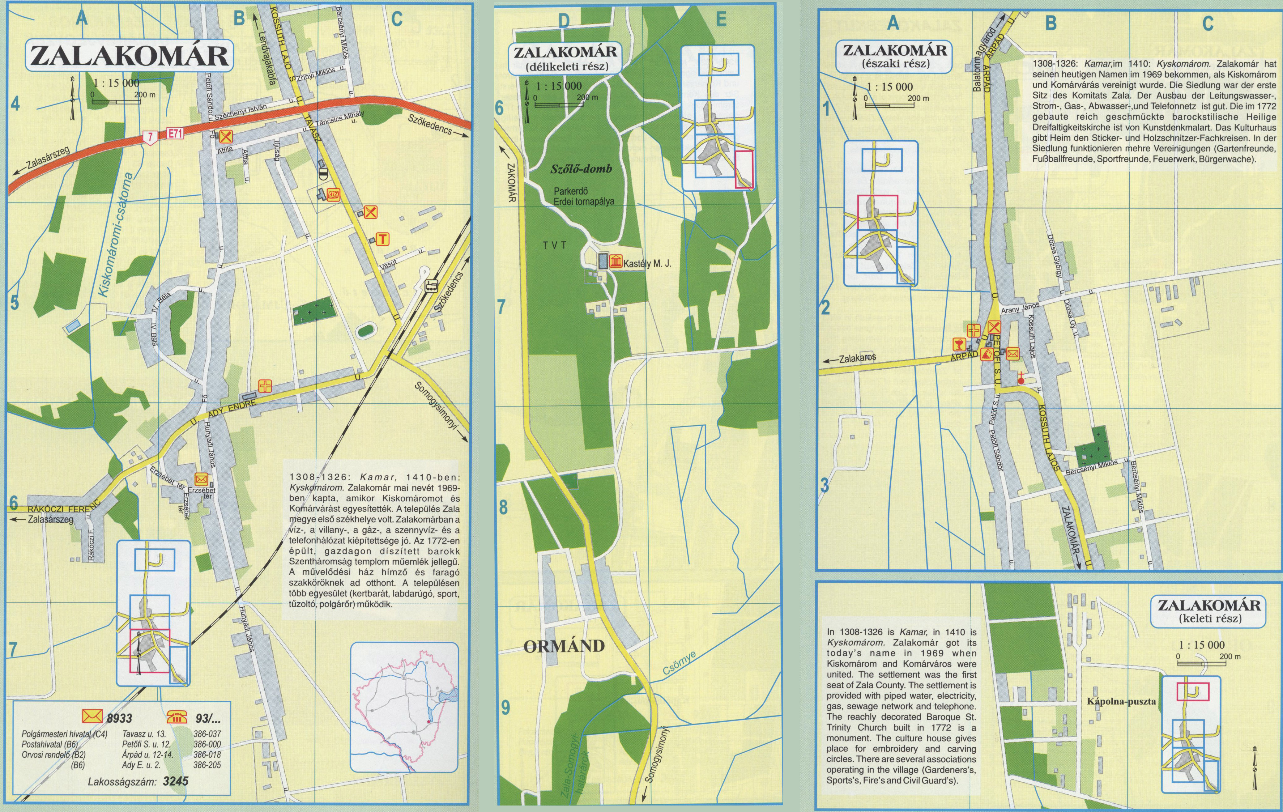 Nyilvános 2337 | 7258 | Zalakomár | 1308-1326: Kamar, 1410-ben: Kyskomárom. Zalakomár mai nevét 1969-ben kapta, amikor Kiskomáromot és Komárvárást egyesítették. A település Zala megye első székhelye volt. Zalakomárban a víz-, a villany-, a gáz-, a szennyvíz- és a telefonhálózat kiépítettsége jó. Az 1772-en épült, gazdagon díszített barokk Szentháromság templom műemlék jellegű. A művelődési ház hímző és faragó szakköröknek ad otthont. A településen több egyesület (kertbarát, labdarúgó, sport, tűzoltó, polgárőr) működik. 1308-1326: Kamar,im 1410: Kyskomárom. Zalakomár hat seinen heutigen Namen im 1969 bekommen, als Kiskomárom und Komárvárás vereinigt wurde. Die Siedlung war der erste Sitz des Komitats Zala. Der Ausbau der Leitungswasser-, Strom-, Gas-, Abwasser-,und Telefonnetz ist gut. Die im 1772 gebaute reich geschmückte barockstilische Heilige Dreifaltigkeitskirche ist von Kunstdenkmalart. Das Kulturhaus gibt Heim den Sticker- und Holzschnitzer-Fachkreisen. In der Siedlung funktionieren mehre Vereinigungen (Gartenfreunde, Fußballfreunde, Sportfreunde, Feuerwerk, Bürgerwache). In 1308-1326 is Kamar, in 1410 is Kyskomárom. Zalakomár got its today\'s name in 1969 when Kiskomárom and Komán/áros were united. The settlement was the first seat of Zala County. The settlement is provided with piped water, electricity, gas, sewage network and telephone. The reachly decorated Baroque St. Trinity Church built in 1772 is a monument. The culture house gives place for embroidery and carving circles. There are several associations operating in the village (Gardeners\'s, Sports\'s, Fire\'s and Civil Guard\'s). A részlet a következő kiadványból származik/Die Teile stammen vom volgenden Buch/This text came from the following book: Cím/Titel/Title: Zala megye településeinek atlasza - 257 település részletes térképe/Atlas der Komitat Zala - 257 Detailte Siedlungskarten/Zala county\'s Atlas - 257 settlement maps. Közreműködő/contributor: Lackner László (1943) (fotó) Kiadás/Ausgabe/Publisher: Gyula : HISZI-MAP, 1997 Sorozat/Serie/Series: Indulástól - megérkezésig... ETO: 912(439.121-2) ; 908.439.121 Cutter: Z 19 ISBN: 963-610-025-4 Oldalszám/Seiten/Pages: 323, 81 p. Megjegyzés/Note: Lezárva/Abgeschlossen am/Closed am: 1997. máj. 30. |