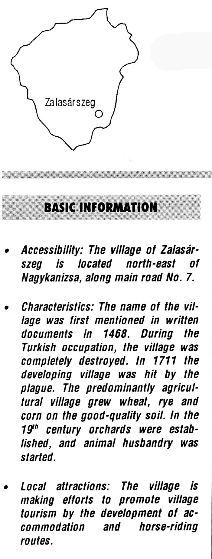 Nyilvános 2592 | 6328 | Zalasárszeg | BASIC INFORMATION Accessibility: The village of Zalasárszeg is located north-east of Nagykanizsa, along main road No. 7. Characteristics: The name of the village was first mentioned in written documents in 1468. During the Turkish occupation, the village was completely destroyed. In 1711 the developing village was hit by the plague. The predominantly agricultural village grew wheat, rye and corn on the good-quality soil. In the 19th century orchards were established, and animal husbandry was started. Local attractions: The village is making efforts to promote village tourism by the development of accommodation and horse-riding routes. This text came from the following book: Title: Handbook of Zala county (Zala megye kézikönyve) Series: County handbooks of Hungary (Magyarország megyei kézikönyvei) Chief editor: Hóbor József Publisher: (Hatvan), CEBA-Hungary Ltd, 1998 ETO: 908.439.121(035) ; 050.8(439.121) ISBN: 963-9089-18-2 Pages: 488-1040 p. Remark: Closed on: 1998. márc. 31. |