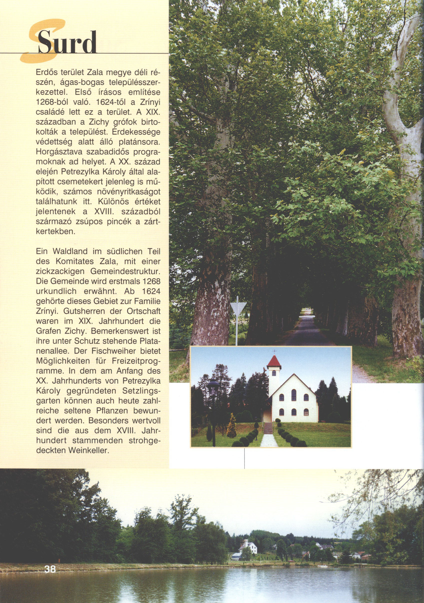 Nyilvános 2884 | 8487 | Surd | Ein Waldland im südlichen Teil des Komitates Zala, mit einer zickzackigen Gemeindestruktur. Die Gemeinde wird erstmals 1268 urkundlich erwähnt. Ab 1624 gehörte dieses Gebiet zur Familie Zrínyi. Gutsherren der Ortschaft waren im XIX. Jahrhundert die Grafen Zichy. Bemerkenswert ist ihre unter Schutz stehende Platanenallee. Der Fischweiher bietet Möglichkeiten für Freizeitprogramme. In dem am Anfang des XX. Jahrhunderts von Petrezylka Károly gegründeten Setzlingsgarten können auch heute zahlreiche seltene Pflanzen bewundert werden. Besonders wertvoll sind die aus dem XVIII. Jahrhundert stammenden strohgedeckten Weinkeller. Dieses Text stammt von: Titel: Hívogató a Régiók Kapujában - Útikönyv Látnivalók Nagykanizsán és Térségében (Einladend in dem Tor des Gebiets - Reisebuch - Sehenswürdigkeiten in Nagykanizsa und Umgebung) Herausgegeben von: Nagykanizsa és a Környező Települések Területfejlesztési Társulása (Verein für Gebietsentwicklung in Nagykanizsa und in ihrer Umgebung) 8800 Nagykanizsa, Petőfi Sándor út 5. Tel.: 06 93/536-453 • 06 93/536-454 Tel ./Fax: 06 93/326-323 E-mail: terstars@axelero.hu www.kanizsaterseg.celodin.hu |