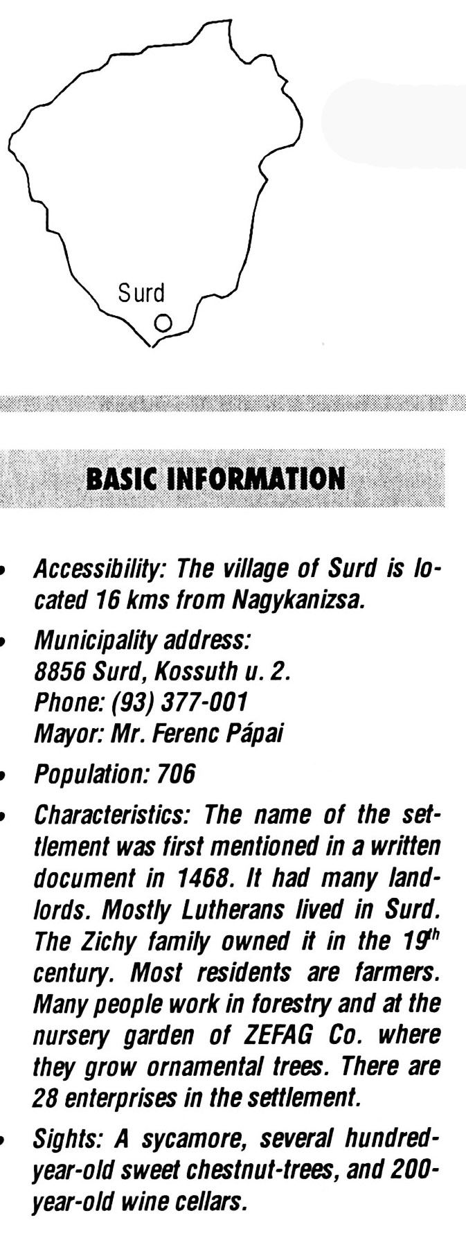 Nyilvános 2785 | 7033 | Rövid leírás | Teljes leírás (1.16 KB) | Surd BASIC INFORMATION Accessibility: The village of Surd is located 16 kms from Nagykanizsa. Municipality address: 8856 Surd, Kossuth u. 2. Phone: (93) 377-001 Mayor: Mr. Ferenc Pápai Population: 706 Characteristics: The name of the settlement was first mentioned in a written document in 1468. It had many landlords. Mostly Lutherans lived in Surd. The Zichy family owned it in the 19th century. Most residents are farmers. Many people work in forestry and at the nursery garden of ZEFAG Co. where they grow ornamental trees. There are 28 enterprises in the settlement. Sights: A sycamore, several hundred-year-old sweet chestnut-trees, and 200-year-old wine cellars. This text came from the following book: Title: Handbook of Zala county (Zala megye kézikönyve) Series: County handbooks of Hungary (Magyarország megyei kézikönyvei) Chief editor: Hóbor József Publisher: (Hatvan), CEBA-Hungary Ltd, 1998 ETO: 908.439.121(035) ; 050.8(439.121) ISBN: 963-9089-18-2 Pages: 488-1040 p. Remark: Closed on: 1998. márc. 31. |