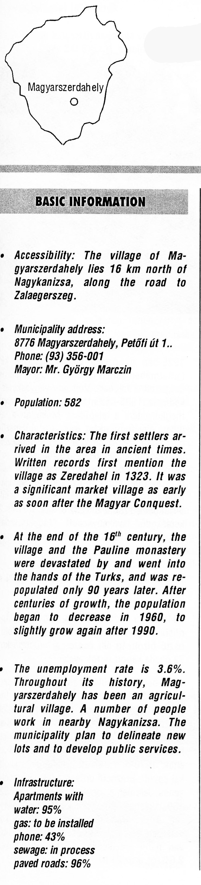 Nyilvános 2836 | 7246 | Magyarszerdahely | BASIC INFORMATION Accessibility: The village of Magyarszerdahely lies 16 km north of Nagykanizsa, along the road to Zalaegerszeg. Municipality address: 8776 Magyarszerdahely, Petőfi út 1. Phone: (93) 356-001 Mayor: Mr. György Marczin Population: 582 Characteristics: The first settlers arrived in the area in ancient times. Written records first mention the village as Zeredahel in 1323. It was a significant market village as early as soon after the Magyar Conquest. At the end of the 16th century, the village and the Pauline monastery were devastated by and went into the hands of the Turks, and was repopulated only 90 years later. After centuries of growth, the population began to decrease in 1960, to slightly grow again after 1990. The unemployment rate is 3.6%. Throughout its history, Magyarszerdahely has been an agricultural village. A number of people work in nearby Nagykanizsa. The municipality plan to delineate new lots and to develop public services. Infrastructure: Apartments with water: 95% gas: to be installed phone: 43% sewage: in process paved roads: 96% This text came from the following book: Title: Handbook of Zala county (Zala megye kézikönyve) Series: County handbooks of Hungary (Magyarország megyei kézikönyvei) Chief editor: Hóbor József Publisher: (Hatvan), CEBA-Hungary Ltd, 1998 ETO: 908.439.121(035) ; 050.8(439.121) ISBN: 963-9089-18-2 Pages: 488-1040 p. Remark: Closed on: 1998. márc. 31. |
