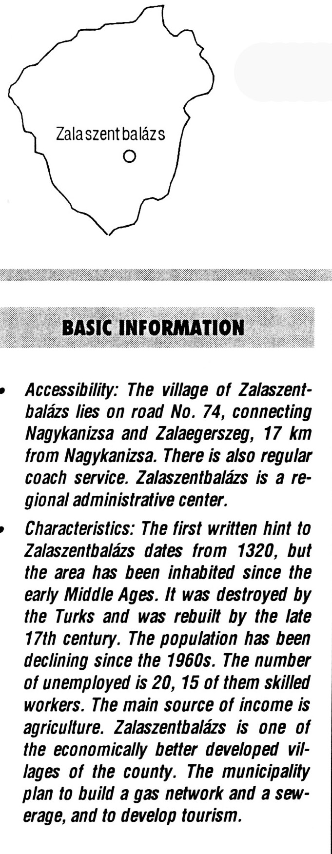 Nyilvános 2490 | 6506 | Zalaszentbalázs | BASIC INFORMATION Accessibility: The village of Zalaszentbalázs lies on road No. 74, connecting Nagykanizsa and Zalaegerszeg, 17 km from Nagykanizsa. There is also regular coach service. Zalaszentbalázs is a regional administrative center. Characteristics: The first written hint to Zalaszentbalázs dates from 1320, but the area has been inhabited since the early Middle Ages. It was destroyed by the Turks and was rebuilt by the late 17th century. The population has been declining since the 1960s. The number of unemployed is 20,15 of them skilled workers. The main source of income is agriculture. Zalaszentbalázs is one of the economically better developed villages of the county. The municipality plan to build a gas network and a sewerage, and to develop tourism. This text came from the following book: Title: Handbook of Zala county (Zala megye kézikönyve) Series: County handbooks of Hungary (Magyarország megyei kézikönyvei) Chief editor: Hóbor József Publisher: (Hatvan), CEBA-Hungary Ltd, 1998 ETO: 908.439.121(035) ; 050.8(439.121) ISBN: 963-9089-18-2 Pages: 488-1040 p. Remark: Closed on: 1998. márc. 31. |