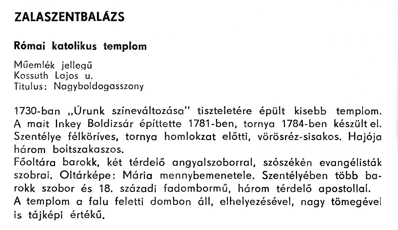 Nyilvános 2155 | 3913 | Zalaszentbalázs - Zala megye műemlékei 1979 122old | A részlet szövege: ZALASZENTBALÁZS Római katolikus templom Műemlék jellegű Kossuth Lajos u. Titulus: Nagyboldogasszony 1730-ban „Urunk színeváltozása" tiszteletére épült kisebb templom. A mait Inkey Boldizsár építtette 1781-ben, tornya 1784-ben készült el. Szentélye félköríves, tornya homlokzat előtti, vörösréz-sisakos. Hajója három boltszakaszos. Főoltára barokk, két térdelő angyalszoborral, szószékén evangélisták szobrai. Oltárképe: Mária mennybemenetele. Szentélyében több barokk szobor és 18. századi fadombormű, három térdelő apostollal. A templom a falu feletti dombon áll, elhelyezésével, nagy tömegével is tájképi értékű. A részlet a következő könyvből származik: Cím: Zala megye műemlékei Szerző: Németh József (1928) Közreműködő: Vándor László (szerk.) ; Szabóky Zsolt (1941) (fotó) Szerz. közl.: Németh József ; [szerk. Vándor László] ; [fotók... Szabóky Zsolt] Kiadás jelzés: 2. bőv. kiad. Kiadás: Zalaegerszeg : Zalai Ny., 1979 ETO jelzet: 72(439.121) ; 7.025.3/.4(439.121) ; 908.439.121 Tárgyszó: Zala Szakjelzet: 908 Cutter: N 53 Nyelv: magyar Oldalszám: 134 p. |