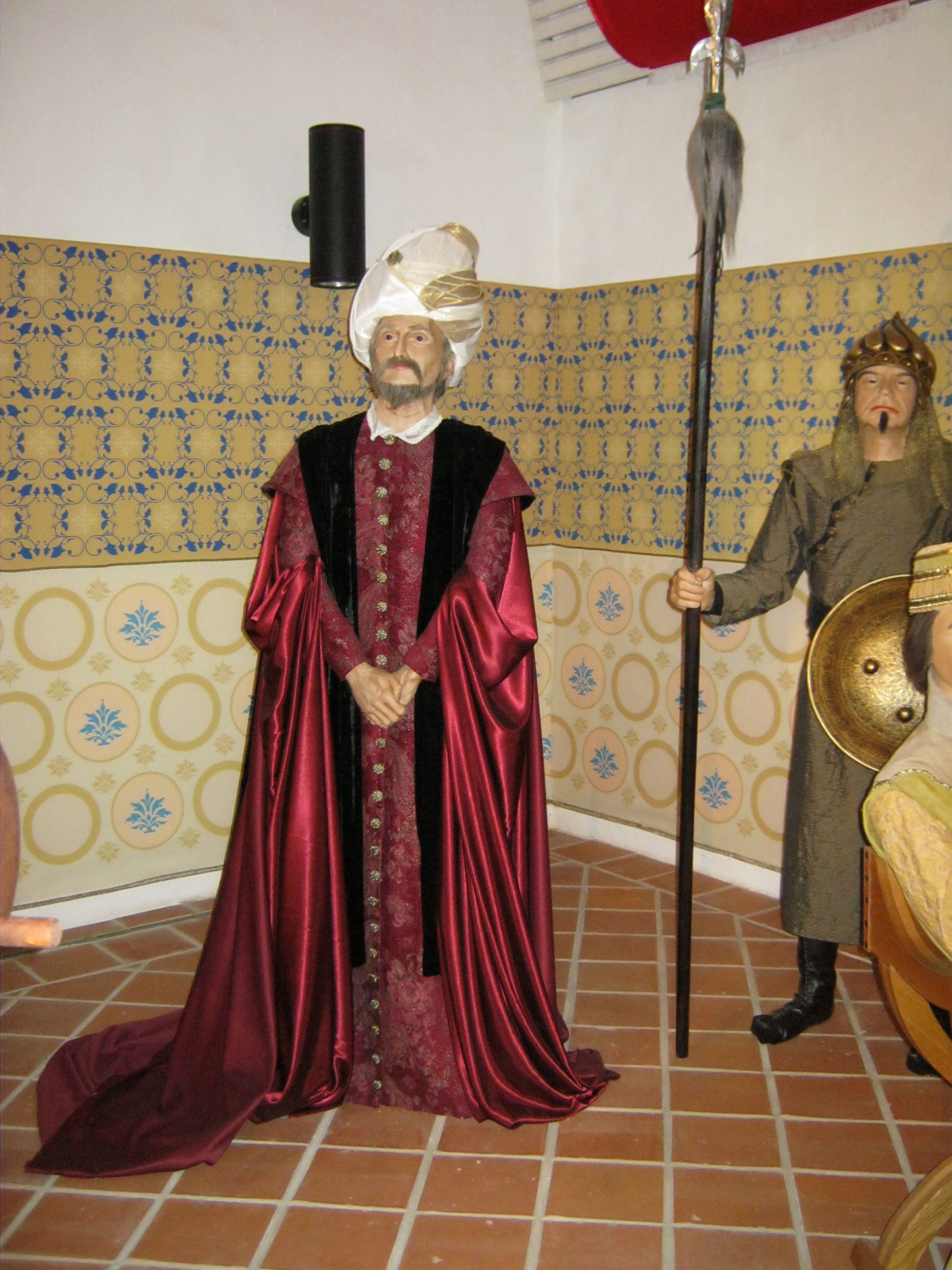 Nyilvános 1325 | 1636 | Nyírbátor, Vár utca 1. Báthori várkastély | A Báthoriak várkastélyának többször átalakított egyetlen megmaradt épületét a közelmúltban állították helyre. Pincéjében reneszánsz étterem látogatható, földszintjén és emeletén a Báthori Panoptikum 45 élethű és korhű viaszfigurában mutatja be érzékletesen a jeles nemesi család és Nyírbátor történetét. A figurák tervezője és készítője Megyeri János szobrászművész. A megtekintést olvasható és hallgatható kalauzolás kíséri. A kiállítást a kenyérmezei csata 530. évfordulóján, 2009.október 13-án adták át. Az 1479-ben a törökkel vívott csata egyik hőse Báthori István volt. A képen Szulejmán szultán viaszfigurája. Felh. irod.: Látnivalók Szabolcs-Szatmár-Bereg megyében. Miskolc, Well-PRess, 1999 www.bathorivarkastely.hu A fénykép 2010 augusztus elején készült. |