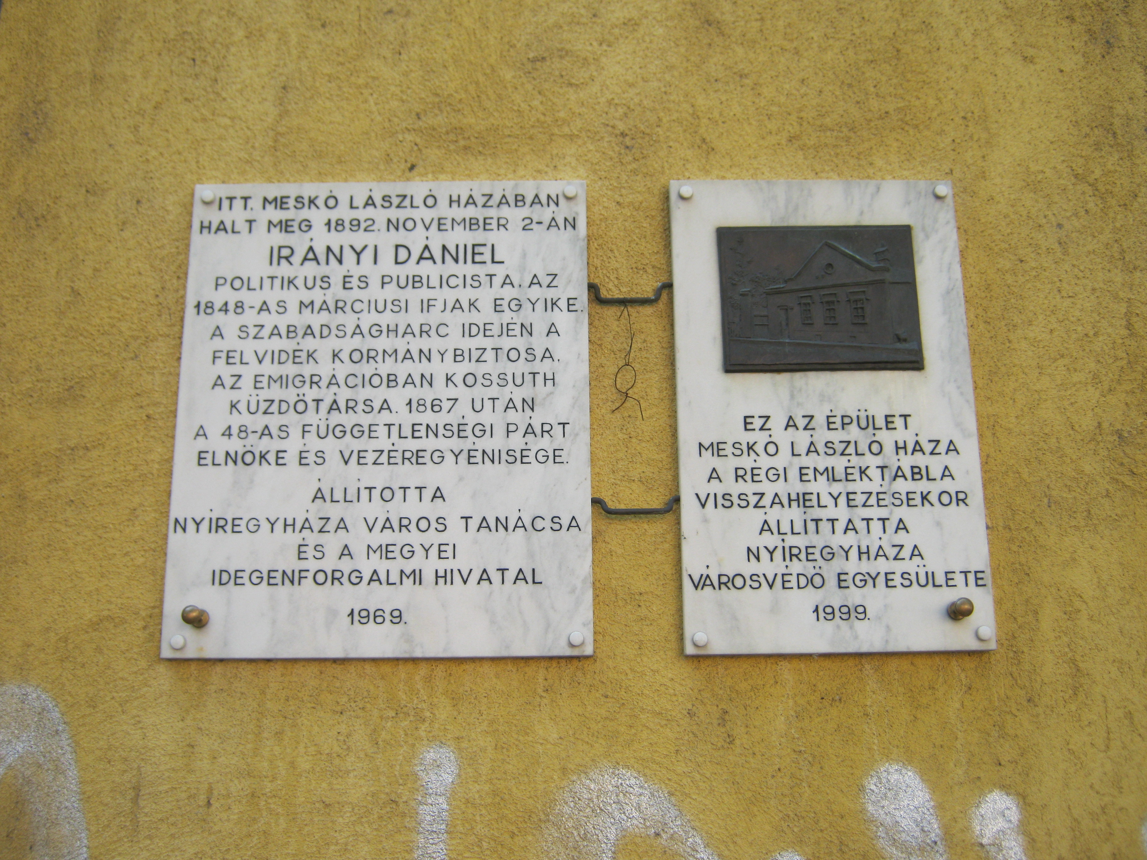 Nyilvános 945 | 1293 | Nyíregyháza, Dózsa György utca 14. | Az itt álló, valamikor 1969 után lebontott régi, ún. Meskó-házban hunyt el 1892. november 2-án Irányi Dániel politikus, publicista. Az eredeti házat jelölő emléktáblát utódán is elhelyezték egy kiegészítő táblával együtt, amelyen látható a Meskó-ház korabeli képe. A fénykép 2010 augusztus elején készült. |