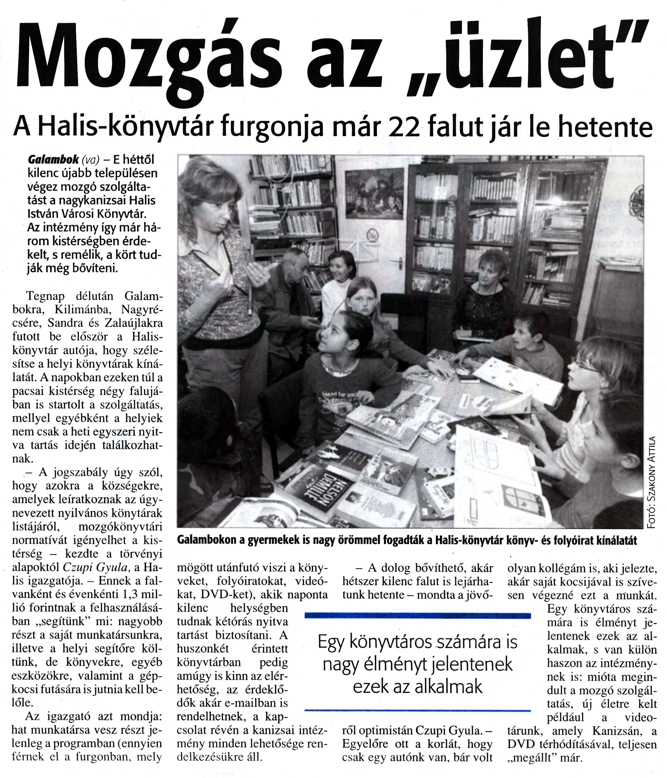Nyilvános 8413 | 16522 | Zalai Hírlap 2008. március 14. 4. oldal - Mozgás az üzlet | Mozgás az „üzlet" A Halis-könyvtár furgonja már 22 falut jár le hetente Galambok (va) - E héttől kilenc újabb településen végez mozgó szolgáltatást a nagykanizsai Halis István Városi Könyvtár. Az intézmény így már három kistérségben érdekelt, s remélik, a kört tudják még bővíteni. Tegnap délután Galambokra, Kilimánba, Nagyrécsére, Sandra és Zalaújlakra futott be először a Halis-könyvtár autója, hogy szélesítse a helyi könyvtárak kínálatát. A napokban ezeken túl a pacsai kistérség négy falujában is startolt a szolgáltatás, mellyel egyébként a helyiek nem csak a heti egyszeri nyitva tartás idején találkozhatnak. - A jogszabály úgy szól, hogy azokra a községekre, amelyek leiratkoznak az úgynevezett nyilvános könytárak listájáról, mozgókönyvtári normatívát igényelhet a kistérség — kezdte a törvényi alapoktól Czupi Gyula, a Halis igazgatója. - Ennek a falvanként és évenkénti 1,3 millió forintnak a felhasználásában „segítünk" mi: nagyobb részt a saját munkatársunkra, illetve a helyi segítőre költünk, de könyvekre, egyéb eszközökre, valamint a gépkocsi futására is jutnia kell belőle. Az igazgató azt mondja: hat munkatársa vesz részt jelenleg a programban (ennyien férnek el a furgonban, mely mögött utánfutó viszi a könyveket, folyóiratokat, videókat, DVD-ket), akik naponta kilenc helységben tudnak kétórás nyitva tartást biztosítani. A huszonkét érintett könyvtárban pedig amúgy is kinn az elérhetőség, az érdeklődők akár e-mailban is rendelhetnek, a kapcsolat révén a kanizsai intézmény minden lehetősége rendelkezésükre áll. - A dolog bővíthető, akár hétszer kilenc falut is lejárhatunk hetente - mondta a jövőről optimistán Czupi Gyula. - Egyelőre ott a korlát, hogy csak egy autónk van, bár volt olyan kollégám is, aki jelezte, akár saját kocsijával is szívesen végezné ezt a munkát. Egy könyvtáros számára is élményt jelentenek ezek az alkalmak, s van külön haszon az intézménynek is: mióta megindult a mozgó szolgáltatás, új életre kelt például a video-tárunk, amely Kanizsán, a DVD térhódításával, teljesen „megállt" már. |