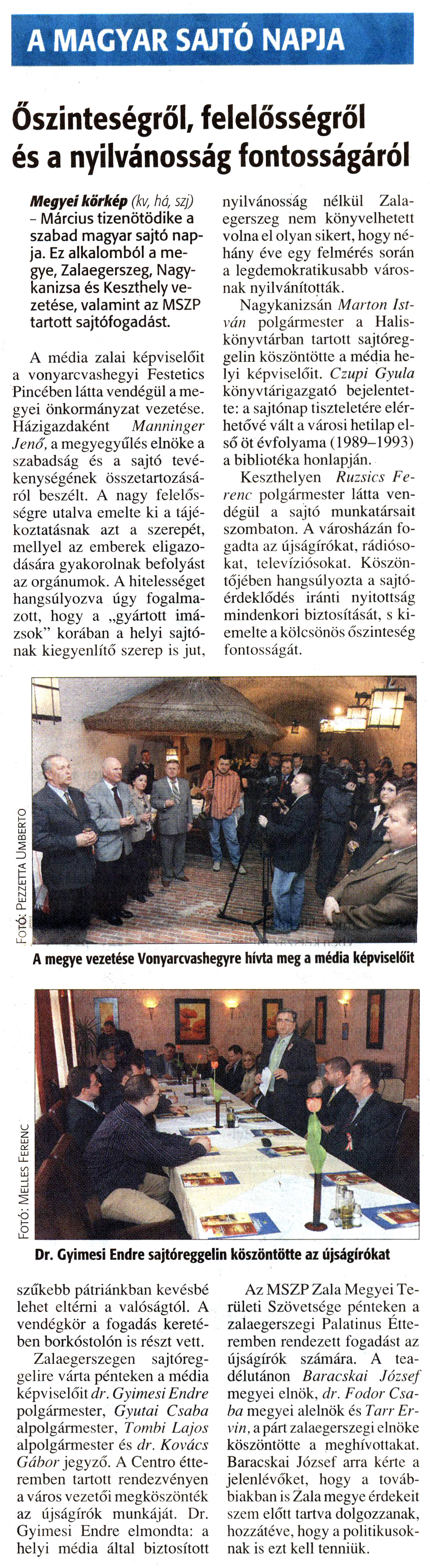 Nyilvános 1622 | 3035 | Zalai Hírlap 2008. március 17. 64. szám 4. oldal - A Magyar Sajtó Napja | A cikkben említett "városi hetilap első öt évfolyama (1989-1993)" a Kanizsa - Dél-Zalai Hetilap első öt évfolyamát jelenti. Elérhető a következő link mögött: http://www.nagykar.hu/ekonyvek/451.html Ugyanitt válik elérhetővé a lap minden további digitalizált példánya. Az eseményről, melyről a Zalai Hírlap tudósít, további képek találhatók a következő link mögött: http://www.nagykar.hu/keptar/2907.html A MAGYAR SAJTÓ NAPJA Őszinteségről, felelősségről és a nyilvánosság fontosságáról Megyei körkép (kvr há, szj) - Március tizenötödike a szabad magyar sajtó napja. Ez alkalomból a megye, Zalaegerszeg, Nagykanizsa és Keszthely vezetése, valamint az MSZP tartott sajtófogadást. A média zalai képviselőit a vonyarcvashegyi Festetics Pincében látta vendégül a megyei önkormányzat vezetése. Házigazdaként Manninger Jenő, a megyegyűlés elnöke a szabadság és a sajtó tevékenységének összetartozásáról beszélt. A nagy felelősségre utalva emelte ki a tájékoztatásnak azt a szerepét, mellyel az emberek eligazodására gyakorolnak befolyást az orgánumok. A hitelességet hangsúlyozva úgy fogalmazott, hogy a „gyártott imázsok" korában a helyi sajtónak kiegyenlítő szerep is jut, szűkebb pátriánkban kevésbé lehet eltérni a valóságtól. A vendégkör a fogadás keretében borkóstolón is részt vett. Zalaegerszegen sajtóreggelire várta pénteken a média képviselőit dr. Gyimesi Endre polgármester, Gyutai Csaba alpolgármester, Tombi Lajos alpolgármester és dr. Kovács Gábor jegyző. A Centro étteremben tartott rendezvényen a város vezetői megköszönték az újságírók munkáját. Dr. Gyimesi Endre elmondta: a helyi média által biztosított nyilvánosság nélkül Zalaegerszeg nem könyvelhetett volna el olyan sikert, hogy néhány éve egy felmérés során a legdemokratikusabb városnak nyilvánították. Nagykanizsán Marton István polgármester a Halis-könyvtárban tartott sajtóreggelin köszöntötte a média helyi képviselőit. Czupi Gyula könyvtárigazgató bejelentette: a sajtónap tiszteletére elérhetővé vált a városi hetilap első öt évfolyama (1989-1993) a bibliotéka honlapján. Keszthelyen Ruzsics Ferenc polgármester látta vendégül a sajtó munkatársait szombaton. A városházán fogadta az újságírókat, rádiósokat, televíziósokat. Köszöntőjében hangsúlyozta a sajtóérdeklődés iránti nyitottság mindenkori biztosítását, s kiemelte a kölcsönös őszinteség fontosságát. Az MSZP Zala Megyei Területi Szövetsége pénteken a zalaegerszegi Palatínus Étteremben rendezett fogadást az újságírók számára. A teadélutánon Baracskai József megyei elnök, dr. Fodor Csaba megyei alelnök és Tarr Er-vin, a párt zalaegerszegi elnöke köszöntötte a meghívottakat. Baracskai József arra kérte a jelenlévőket, hogy a továbbiakban is Zala megye érdekeit szem előtt tartva dolgozzanak, hozzátéve, hogy a politikusoknak is ezt kell tenniük. |
