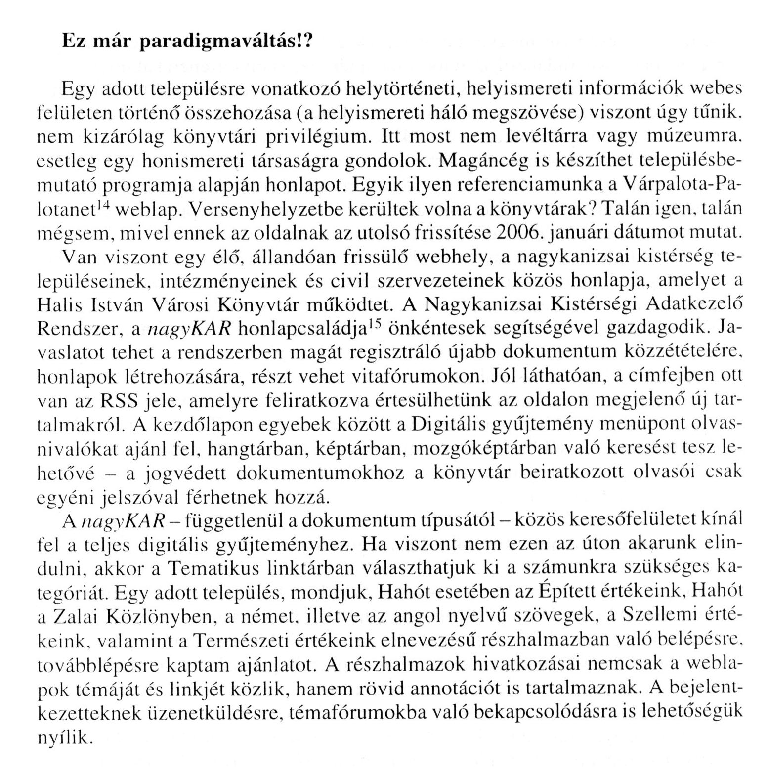 Nyilvános 1526 | 2901 | Könyv, Könyvtár, Könyvtáros 2008. október 24. oldal - Kégli Ferenc: Egy helyismeret-kutató barangolása Wégtelen Web Wilágban - részlet - 024. oldal | Cím: Könyv, Könyvtár, Könyvtáros Egyéb címadat; közreműködő: / Az Informatikai és Könyvtári Szövetség, a Magyar Könyvtárosok Egyesülete, a Nemzeti Kulturális Örökség Minisztériuma, az Országos Széchényi Könyvtár ; szerk. biz. elnök: Biczák Péter Budapest : Országos Széchényi Könyvtár Évek: 1951- Periodicitás: havonként ISSN: ISSN 1216-6804 A cikk szövege: Ez már paradigmaváltás!? Egy adott településre vonatkozó helytörténeti, helyismereti információk webes felületen történő összehozása (a helyismereti háló megszövése) viszont úgy tűnik, nem kizárólag könyvtári privilégium. Itt most nem levéltárra vagy múzeumra, esetleg egy honismereti társaságra gondolok. Magáncég is készíthet településbe-mutató programja alapján honlapot. Egyik ilyen referenciamunka a Várpalota-Pa-lotanet14 weblap. Versenyhelyzetbe kerültek volna a könyvtárak? Talán igen. talán mégsem, mivel ennek az oldalnak az utolsó frissítése 2006. januári dátumot mutat. Van viszont egy élő, állandóan frissülő webhely, a nagykanizsai kistérség településeinek, intézményeinek és civil szervezeteinek közös honlapja, amelyet a Halis István Városi Könyvtár működtet. A Nagykanizsai Kistérségi Adatkezelő Rendszer, a nagyKAR honlapcsaládja15 önkéntesek segítségével gazdagodik. Javaslatot tehet a rendszerben magát regisztráló újabb dokumentum közzétételére, honlapok létrehozására, részt vehet vitafórumokon. Jól láthatóan, a címfejben ott van az RSS jele, amelyre feliratkozva értesülhetünk az oldalon megjelenő új tartalmakról. A kezdőlapon egyebek között a Digitális gyűjtemény menüpont olvasnivalókat ajánl fel, hangtárban, képtárban, mozgóképtárban való keresést tesz lehetővé - a jogvédett dokumentumokhoz a könyvtár beiratkozott olvasói csak egyéni jelszóval férhetnek hozzá. A nagyKAR - függetlenül a dokumentum típusától - közös keresőfelületet kínál fel a teljes digitális gyűjteményhez. Ha viszont nem ezen az úton akarunk elindulni, akkor a Tematikus linktárban választhatjuk ki a számunkra szükséges kategóriát. Egy adott település, mondjuk. Hahót esetében az Épített értékeink, Hahót a Zalai Közlönyben, a német, illetve az angol nyelvű szövegek, a Szellemi értékeink, valamint a Természeti értékeink elnevezésű részhalmazban való belépésre, továbblépésre kaptam ajánlatot. A részhalmazok hivatkozásai nemcsak a weblapok témáját és linkjét közlik, hanem rövid annotációt is tartalmaznak. A bejelentkezetteknek üzenetküldésre, témafórumokba való bekapcsolódásra is lehetőségük nyílik. |