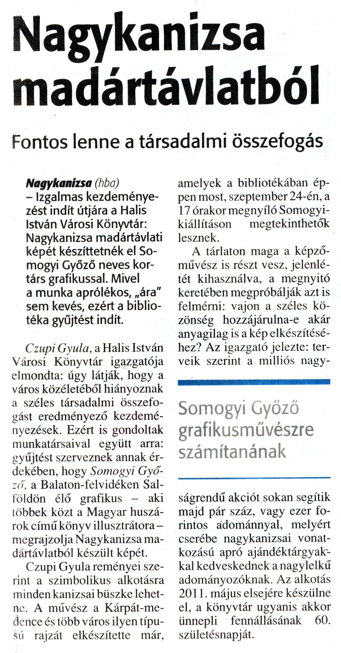 Nyilvános 1497 | 1746 | Zalai Hírlap 2009. szeptember 15. 216. szám 7. oldal - Nagykanizsa madártávlatból | A cikk szövege: Nagykanizsa madártávlatból Fontos lenne a társadalmi összefogás Somogyi Győző grafikusművészre számítanának Nagykanizsa (hba) - Izgalmas kezdeményezést indít útjára a Halis István Városi Könyvtár: Nagykanizsa madártávlati képét készíttetnék el Somogyi Győző neves kortárs grafikussal. Mivel a munka aprólékos, „ára" sem kevés, ezért a bibliotéka gyűjtést indít. Czupi Gyula, a Halis István Városi Könyvtár igazgatója elmondta: úgy látják, hogy a város közéletéből hiányoznak a széles társadalmi összefogást eredményező kezdeményezések. Ezért is gondoltak munkatársaival együtt arra: gyűjtést szerveznek annak érdekében, hogy Somogyi Győző, a Balaton-felvidéken Salföldön élő grafikus - aki többek közt a Magyar huszárok című könyv illusztrátora - megrajzolja Nagykanizsa madártávlatból készült képét. Czupi Gyula reményei szerint a szimbolikus alkotásra minden kanizsai büszke lehetne. A művész a Kárpát-medence és több város ilyen típusú rajzát elkészítette már, amelyek a bibliotékában éppen most, szeptember 24-én, a 17 órakor megnyíló Somogyikiállításon megtekinthetők lesznek. A tárlaton maga a képzőművész is részt vesz, jelenlétét kihasználva, a megnyitó keretében megpróbálják azt is felmérni: vajon a széles közönség hozzájárulna-e akár anyagilag is a kép elkészítéséhez? Az igazgató jelezte: terveik szerint a milliós nagyságrendű akciót sokan segítik majd pár száz, vagy ezer forintos adománnyal, melyért cserébe nagykanizsai vonatkozású apró ajándéktárgyakkal kedveskednek a nagylelkű adományozóknak. Az alkotás 2011. május elsejére készülne el, a könyvtár ugyanis akkor ünnepli fennállásának 60. születésnapját. |
