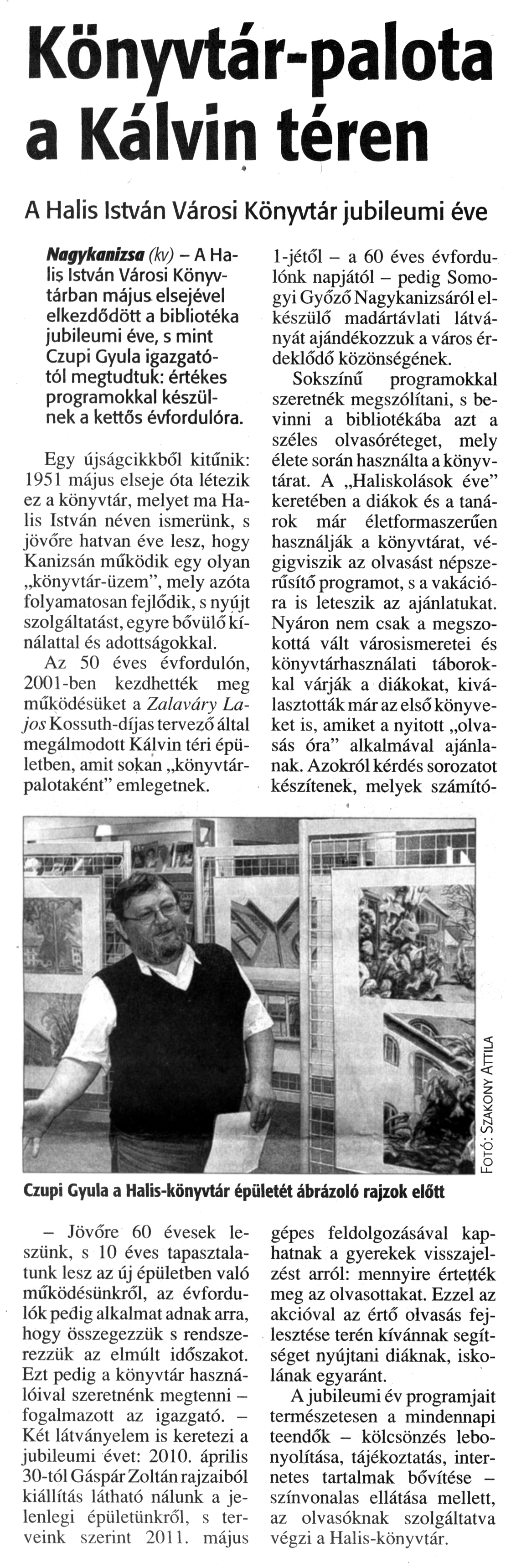 Nyilvános 1478 | 2124 | Zalai Hírlap 2010. május 10. 107. szám 7. oldal - Könyvtár-palota a Kálvin téren | A cikk szövege: Könyvtár-palota a Kálvin téren A Halis István Városi Könyvtár jubileumi éve Nagykanizsa (kv) - A Halis István Városi Könyvtárban május elsejével elkezdődött a bibliotéka jubileumi éve, s mint Czupi Gyula igazgatótól megtudtuk: értékes programokkal készülnek a kettős évfordulóra. Egy újságcikkből kitűnik: 1951 május elseje óta létezik ez a könyvtár, melyet ma Halis István néven ismerünk, s jövőre hatvan éve lesz, hogy Kanizsán működik egy olyan „könyvtár-üzem”, mely azóta folyamatosan fejlődik, s nyújt szolgáltatást, egyre bővülő kínálattal és adottságokkal. Az 50 éves évfordulón, 2001-ben kezdhették meg működésüket a Zalaváry Lajos Kossuth-díjas tervező által megálmodott Kálvin téri épületben, amit sokan „könyvtárpalotaként" emlegetnek. - Jövőre 60 évesek leszünk, s 10 éves tapasztalatunk lesz az új épületben való működésünkről, az évfordulók pedig alkalmat adnak arra, hogy összegezzük s rendszerezzük az elmúlt időszakot. Ezt pedig a könyvtár használóival szeretnénk megtenni -fogalmazott az igazgató. -Két látványelem is keretezi a jubileumi évet: 2010. április 30-tól Gáspár Zoltán rajzaiból kiállítás látható nálunk a jelenlegi épületünkről, s terveink szerint 2011. május 1-jétől - a 60 éves évfordulónk napjától - pedig Somogyi Győző Nagykanizsáról elkészülő madártávlati látványát ajándékozzuk a város érdeklődő közönségének. Sokszínű programokkal szeretnék megszólítani, s bevinni a bibliotékába azt a széles olvasóréteget, mely élete során használta a könyvtárat. A „Haliskolások éve” keretében a diákok és a tanárok már életformaszerűen használják a könyvtárat, végigviszik az olvasást népszerűsítő programot, s a vakációra is leteszik az ajánlatukat. Nyáron nem csak a megszokottá vált városismeretei és könyvtárhasználati táborokkal várják a diákokat, kiválasztották már az első könyveket is, amiket a nyitott „olvasás óra" alkalmával ajánlanak. Azokról kérdés sorozatot készítenek, melyek számítógépes feldolgozásával kaphatnak a gyerekek visszajelzést arról: mennyire értették meg az olvasottakat. Ezzel az akcióval az értő olvasás fejlesztése terén kívánnak segítséget nyújtani diáknak, iskolának egyaránt. A jubileumi év programjait természetesen a mindennapi teendők - kölcsönzés lebonyolítása, tájékoztatás, internetes tartalmak bővítése -színvonalas ellátása mellett, az olvasóknak szolgáltatva végzi a Halis-könyvtár. Czupi Gyula a Halis-könyvtár épületét ábrázoló rajzok előtt |