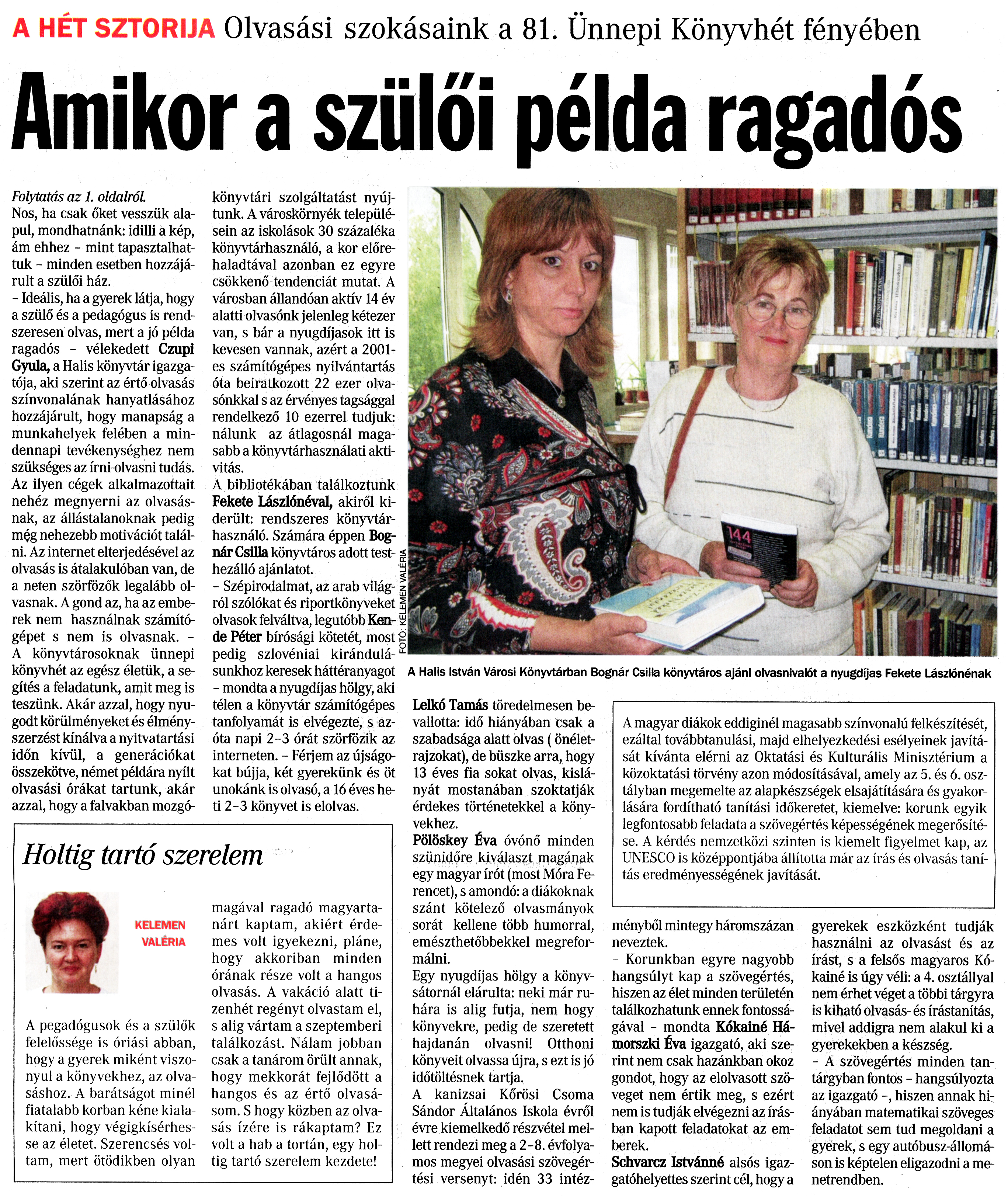 Nyilvános 1508 | 1888 | Vasárnapi Zalai Hírlap 2010. június 6. 22. szám 3. oldal - Amikor a szülői példa ragadós | A cikk szövege: A HÉT SZTORIJA Olvasási szokásaink a 81. Ünnepi Könyvhét fényében Amikor a szülői példa ragadós Folytatás az 1. oldalról Nos, ha csak őket vesszük alapul, mondhatnánk: idilli a kép, ám ehhez - mint tapasztalhattuk - minden esetben hozzájárult a szülői ház. - Ideális, ha a gyerek látja, hogy a szülő és a pedagógus is rendszeresen olvas, mert a jó példa ragadós - vélekedett Czupi Gyula, a Halis könyvtár igazgatója, aki szerint az értő olvasás színvonalának hanyatlásához hozzájárult, hogy manapság a munkahelyek felében a mindennapi tevékenységhez nem szükséges az írni-olvasni tudás. Az ilyen cégek alkalmazottait nehéz megnyerni az olvasásnak, az állástalanoknak pedig még nehezebb motivációt találni. Az internet elterjedésével az olvasás is átalakulóban van, de a neten szörfözők legalább olvasnak. A gond az, ha az emberek nem használnak számítógépet s nem is olvasnak. -A könyvtárosoknak ünnepi könyvhét az egész életük, a segítés a feladatunk, amit meg is teszünk. Akár azzal, hogy nyugodt körülményeket és élményszerzést kínálva a nyitvatartási időn kívül, a generációkat összekötve, német példára nyílt olvasási órákat tartunk, akár azzal, hogy a falvakban mozgókönyvtári szolgáltatást nyújtunk. A városkörnyék településein az iskolások 30 százaléka könyvtárhasználó, a kor előrehaladtával azonban ez egyre csökkenő tendenciát mutat. A városban állandóan aktív 14 év alatti olvasónk jelenleg kétezer van, s bár a nyugdíjasok itt is kevesen vannak, azért a 2001-es számítógépes nyilvántartás óta beiratkozott 22 ezer olvasónkkal s az érvényes tagsággal rendelkező 10 ezerrel tudjuk: nálunk az átlagosnál magasabb a könyvtárhasználati aktivitás. A bibliotékában találkoztunk Fekete Lászlónéval, akiről kiderült: rendszeres könyvtárhasználó. Számára éppen Bognár Csilla könyvtáros adott testhezálló ajánlatot. - Szépirodalmat, az arab világról szólókat és riportkönyveket olvasok felváltva, legutóbb Kende Péter bírósági kötetét, most pedig szlovéniai kirándulásunkhoz keresek háttéranyagot - mondta a nyugdíjas hölgy, aki télen a könyvtár számítógépes tanfolyamát is elvégezte, s azóta napi 2-3 órát szörfözik az interneten. - Férjem az újságokat bújja, két gyerekünk és öt unokánk is olvasó, a 16 éves heti 2-3 könyvet is elolvas. Lelkó Tamás töredelmesen bevallotta: idő hiányában csak a szabadsága alatt olvas (önéletrajzokat), de büszke arra, hogy 13 éves fia sokat olvas, kislányát mostanában szoktatják érdekes történetekkel a könyvekhez. Pölöskey Éva óvónő minden szünidőre kiválaszt magának egy magyar írót (most Móra Ferencet), s amondó: a diákoknak szánt kötelező olvasmányok sorát kellene több humorral, emészthetőbbekkel megreformálni. Egy nyugdíjas hölgy a könyvsátornál elárulta: neki már ruhára is alig futja, nem hogy könyvekre, pedig de szeretett hajdanán olvasni! Otthoni könyveit olvassa újra, s ezt is jó időtöltésnek tartja. A kanizsai Körösi Csoma Sándor Általános Iskola évről évre kiemelkedő részvétel mellett rendezi meg a 2-8. évfolyamos megyei olvasási szövegértési versenyt: idén 33 intézményből mintegy háromszázan neveztek. - Korunkban egyre nagyobb hangsúlyt kap a szövegértés, hiszen az élet minden területén találkozhatunk ennek fontosságával - mondta Kókainé Hámorszki Éva igazgató, aki szerint nem csak hazánkban okoz gondot, hogy az elolvasott szöveget nem értik meg, s ezért nem is tudják elvégezni az írásban kapott feladatokat az emberek. Schvarcz Istvánné alsós igazgatóhelyettes szerint cél, hogy a gyerekek eszközként tudják használni az olvasást és az írást, s a felsős magyaros Kókainé is úgy véli: a 4. osztállyal nem érhet véget a többi tárgyra is kiható olvasás- és írástanítás, mivel addigra nem alakul ki a gyerekekben a készség. - A szövegértés minden tantárgyban fontos - hangsúlyozta az igazgató -, hiszen annak hiányában matematikai szöveges feladatot sem tud megoldani a gyerek, s egy autóbusz-állomáson is képtelen eligazodni a menetrendben. A Halis István Városi Könyvtárban Bognár Csilla könyvtáros ajánl olvasnivalót a nyugdíjas Fekete Lászlónénak A magyar diákok eddiginél magasabb színvonalú felkészítését, ezáltal továbbtanulási, majd elhelyezkedési esélyeinek javítását kívánta elérni az Oktatási és Kulturális Minisztérium a közoktatási törvény azon módosításával, amely az 5. és 6. osztályban megemelte az alapkészségek elsajátítására és gyakorlására fordítható tanítási időkeretet, kiemelve: korunk egyik legfontosabb feladata a szövegértés képességének megerősítése. A kérdés nemzetközi szinten is kiemelt figyelmet kap, az UNESCO is középpontjába állította már az írás és olvasás tanítás eredményességének javítását. Holtig tartó szerelem KELEMEN VALÉRIA A pegadógusok és a szülők felelőssége is óriási abban, hogy a gyerek miként viszonyul a könyvekhez, az olvasáshoz. A barátságot minél fiatalabb korban kéne kialakítani, hogy végigkísérhesse az életet. Szerencsés voltam, mert ötödikben olyan magával ragadó magyartanárt kaptam, akiért érdemes volt igyekezni, pláne, hogy akkoriban minden órának része volt a hangos olvasás. A vakáció alatt tizenhét regényt olvastam el, s alig vártam a szeptemberi találkozást. Nálam jobban csak a tanárom örült annak, hogy mekkorát fejlődött a hangos és az értő olvasásom. S hogy közben az olvasás ízére is rákaptam? Ez volt a hab a tortán, egy holtig tartó szerelem kezdete! |