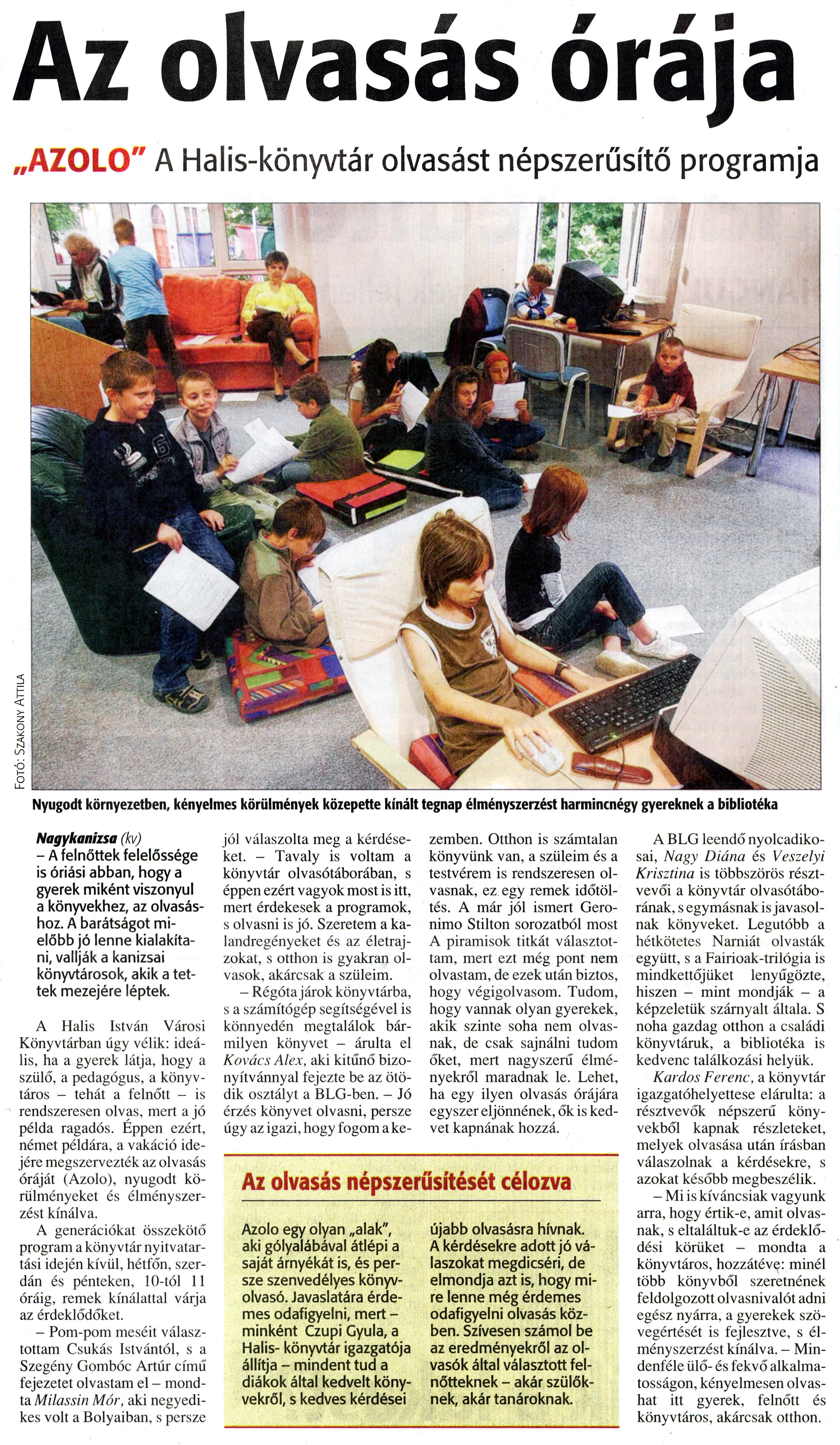 Nyilvános 1769 | 2551 | Zalai Hírlap 2010. június 22. 143. szám 11. oldal - Az olvasás órája | A cikk szövege: Az olvasás órája „AZOLO" A Halis-könyvtár olvasást népszerűsítő programja Nyugodt környezetben, kényelmes körülmények közepette kínált tegnap élményszerzést harmincnégy gyereknek a bibliotéka Nagykanizsa (kv) - A felnőttek felelőssége is óriási abban, hogy a gyerek miként viszonyul a könyvekhez, az olvasáshoz. A barátságot mielőbb jó lenne kialakítani, vallják a kanizsai könyvtárosok, akik a tettek mezejére léptek. A Halis István Városi Könyvtárban úgy vélik: ideális, ha a gyerek látja, hogy a szülő, a pedagógus, a könyvtáros - tehát a felnőtt - is rendszeresen olvas, mert a jó példa ragadós. Éppen ezért, német példára, a vakáció idejére megszervezték az olvasás óráját (Azolo), nyugodt körülményeket és élményszerzést kínálva. A generációkat összekötő program a könyvtár nyitvatartási idején kívül, hétfőn, szerdán és pénteken, 10-tól 11 óráig, remek kínálattal várja az érdeklődőket. - Pom-pom meséit választottam Csukás Istvántól, s a Szegény Gombóc Artúr című fejezetet olvastam el - mondta Milassin Mór, aki negyedikes volt a Bolyaiban, s persze jól válaszolta meg a kérdéseket. - Tavaly is voltam a könyvtár olvasótáborában, s éppen ezért vagyok most is itt, mert érdekesek a programok, s olvasni is jó. Szeretem a kalandregényeket és az életrajzokat, s otthon is gyakran olvasok, akárcsak a szüleim. - Régóta járok könyvtárba, s a számítógép segítségével is könnyedén megtalálok bármilyen könyvet - árulta el Kovács Alex, aki kitűnő bizonyítvánnyal fejezte be az ötödik osztályt a BLG-ben. - Jó érzés könyvet olvasni, persze úgy az igazi, hogy fogom a kezemben. Otthon is számtalan könyvünk van, a szüleim és a testvérem is rendszeresen olvasnak, ez egy remek időtöltés. A már jól ismert Geronimo Stilton sorozatból most A piramisok titkát választottam, mert ezt még pont nem olvastam, de ezek után biztos, hogy végigolvasom. Tudom, hogy vannak olyan gyerekek, akik szinte soha nem olvasnak, de csak sajnálni tudom őket, mert nagyszerű élményekről maradnak le. Lehet, ha egy ilyen olvasás órájára egyszer eljönnének, ők is kedvet kapnának hozzá. A BLG leendő nyolcadikosai, Nagy Diána és Veszelyi Krisztina is többszörös résztvevői a könyvtár olvasótáborának, s egymásnak is javasolnak könyveket. Legutóbb a hétkötetes Narniát olvasták együtt, s a Fairioak-trilógia is mindkettőjüket lenyűgözte, hiszen - mint mondják - a képzeletük szárnyalt általa. S noha gazdag otthon a családi könyvtáruk, a bibliotéka is kedvenc találkozási helyük. Kardos Ferenc, a könyvtár igazgatóhelyettese elárulta: a résztvevők népszerű könyvekből kapnak részleteket, melyek olvasása után írásban válaszolnak a kérdésekre, s azokat később megbeszélik. - Mi is kíváncsiak vagyunk arra, hogy értik-e, amit olvasnak, s eltaláltuk-e az érdeklődési körüket - mondta a könyvtáros, hozzátéve: minél több könyvből szeretnének feldolgozott olvasnivalót adni egész nyárra, a gyerekek szövegértését is fejlesztve, s élményszerzést kínálva. - Mindenféle ülő- és fekvő alkalmatosságon, kényelmesen olvashat itt gyerek, felnőtt és könyvtáros, akárcsak otthon. Az olvasás népszerűsítését célozva Azolo egy olyan „alak", aki gólyalábával átlépi a saját árnyékát is, és persze szenvedélyes könyvolvasó. Javaslatára érdemes odafigyelni, mert -minként Czupi Gyula, a Halis- könyvtár igazgatója állítja - mindent tud a diákok által kedvelt könyvekről, s kedves kérdései újabb olvasásra hívnak. A kérdésekre adott jó válaszokat megdicséri, de elmondja azt is, hogy mire lenne még érdemes odafigyelni olvasás közben. Szívesen számol be az eredményekről az olvasók által választott felnőtteknek - akár szülőknek, akár tanároknak. |