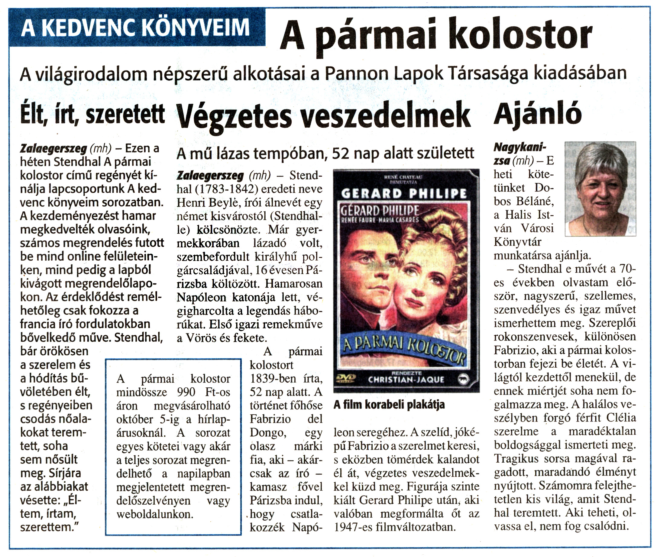 Nyilvános 1474 | 1710 | Zalai Hírlap 2010. szeptember 29. 227. szám 7. oldal - Könyvajánló | A cikk szövege: A KEDVENC KÖNYVEIM A pármai kolostor A világirodalom népszerű alkotásai a Pannon Lapok Társasága kiadásában Élt, írt, szeretett Zalaegerszeg (mh) - Ezen a héten Stendhal A pármai kolostor című regényét kínálja lapcsoportunk A kedvenc könyveim sorozatban. A kezdeményezést hamar megkedvelték olvasóink, számos megrendelés futott be mind online felületeinken, mind pedig a lapból kivágott megrendelőlapokon. Az érdeklődést remélhetőleg csak fokozza a francia író fordulatokban bővelkedő műve. Stendhal, bár örökösen a szerelem és a hódítás bűvöletében élt, s regényeiben csodás nőalakokat teremtett, soha sem nősült meg. Sírjára az alábbiakat vésette: „Éltem, írtam, szerettem." Végzetes veszedelmek A mű lázas tempóban, 52 nap alatt született Zalaegerszeg (mh) - Stendhal (1783-1842) eredeti neve Henri Beyle, írói álnevét egy német kisvárostól (Stendhal-le) kölcsönözte. Már gyermekkorában lázadó volt, szembefordult királyhű polgárcsaládjával, 16 évesen Párizsba költözött. Hamarosan Napóleon katonája lett, végigharcolta a legendás háborúkat. Első igazi remekműve a Vörös és fekete. A pármai kolostort 1839-ben írta, 52 nap alatt. A történet főhőse Fabrizio del Dongó, egy olasz márki fia, aki - akárcsak az író -kamasz fővel Párizsba indul, hogy csatlakozzék Napóleon seregéhez. A szelíd, jóképű Fabrizio a szerelmet keresi, s eközben tömérdek kalandot él át, végzetes veszedelmekkel küzd meg. Figurája szinte kiált Gerard Philipe után, aki valóban megformálta őt az 1947-es filmváltozatban. A pármai kolostor mindössze 990 Ft-os áron megvásárolható október 5-ig a hírlapárusoknál. A sorozat egyes kötetei vagy akár a teljes sorozat megrendelhető a napilapban megjelentetett megrendelőszelvényen vagy weboldalunkon. Ajánló Nagykanizsa (mh) - E heti kötetünket Dobos Béláné, a Halis István Városi Könyvtár munkatársa ajánlja. - Stendhal e művét a 70-es években olvastam először, nagyszerű, szellemes, szenvedélyes és igaz művet ismerhettem meg. Szereplői rokonszenvesek, különösen Fabrizio, aki a pármai kolostorban fejezi be életét. A világtól kezdettől menekül, de ennek miértjét soha nem fogalmazza meg. A halálos veszélyben forgó férfit Clélia szerelme a maradéktalan boldogsággal ismerteti meg. Tragikus sorsa magával ragadott, maradandó élményt nyújtott. Számomra felejthetetlen kis világ, amit Stendhal teremtett. Aki teheti, olvassa el, nem fog csalódni. A film korabeli plakátja |