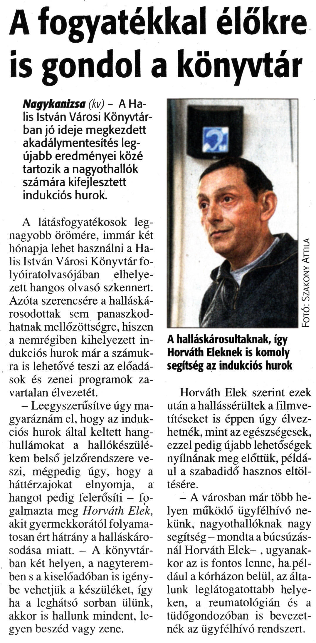 Nyilvános 2191 | 5101 | Zalai Hírlap 2011. január 14. 11. szám 11. oldal - A fogyatékkal élőkre is gondol a könyvtár | A cikk szövege: A fogyatékkal élőkre is gondol a könyvtár Nagykanizsa (kv) - A Halis István Városi Könyvtárban jó ideje megkezdett akadálymentesítés legújabb eredményei közé tartozik a nagyothallók számára kifejlesztett indukciós hurok. A látásfogyatékosok legnagyobb örömére, immár két hónapja lehet használni a Halis István Városi Könyvtár folyóiratolvasójában elhelyezett hangos olvasó szkennert. Azóta szerencsére a halláskárosodottak sem panaszkodhatnak mellőzöttségre, hiszen a nemrégiben kihelyezett indukciós hurok már a számukra is lehetővé teszi az előadások és zenei programok zavartalan élvezetét. - Leegyszerűsítve úgy magyaráznám el, hogy az indukciós hurok által keltett hanghullámokat a hallókészülékem belső jelzőrendszere veszi, mégpedig úgy, hogy a háttérzajokat elnyomja, a hangot pedig felerősíti - fogalmazta meg Horváth Elek, akit gyermekkorától folyamatosan ért hátrány a halláskárosodása miatt. - A könyvtárban két helyen, a nagyteremben s a kiselőadóban is igénybe vehetjük a készüléket, így ha a leghátsó sorban ülünk, akkor is hallunk mindent, legyen beszéd vagy zene. A halláskárosultaknak, így Horváth Eleknek is komoly segítség az indukciós hurok Horváth Elek szerint ezek után a hallássérültek a filmvetítéseket is éppen úgy élvezhetnék, mint az egészségesek, ezzel pedig újabb lehetőségek nyílnának meg előttük, például a szabadidő hasznos eltöltésére. - A városban már több helyen működő ügyfélhívó nekünk, nagyothallóknak nagy segítség - mondta a búcsúzásnál Horváth Elek –, ugyanakkor az is fontos lenne, ha például a kórházon belül, az általunk leglátogatottabb helyeken, a reumatológián és a tüdőgondozóban is bevezetnék az ügyfélhívó rendszert. Fotó: Szakony Attila |
