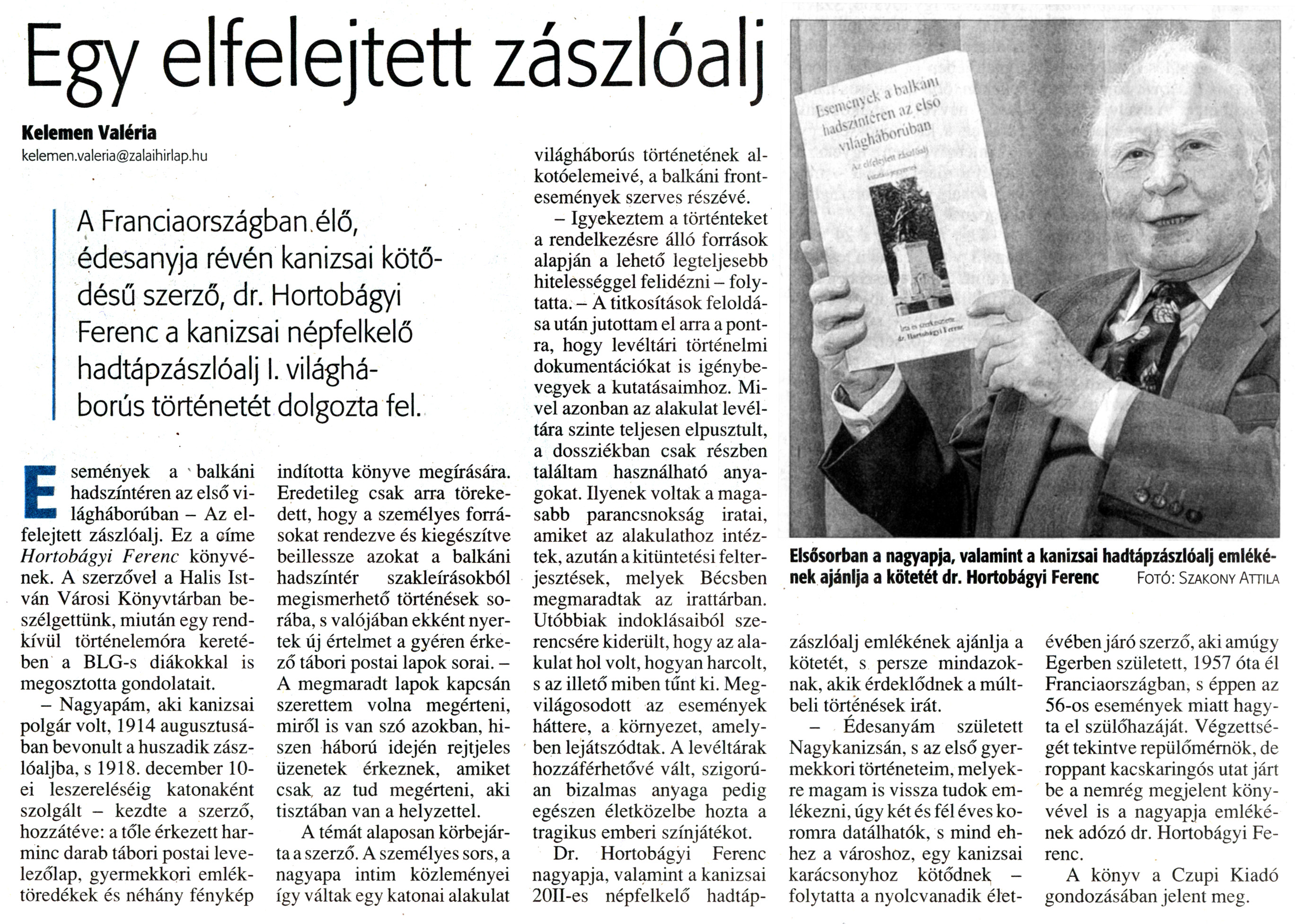 Nyilvános 2231 | 5509 | Zalai Hírlap 2011. június 4. 130. szám 18. oldal - Egy elfelejtett zászlóalj | A cikk szövege: Egy elfelejtett zászlóalj Kelemen Valéria kelemen.valeria@zalaihirlap.hu A Franciaországban élő, édesanyja révén kanizsai kötődésű szerző, dr. Hortobágyi Ferenc a kanizsai népfelkelő hadtápzászlóalj I. világháborús történetét dolgozta fel. Elsősorban a nagyapja, valamint a kanizsai hadtápzászlóalj emlékének ajánlja a kötetét dr. Hortobágyi Ferenc Fotó: Szakony Attila Események a balkáni hadszíntéren az első világháborúban - Az elfelejtett zászlóalj. Ez a címe Hortobágyi Ferenc könyvének. A szerzővel a Halis István Városi Könyvtárban beszélgettünk, miután egy rendkívüli történelemóra keretében a BLG-s diákokkal is megosztotta gondolatait. - Nagyapám, aki kanizsai polgár volt, 1914 augusztusában bevonult a huszadik zászlóaljba, s 1918. december 10-ei leszereléséig katonaként szolgált - kezdte a szerző, hozzátéve: a tőle érkezett harminc darab tábori postai levelezőlap, gyermekkori emléktöredékek és néhány fénykép indította könyve megírására. Eredetileg csak arra törekedett, hogy a személyes forrásokat rendezve és kiegészítve beillessze azokat a balkáni hadszíntér szakleírásokból megismerhető történések sorába, s valójában ekként nyertek új értelmet a gyéren érkező tábori postai lapok sorai. - A megmaradt lapok kapcsán szerettem volna megérteni, miről is van szó azokban, hiszen háború idején rejtjeles üzenetek érkeznek, amiket csak, az tud megérteni, aki tisztában van a helyzettel. A témát alaposan körbejárta a szerző. A személyes sors, a nagyapa intim közleményei így váltak egy katonai alakulat világháborús történetének alkotóelemeivé, a balkáni frontesemények szerves részévé. - Igyekeztem a történteket a rendelkezésre álló források alapján a lehető legteljesebb hitelességgel felidézni - folytatta. - A titkosítások feloldása után jutottam el arra a pontra, hogy levéltári történelmi dokumentációkat is igénybe vegyek a kutatásaimhoz. Mivel azonban az alakulat levéltára szinte teljesen elpusztult, a dossziékban csak részben találtam használható anyagokat. Ilyenek voltak a magasabb parancsnokság iratai, amiket az alakulathoz intéztek, azután a kitüntetési felterjesztések, melyek Bécsben megmaradtak az irattárban. Utóbbiak indoklásaiból szerencsére kiderült, hogy az alakulat hol volt, hogyan harcolt, s az illető miben tűnt ki. Megvilágosodott az események háttere, a környezet, amelyben lejátszódtak. A levéltárak hozzáférhetővé vált, szigorúan bizalmas anyaga pedig egészen életközelbe hozta a tragikus emberi színjátékot. Dr. Hortobágyi Ferenc nagyapja, valamint a kanizsai 20 II-es népfelkelő hadtápzászlóalj emlékének ajánlja a kötetét, s persze mindazoknak, akik érdeklődnek a múltbeli történések iránt. - Édesanyám született Nagykanizsán, s az első gyermekkori történeteim, melyekre magam is vissza tudok emlékezni, úgy két és fél éves koromra datálhatok, s mind ehhez a városhoz, egy kanizsai karácsonyhoz kötődnek -folytatta a nyolcvanadik élet- évében járó szerző, aki amúgy Egerben született, 1957 óta él Franciaországban, s éppen az 56-os események miatt hagyta el szülőhazáját. Végzettségét tekintve repülőmérnök, de roppant kacskaringós utat járt be a nemrég megjelent könyvével is a nagyapja emlékének adózó dr. Hortobágyi Ferenc. A könyv a Czupi Kiadó gondozásában jelent meg. |