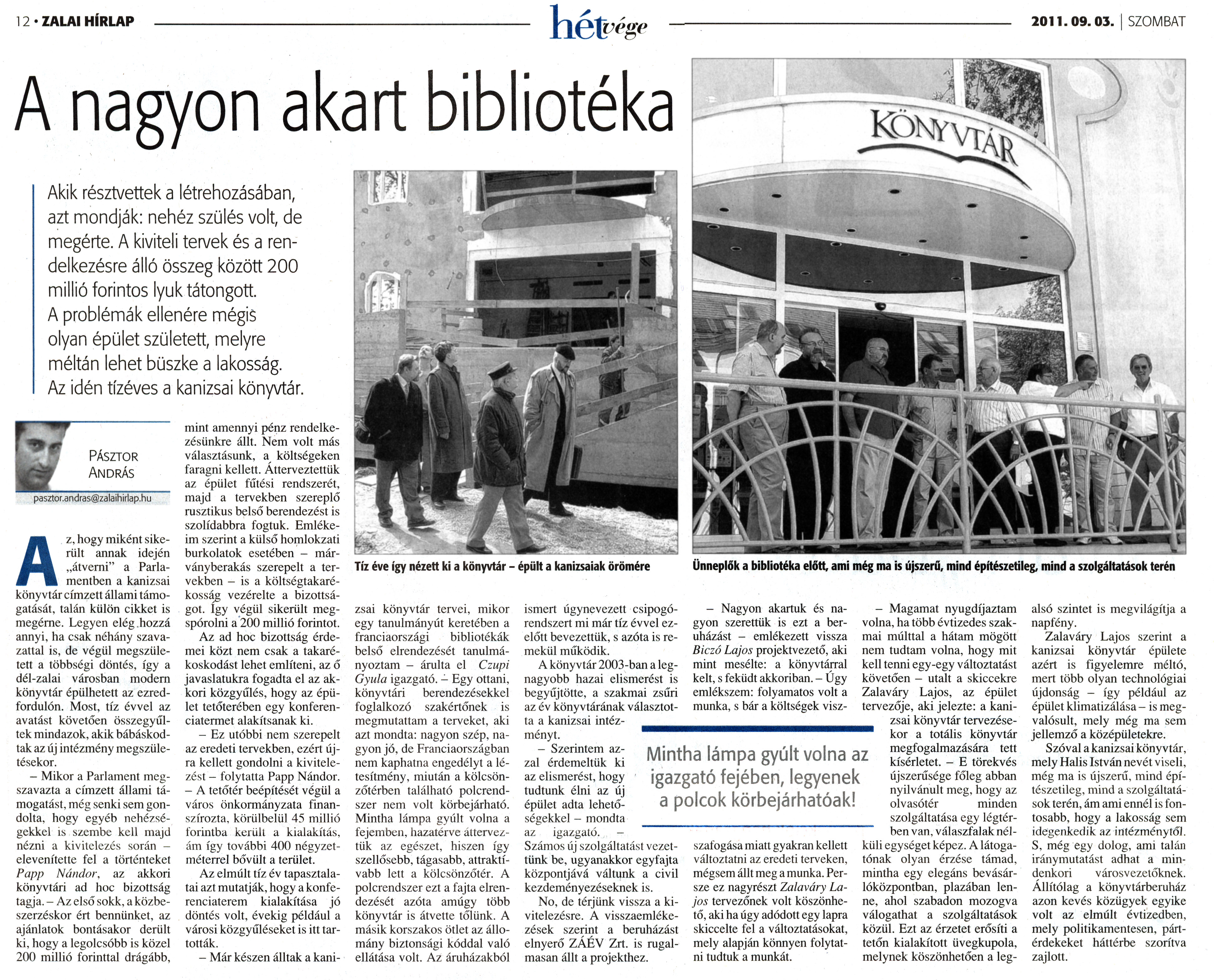 Nyilvános 2547 | 7259 | Zalai Hírlap 2011. szeptember 3. 206. szám 12. oldal - A nagyon akart bibliotéka | 12 ZALAI HÍRLAP 2011.09.03. SZOMBAT A nagyon akart bibliotéka Akik résztvettek a létrehozásában, azt mondják: nehéz szülés volt, de megérte. A kiviteli tervek és a rendelkezésre álló összeg között 200 millió forintos lyuk tátongott. A problémák ellenére mégis olyan épület született, melyre méltán lehet büszke a lakosság. Az idén tízéves a kanizsai könyvtár. Az, hogy miként sikerült annak idején „átverni" a Parlamentben a kanizsai könyvtár címzett állami támogatását, talán külön cikket is megérne. Legyen elég hozzá annyi, ha csak néhány szavazattal is, de végül megszületett a többségi döntés, így a dél-zalai városban modern könyvtár épülhetett az ezredfordulón. Most, tíz évvel az avatást követően összegyűltek mindazok, akik bábáskodtak az új intézmény megszületésekor. - Mikor a Parlament megszavazta a címzett állami támogatást, még senki sem gondolta, hogy egyéb nehézségekkel is szembe kell majd nézni a kivitelezés során - elevenítette fel a történteket Papp Nándor, az akkori könyvtári ad hoc bizottság tagja. - Az első sokk, a közbeszerzéskor ért bennünket, az ajánlatok bontásakor derült ki, hogy a legolcsóbb is közel 200 millió forinttal drágább, mint amennyi pénz rendelkezésünkre állt. Nem volt más választásunk, a költségeken faragni kellett. Átterveztettük az épület fűtési rendszerét, majd a tervekben szereplő rusztikus belső berendezést is szolidabbra fogtuk. Emlékeim szerint a külső homlokzati burkolatok esetében - márványberakás szerepelt a tervekben - is a költségtakarékosság vezérelte a bizottságot, így végül sikerült megspórolni a 200 millió forintot. Az ad hoc bizottság érdemei közt nem csak a takarékoskodást lehet említeni, az ő javaslatukra fogadta el az akkori közgyűlés, hogy az épület tetőterében egy konferenciatermet alakítsanak ki. - Ez utóbbi nem szerepelt az eredeti tervekben, ezért újra kellett gondolni a kivitelezést - folytatta Papp Nándor. - A tetőtér beépítését végül a város önkormányzata finanszírozta, körülbelül 45 millió forintba került a kialakítás, ám így további 400 négyzetméterrel bővült a terület. Az elmúlt tíz év tapasztalatai azt mutatják, hogy a konferenciaterem kialakítása jó döntés volt, évekig például a városi közgyűléseket is itt tartották. - Már készen álltak a kanizsai könyvtár tervei, mikor egy tanulmányút keretében a franciaországi bibliotékák belső elrendezését tanulmányoztam - árulta el Czupi Gyula igazgató. - Egy ottani, könyvtári berendezésekkel foglalkozó szakértőnek is megmutattam a terveket, aki azt mondta: nagyon szép, nagyon jó, de Franciaországban nem kaphatna engedélyt a létesítmény, miután a kölcsönzőtérben található polcrendszer nem volt körbejárható. Mintha lámpa gyúlt volna a fejemben, hazatérve átterveztük az egészet, hiszen így szellősebb, tágasabb, attraktívabb lett a kölcsönzőtér. A polcrendszer ezt a fajta elrendezését azóta amúgy több könyvtár is átvette tőlünk. A másik korszakos ötlet az állomány biztonsági kóddal való ellátása volt. Az áruházakból ismert úgynevezett csipogórendszert mi már tíz évvel ezelőtt bevezettük, s azóta is remekül működik. A könyvtár 2003-ban a legnagyobb hazai elismerést is begyűjtötte, a szakmai zsűri az év könyvtárának választotta a kanizsai intézményt. - Szerintem azzal érdemeltük ki az elismerést, hogy tudtunk élni az új épület adta lehetőségekkel - mondta az igazgató. -Számos új szolgáltatást vezettünk be, ugyanakkor egyfajta központjává váltunk a civil kezdeményezéseknek is. No, de térjünk vissza a kivitelezésre. A visszaemlékezések szerint a beruházást elnyerő ZAÉV Zrt. is rugalmasan állt a projekthez. - Nagyon akartuk és nagyon szerettük is ezt a beruházást - emlékezett vissza Biczó Lajos projektvezető, aki mint mesélte: a könyvtárral kelt, s feküdt akkoriban. - Úgy emlékszem: folyamatos volt a munka, s bár a költségek visszafogása miatt gyakran kellett változtatni az eredeti terveken, mégsem állt meg a munka. Persze ez nagyrészt Zalaváry Lajos tervezőnek volt köszönhető, aki ha úgy adódott egy lapra skiccelte fel a változtatásokat, mely alapján könnyen folytatni tudtuk a munkát. - Magamat nyugdíjaztam volna, ha több évtizedes szakmai múlttal a hátam mögött nem tudtam volna, hogy mit kell tenni egy-egy változtatást követően - utalt a skiccekre Zalaváry Lajos, az épület tervezője, aki jelezte: a kanizsai könyvtár tervezésekor a totális könyvtár megfogalmazására tett kísérletet. - E törekvés újszerűsége főleg abban nyilvánult meg, hogy az olvasótér minden szolgáltatása egy légtérben van, válaszfalak nélküli egységet képez. A látogatónak olyan érzése támad, mintha egy elegáns bevásárlóközpontban, plazában lenne, ahol szabadon mozogva válogathat a szolgáltatások közül. Ezt az érzetet erősíti a tetőn kialakított üvegkupola, melynek köszönhetően a legalsó szintet is megvilágítja a napfény. Zalaváry Lajos szerint a kanizsai könyvtár épülete azért is figyelemre méltó, mert több olyan technológiai újdonság - így például az épület klimatizálása - is megvalósult, mely még ma sem jellemző a középületekre. Szóval a kanizsai könyvtár, mely Halis István nevét viseli, még ma is újszerű, mind építészetileg, mind a szolgáltatások terén, ám ami ennél is fontosabb, hogy a lakosság sem idegenkedik az intézménytől. S, még egy dolog, ami talán iránymutatást adhat a mindenkori városvezetőknek. Állítólag a könyvtárberuház azon kevés közügyek egyike volt az elmúlt évtizedben, mely politikamentesen, pá