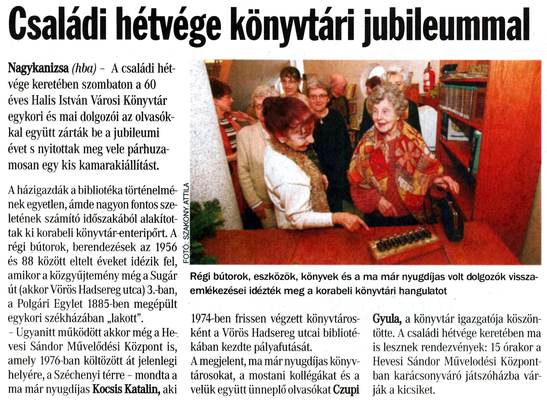 Nyilvános 2210 | 6300 | Vasárnapi Zalai Hírlap 2011. december 11. 48. szám 1. oldal - Családi hétvége könyvtári jubileummal | Családi hétvége könyvtári jubileummal Nagykanizsa (hba) - A családi hétvége keretében szombaton a 60 éves Halis István Városi Könyvtár egykori és mai dolgozói az olvasókkal együtt zárták be a jubileumi évet s nyitottak meg vele párhuzamosan egy kis kamarakiállítást. A házigazdák a bibliotéka történelmének egyetlen, ámde nagyon fontos szeletének számító időszakából alakítottak ki korabeli könyvtár-enteripőrt. A régi bútorok, berendezések az 1956 és 88 között eltelt éveket idézik fel, amikor a közgyűjtemény még a Sugár út (akkor Vörös Hadsereg utca) 3.-ban, a Polgári Egylet 1885-ben megépült egykori székházában „lakott". - Ugyanitt működött akkor még a Hevesi Sándor Művelődési Központ is, amely 1976-ban költözött át jelenlegi helyére, a Széchenyi térre - mondta a ma már nyugdíjas Kocsis Katalin, aki 1974-ben frissen végzett könyvtárosként a Vörös Hadsereg utcai bibliotékában kezdte pályafutását. A megjelent, ma már nyugdíjas könyvtárosokat, a mostani kollégákat és a velük együtt ünneplő olvasókat Czupi Gyula, a könyvtár igazgatója köszöntötte. A családi hétvége keretében ma is lesznek rendezvények: 15 órakor a Hevesi Sándor Művelődési Központban karácsonyváró játszóházba várják a kicsiket. Régi bútorok, eszközök, könyvek és a ma már nyugdíjas volt dolgozók visszaemlékezései idézték meg a korabeli könyvtári hangulatot |