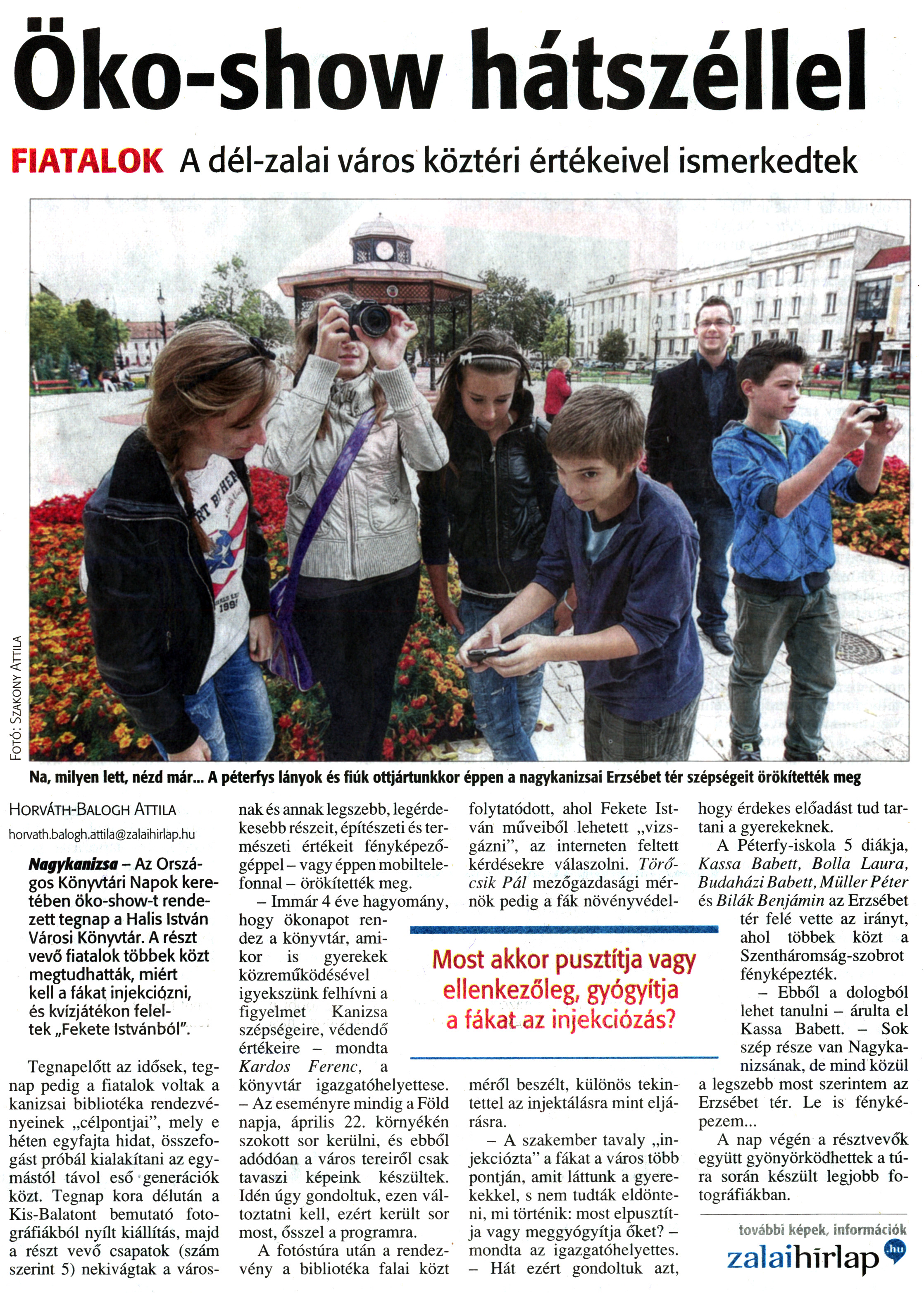 Nyilvános 2069 | 4245 | Zalai Hírlap 2012. október 3. 232. szám 3. oldal - Öko-show hátszéllel | Öko-show hátszéllel FIATALOK A dél-zalai város köztéri értékeivel ismerkedtek Na, milyen lett, nézd már... A péterfys lányok és fiúk ottjártunkkor éppen a nagykanizsai Erzsébet tér szépségeit örökítették meg Horváth-Balogh Attila Nagykanizsa - Az Országos Könyvtári Napok keretében öko-show-t rendezett tegnap a Halis István Városi Könyvtár. A részt vevő fiatalok többek közt megtudhatták, miért kell a fákat injekciózni, és kvízjátékon feleltek „Fekete Istvánból". Tegnapelőtt az idősek, tegnap pedig a fiatalok voltak a kanizsai bibliotéka rendezvényeinek „célpontjai", mely e héten egyfajta hidat, összefogást próbál kialakítani az egymástól távol eső generációk közt. Tegnap kora délután a Kis-Balatont bemutató fotográfiákból nyílt kiállítás, majd a részt vevő csapatok (szám szerint 5) nekivágtak a városnak és annak legszebb, legérdekesebb részeit, építészeti és természeti értékeit fényképezőgéppel - vagy éppen mobiltelefonnal - örökítették meg. - Immár 4 éve hagyomány, hogy ökonapot rendez a könyvtár, amikor is gyerekek közreműködésével igyekszünk felhívni a figyelmet Kanizsa szépségeire, védendő értékeire - mondta Kardos Ferenc, a könyvtár igazgatóhelyettese. - Az eseményre mindig a Föld napja, április 22. környékén szokott sor kerülni, és ebből adódóan a város tereiről csak tavaszi képeink készültek. Idén úgy gondoltuk, ezen változtatni kell, ezért került sor most, ősszel a programra. A fotóstúra után a rendezvény a bibliotéka falai közt folytatódott, ahol Fekete István műveiből lehetett „vizsgázni", az interneten feltett kérdésekre válaszolni. Törőcsik Pál mezőgazdasági mérnök pedig a fák növényvédelméről beszélt, különös tekintettel az injektálásra mint eljárásra. - A szakember tavaly „injekciózta" a fákat a város több pontján, amit láttunk a gyerekekkel, s nem tudták eldönteni. mi történik: most elpusztítja vagy meggyógyítja őket? -mondta az igazgatóhelyettes. - Hát ezért gondoltuk azt, hogy érdekes előadást tud tartani a gyerekeknek. A Péterfy-iskola 5 diákja, Kassa Babett, Bolla Laura, Budaházi Babett, Müller Péter és Bilák Benjámin az Erzsébet tér felé vette az irányt, ahol többek közt a Szentháromság-szobrot fényképezték. - Ebből a dologból lehet tanulni - árulta el Kassa Babett. - Sok szép része van Nagykanizsának, de mind közül a legszebb most szerintem az Erzsébet tér. Le is fényképezem... A nap végén a résztvevők együtt gyönyörködhettek a túra során készült legjobb fotográfiákban. további képek, információk zalaihirlap.hu Fotó: Szakony Attila |