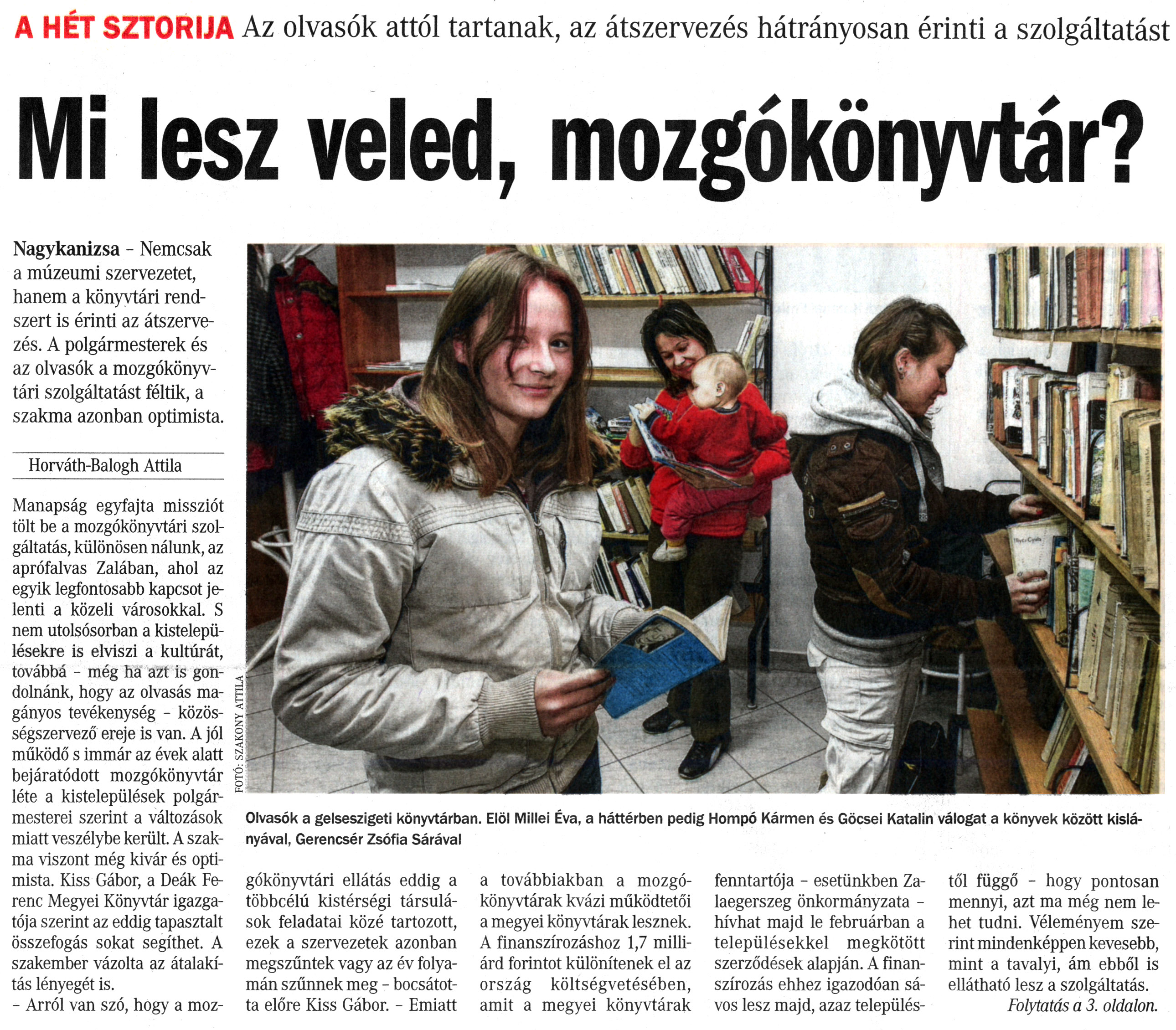 Nyilvános 2062 | 4584 | Vasárnapi Zalai Hírlap 2013. január 13. 2. szám 1. oldal - Mi lesz veled, mozgókönyvtár? | A HÉT SZTORIJA Az olvasók attól tartanak, az átszervezés hátrányosan érinti a szolgáltatást Mi lesz veled, mozgókönyvtár? Olvasók a gelseszigeti könyvtárban. Elöl Millei Éva, a háttérben pedig Hompó Kármen és Göcsei Katalin válogat a könyvek között kislányával, Gerencsér Zsófia Sárával FOTÓ: SZAKONY ATTILA Nagykanizsa - Nemcsak a múzeumi szervezetet, hanem a könyvtári rendszert is érinti az átszervezés. A polgármesterek és az olvasók a mozgókönyvtári szolgáltatást féltik, a szakma azonban optimista. Horváth-Balogh Attila Manapság egyfajta missziót tölt be a mozgókönyvtári szolgáltatás, különösen nálunk, az aprófalvas Zalában, ahol az egyik legfontosabb kapcsot jelenti a közeli városokkal. S nem utolsósorban a kistelepülésekre is elviszi a kultúrát, továbbá - még ha azt is gondolnánk, hogy az olvasás magányos tevékenység - közösségszervező ereje is van. A jól működő s immár az évek alatt bejáratódott mozgókönyvtár léte a kistelepülések polgármesterei szerint a változások miatt veszélybe került. A szakma viszont még kivár és optimista. Kiss Gábor, a Deák Ferenc Megyei Könyvtár igazgatója szerint az eddig tapasztalt összefogás sokat segíthet. A szakember vázolta az átalakítás lényegét is. - Arról van szó, hogy a mozgókönyvtári ellátás eddig a többcélú kistérségi társulások feladatai közé tartozott, ezek a szervezetek azonban megszűntek vagy az év folyamán szűnnek meg - bocsátotta előre Kiss Gábor. - Emiatt a továbbiakban a mozgókönyvtárak kvázi működtetői a megyei könyvtárak lesznek. A finanszírozáshoz 1,7 milliárd forintot különítenek el az ország költségvetésében, amit a megyei könyvtárak fenntartója - esetünkben Zalaegerszeg önkormányzata -hívhat majd le februárban a településekkel megkötött szerződések alapján. A finanszírozás ehhez igazodóan sávos lesz majd, azaz településtől függő - hogy pontosan mennyi, azt ma még nem lehet tudni. Véleményem szerint mindenképpen kevesebb, mint a tavalyi, ám ebből is ellátható lesz a szolgáltatás. Folytatás a 3. oldalon. |