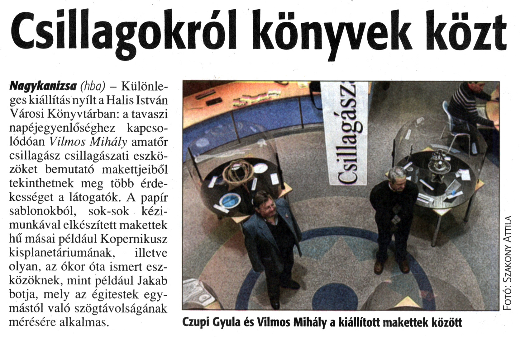 Nyilvános 2028 | 4487 | Zalai Hírlap 2013. március 18. 64. szám 12. oldal - Csillagokról könyvek közt | Csillagokról könyvek közt Nagykanizsa (hba) - Különleges kiállítás nyílt a Halis István Városi Könyvtárban: a tavaszi napéjegyenlőséghez kapcsolódóan Vilmos Mihály amatőr csillagász csillagászati eszközöket bemutató makettjeiből tekinthetnek meg több érdekességet a látogatók. A papír sablonokból, sok-sok kézimunkával elkészített makettek hű másai például Kopernikusz kisplanetáriumának, illetve olyan, az ókor óta ismert eszközöknek, mint például Jakab botja, mely az égitestek egymástól való szögtávolságának mérésére alkalmas. Czupi Gyula és Vilmos Mihály a kiállított makettek között Fotó: Szakony Attila |