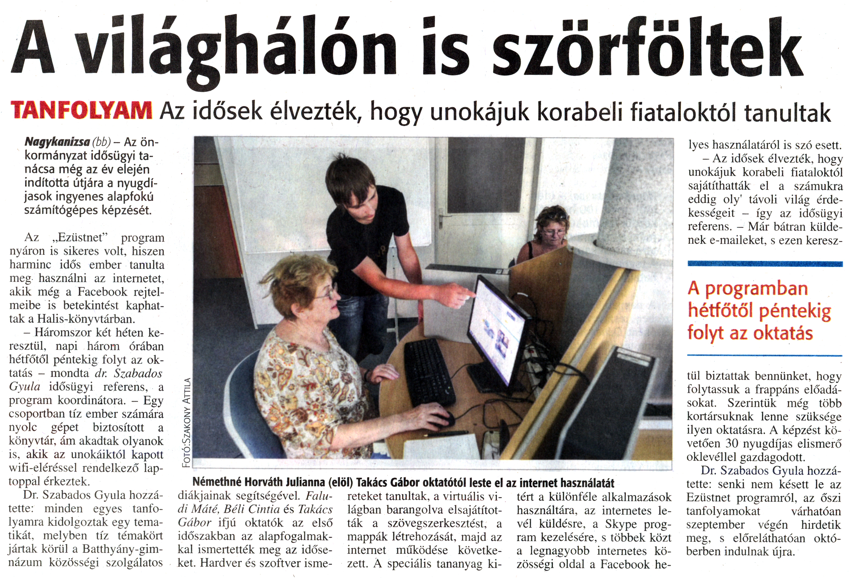 Nyilvános 2252 | 3957 | Zalai Hírlap 2014. szeptember 4. 206. szám 4. oldal | A világhálón is szörföltek TANFOLYAM Az idősek élvezték, hogy unokájuk korabeli fiataloktól tanultak Nagykanizsa (bb) - Az önkormányzat idősügyi tanácsa még az év elején indította útjára a nyugdíjasok ingyenes alapfokú számítógépes képzését. Az „Ezüstnet" program nyáron is sikeres volt, hiszen harminc idős ember tanulta meg használni az internetet, akik még a Facebook rejtelmeibe is betekintést kaphattak a Halis-könyvtárban. - Háromszor két héten keresztül, napi három órában hétfőtől péntekig folyt az oktatás - mondta dr. Szabados Gyula idősügyi referens, a program koordinátora. - Egy csoportban tíz ember számára nyolc gépet biztosított a könyvtár, ám akadtak olyanok is, akik az unokáiktól kapott wifi-eléréssel rendelkező laptoppal érkeztek. Dr. Szabados Gyula hozzátette: minden egyes tanfolyamra kidolgoztak egy tematikát, melyben tíz témakört jártak körül a Batthyány-gimnázum közösségi szolgálatos diákjainak segítségével. Faludi Máté, Béli Cintia és Takács Gábor ifjú oktatók az első időszakban az alapfogalmakkal ismertették meg az időseket. Hardver és szoftver ismereteket tanultak, a virtuális világban barangolva elsajátították a szövegszerkesztést, a mappák létrehozását, majd az internet működése következett. A speciális tananyag kitért a különféle alkalmazások használatára, az internetes levél küldésre, a Skype program kezelésére, s többek közt a legnagyobb internetes közösségi oldal a Facebook helyes használatáról is szó esett. - Az idősek élvezték, hogy unokájuk korabeli fiataloktól sajátíthatták el a számukra eddig oly\' távoli világ érdekességeit - így az idősügyi referens. - Már bátran küldenek e-maileket, s ezen keresztül biztattak bennünket, hogy folytassuk a frappáns előadásokat. Szerintük még több kortársuknak lenne szüksége ilyen oktatásra. A képzést követően 30 nyugdíjas elismerő oklevéllel gazdagodott. Dr. Szabados Gyula hozzátette: senki nem késett le az Ezüstnet programról, az őszi tanfolyamokat várhatóan szeptember végén hirdetik meg, s előreláthatóan októberben indulnak újra. Némethné Horváth Julianna (elöl) Takács Gábor oktatótól leste el az internet használatát A programban hétfőtől péntekig folyt az oktatás |