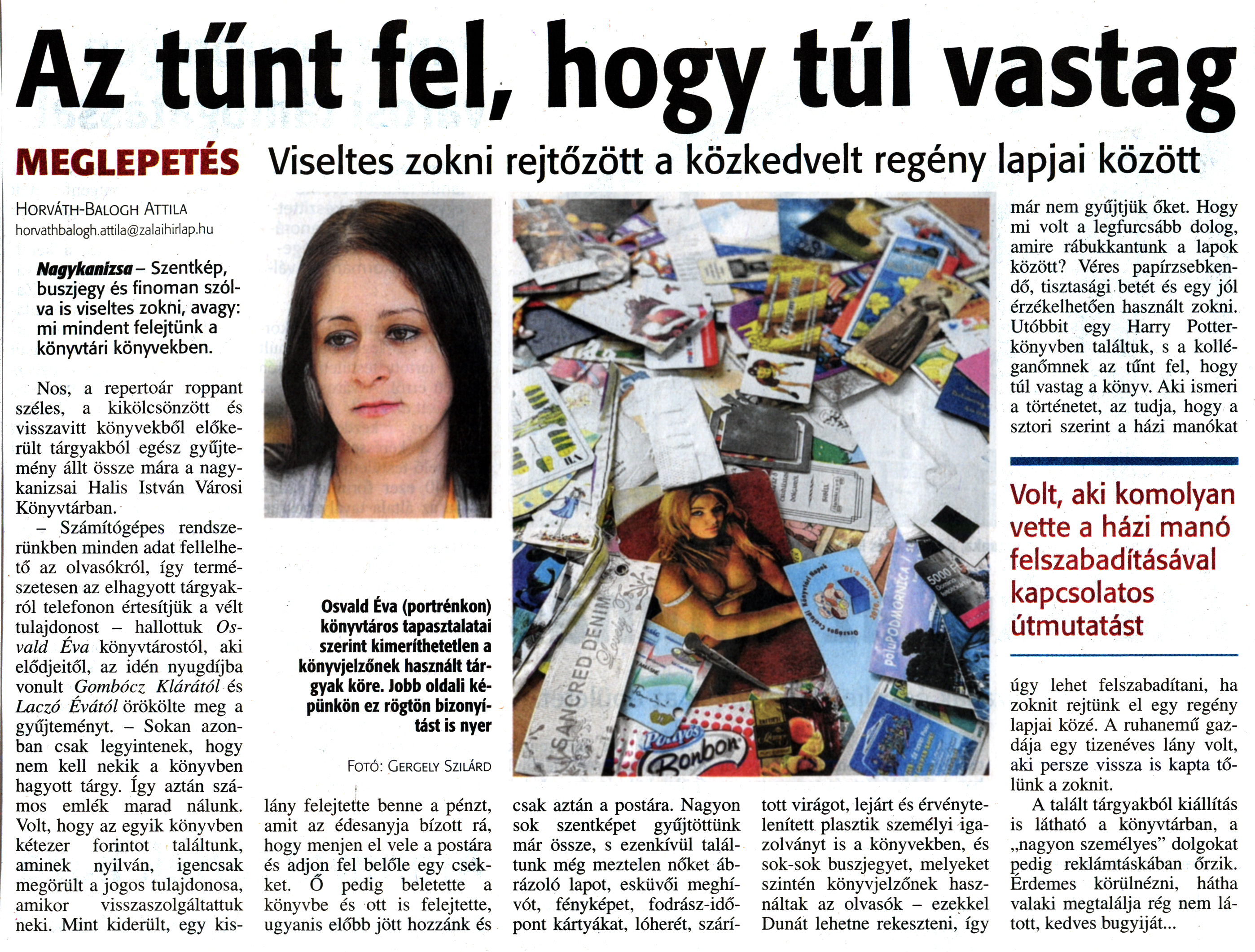 Nyilvános 1800 | 3633 | Zalai Hírlap 2015. május 6. 105. szám 3. oldal | Az tűnt fel, hogy túl vastag MEGLEPETÉS Viseltes zokni rejtőzött a közkedvelt regény lapjai között Horváth-Balogh Attila horvathbalogh.attila@zalaihirlap.hu Nagykanizsa- Szentkép, buszjegy és finoman szólva is viseltes zokni, avagy: mi mindent felejtünk a könyvtári könyvekben. Nos, a repertoár roppant széles, a kikölcsönzött és visszavitt könyvekből előkerült tárgyakból egész gyűjtemény állt össze mára a nagykanizsai Halis István Városi Könyvtárban. - Számítógépes rendszerünkben minden adat fellelhető az olvasókról, így természetesen az elhagyott tárgyakról telefonon értesítjük a vélt tulajdonost - hallottuk Os-vald Éva könyvtárostól, aki elődjeitől, az idén nyugdíjba vonult Gombócz Klárától és Laczó Évától örökölte meg a gyűjteményt. - Sokan azonban csak legyintenek, hogy nem kell nekik a könyvben hagyott tárgy. így aztán számos emlék marad nálunk. Volt, hogy az egyik könyvben kétezer forintot találtunk, aminek nyilván, igencsak megörült a jogos tulajdonosa, amikor visszaszolgáltattuk neki. Mint kiderült, egy kis- lány felejtette benne a pénzt, amit az édesanyja bízott rá, hogy menjen el vele a postára és adjon fel belőle egy csekket. O pedig beletette a könyvbe és ott is felejtette, ugyanis előbb jött hozzánk és csak aztán a postára. Nagyon sok szentképet gyűjtöttünk már össze, s ezenkívül találtunk még meztelen nőket ábrázoló lapot, esküvői meghívót, fényképet, fodrász-idő-pont kártyákat, lóherét, szárí- tott virágot, lejárt és érvénytelenített plasztik személyi igazolványt is a könyvekben, és sok-sok buszjegyet, melyeket szintén könyvjelzőnek használtak az olvasók - ezekkel Dunát lehetne rekeszteni, így már nem gyűjtjük őket. Hogy mi volt a legfurcsább dolog, amire rábukkantunk a lapok között? Véres papírzsebkendő, tisztasági betét és egy jól érzékelhetően használt zokni. Utóbbit egy Harry Potter-könyvben találtuk, s a kolléganőmnek az tűnt fel, hogy túl vastag a könyv. Aki ismeri a történetet, az tudja, hogy a sztori szerint a házi manókat Volt, aki komolyan vette a házi manó felszabadításával kapcsolatos útmutatást úgy lehet felszabadítani, ha zoknit rejtünk el egy regény lapjai közé. A ruhanemű gazdája egy tizenéves lány volt, aki persze vissza is kapta tőlünk a zoknit. A talált tárgyakból kiállítás is látható a könyvtárban, a „nagyon személyes" dolgokat pedig reklámtáskában őrzik. Érdemes körülnézni, hátha valaki megtalálja rég nem látott, kedves bugyiját... |