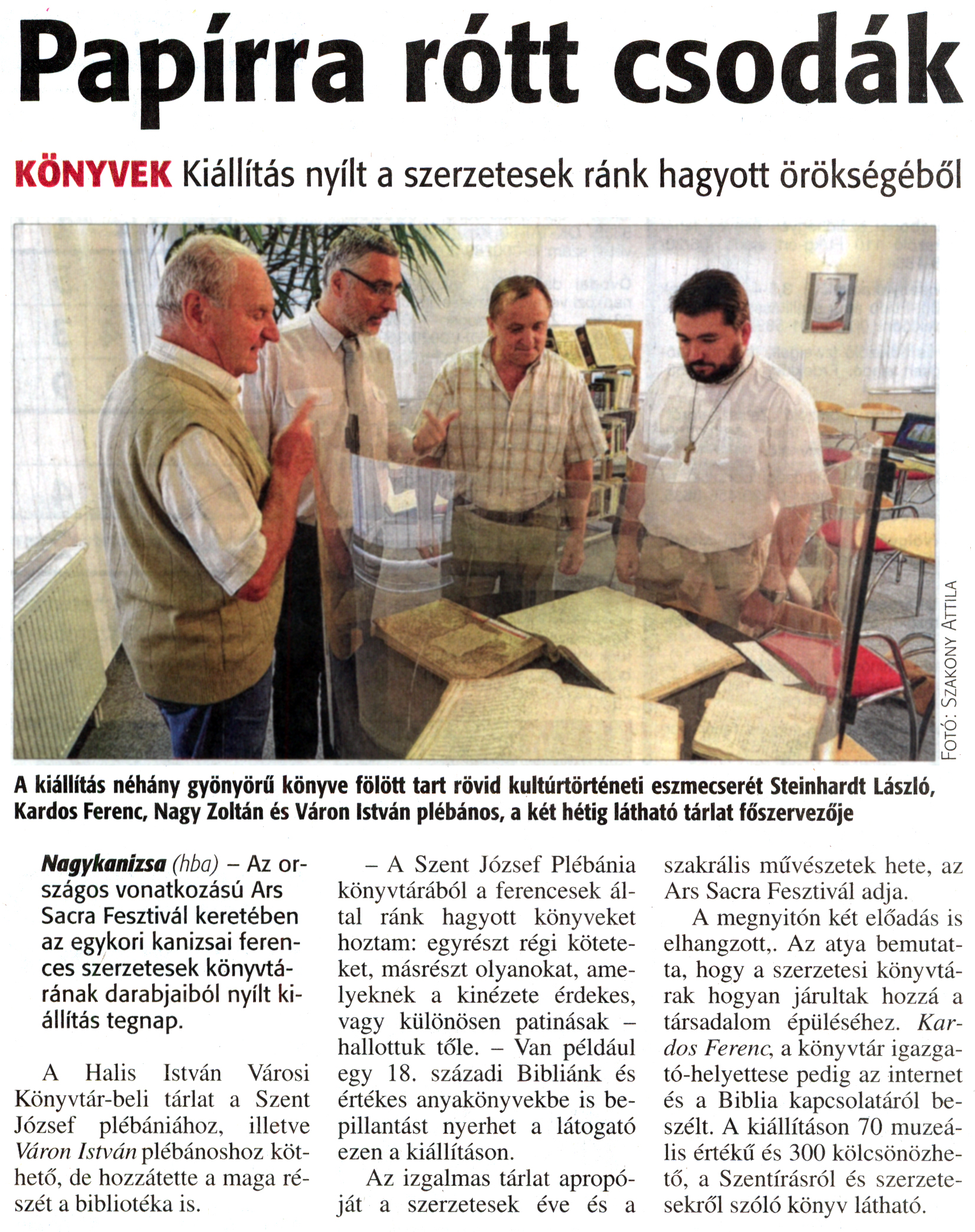 Nyilvános 1807 | 3610 | Zalai Hírlap 2015. szeptember 23. 223. szám 16. oldal | Papírra rótt csodák KÖNYVEK Kiállítás nyílt a szerzetesek ránk hagyott örökségéből A kiállítás néhány gyönyörű könyve fölött tart rövid kultúrtörténeti eszmecserét Steinhardt László, Kardos Ferenc, Nagy Zoltán és Váron István plébános, a két hétig látható tárlat főszervezője Nagykanizsa (hba) - Az országos vonatkozású Ars Sacra Fesztivál keretében az egykori kanizsai ferences szerzetesek könyvtárának darabjaiból nyílt kiállítás tegnap. A Halis István Városi Könyvtár-beli tárlat a Szent József plébániához, illetve Váron István plébánoshoz köthető, de hozzátette a maga részét a bibliotéka is. - A Szent József Plébánia könyvtárából a ferencesek által ránk hagyott könyveket hoztam: egyrészt régi köteteket, másrészt olyanokat, amelyeknek a kinézete érdekes, vagy különösen patinásak -hallottuk tőle. - Van például egy 18. századi Bibliánk és értékes anyakönyvekbe is bepillantást nyerhet a látogató ezen a kiállításon. Az izgalmas tárlat apropóját a szerzetesek éve és a szakrális művészetek hete, az Ars Sacra Fesztivál adja. A megnyitón két előadás is elhangzott. Az atya bemutatta, hogy a szerzetesi könyvtárak hogyan járultak hozzá a társadalom épüléséhez. Kardos Ferenc, a könyvtár igazgató-helyettese pedig az internet és a Biblia kapcsolatáról beszélt. A kiállításon 70 muzeális értékű és 300 kölcsönözhető, a Szentírásról és szerzetesekről szóló könyv látható. |