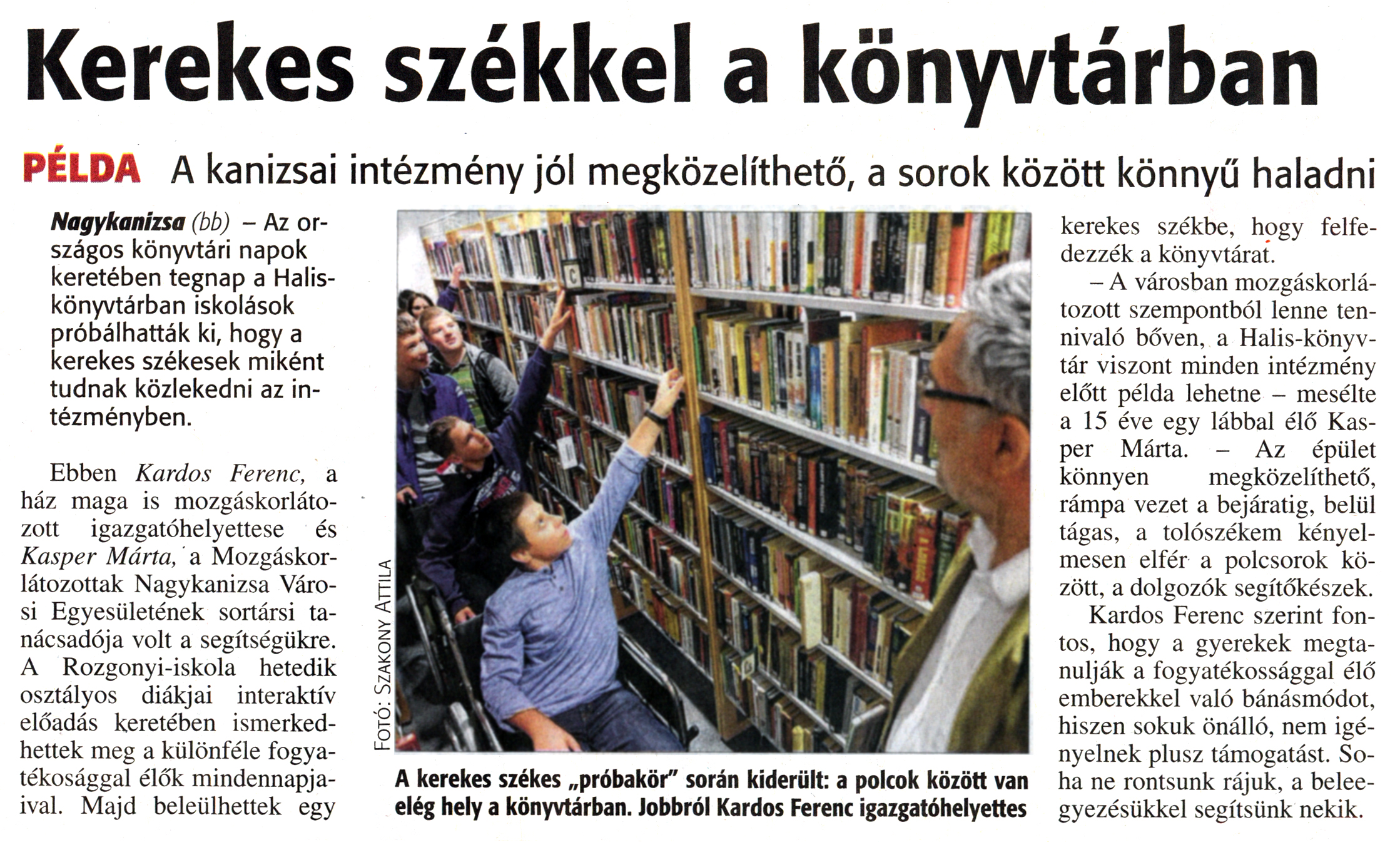 Nyilvános 1777 | 3546 | Zalai Hírlap 2015. október 10. 238. szám 4. oldal | Kerekes székkel a könyvtárban PÉLDA A kanizsai intézmény jól megközelíthető, a sorok között könnyű haladni Nagykanizsa (bb) - Az országos könyvtári napok keretében tegnap a Halis-könyvtárban iskolások próbálhatták ki, hogy a kerekes székesek miként tudnak közlekedni az intézményben. Ebben Kardos Ferenc, a ház maga is mozgáskorlátozott igazgatóhelyettese és Kasper Márta, a Mozgáskorlátozottak Nagykanizsa Városi Egyesületének sortársi tanácsadója volt a segítségükre. A Rozgonyi-iskola hetedik osztályos diákjai interaktív előadás keretében ismerkedhettek meg a különféle fogyatékosággal élők mindennapjaival. Majd beleülhettek egy kerekes székbe, hogy felfedezzék a könyvtárat. - A városban mozgáskorlátozott szempontból lenne tennivaló bőven, a Halis-könyv-tár viszont minden intézmény előtt példa lehetne - mesélte a 15 éve egy lábbal élő Kasper Márta. - Az épület könnyen megközelíthető, rámpa vezet a bejáratig, belül tágas, a tolószékem kényelmesen elfér a polcsorok között, a dolgozók segítőkészek. Kardos Ferenc szerint fontos, hogy a gyerekek megtanulják a fogyatékossággal élő emberekkel való bánásmódot, hiszen sokuk önálló, nem igényelnek plusz támogatást. Soha ne rontsunk rájuk, a beleegyezésükkel segítsünk nekik. Fotó: Szakony Attila A kerekes székes „próbakör" során kiderült: a polcok között van elég hely a könyvtárban. Jobbról Kardos Ferenc igazgatóhelyettes |