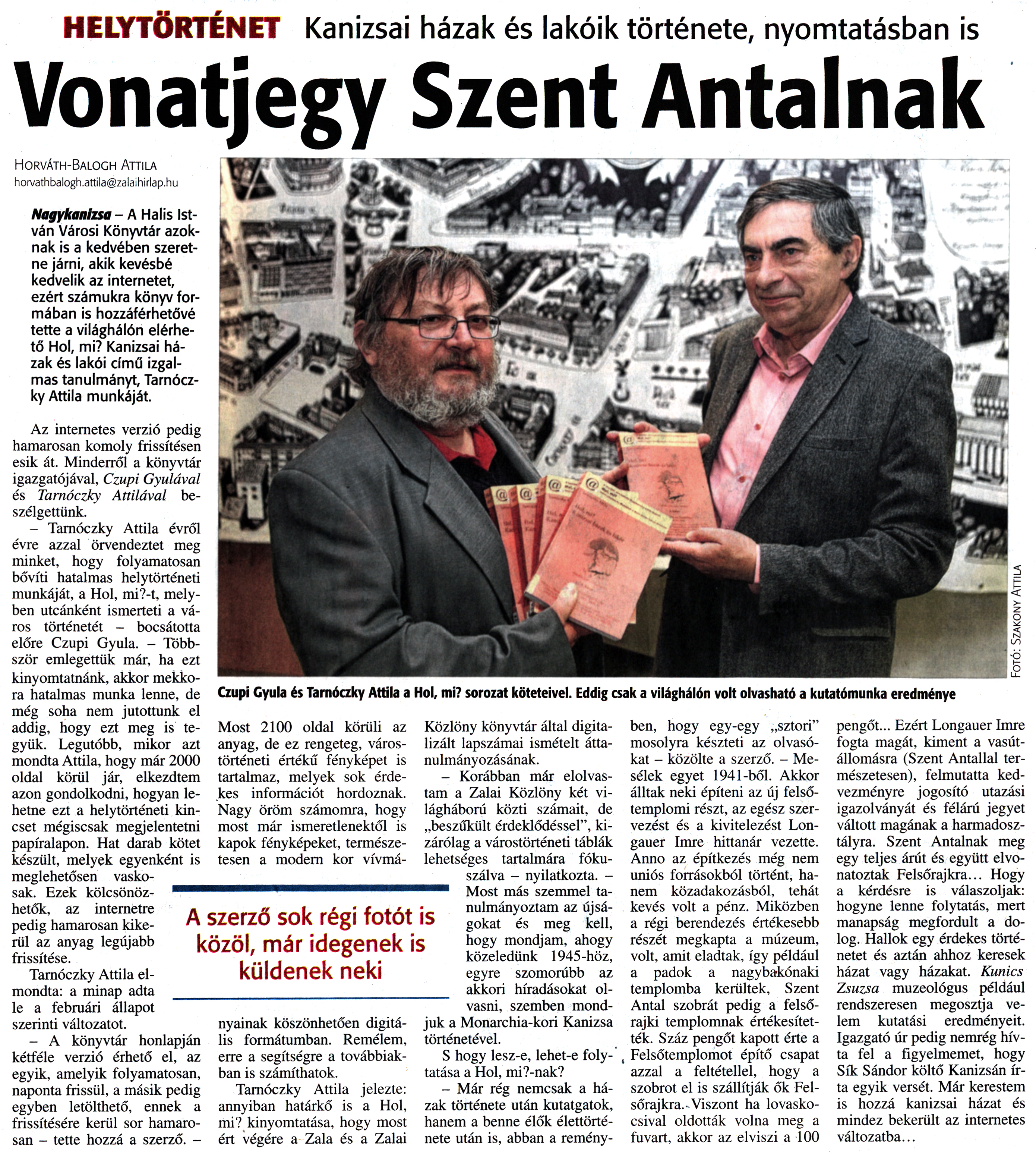 Nyilvános 2108 | 4303 | Zalai Hírlap 2016. február 26. 48. szám 5. oldal | HELYTÖRTÉNET Kanizsai házak és lakóik története, nyomtatásban is Vonatjegy Szent Antalnak Horváth-Balogh Attila horvathbalogh.attila@zalaihirlap.hu Nagykanizsa - A Halis István Városi Könyvtár azoknak is a kedvében szeretne járni, akik kevésbé kedvelik az internetet, ezért számukra könyv formában is hozzáférhetővé tette a világhálón elérhető Hol, mi? Kanizsai házak és lakói című izgalmas tanulmányt, Tarnóczky Attila munkáját. Az internetes verzió pedig hamarosan komoly frissítésen esik át. Minderről a könyvtár igazgatójával, Czupi Gyulával és Tarnóczky Attilával beszélgettünk. - Tarnóczky Attila évről évre azzal örvendeztet meg minket, hogy folyamatosan bővíti hatalmas helytörténeti munkáját, a Hol, mi?-t, melyben utcánként ismerteti a város történetét - bocsátotta előre Czupi Gyula. - Többször emlegettük már, ha ezt kinyomtatnánk, akkor mekkora hatalmas munka lenne, de még soha nem jutottunk el addig, hogy ezt meg is tegyük. Legutóbb, mikor azt mondta Attila, hogy már 2000 oldal körül jár, elkezdtem azon gondolkodni, hogyan lehetne ezt a helytörténeti kincset mégiscsak megjelentetni papíralapon. Hat darab kötet készült, melyek egyenként is meglehetősen vaskosak. Ezek kölcsönözhetők, az internetre pedig hamarosan kikerül az anyag legújabb frissítése. Tarnóczky Attila elmondta: a minap adta le a februári állapot szerinti változatot. - A könyvtár honlapján kétféle verzió érhető el, az egyik, amelyik folyamatosan, naponta frissül, a másik pedig egyben letölthető, ennek a frissítésére kerül sor hamarosan - tette hozzá a szerző. - Czupi Gyula és Tarnóczky Attila a Hol, mi? sorozat köteteivel. Eddig csak a világhálón volt olvasható a kutatómunka eredménye Most 2100 oldal körüli az anyag, de ez rengeteg, várostörténeti értékű fényképet is tartalmaz, melyek sok érdekes információt hordoznak. Nagy öröm számomra, hogy most már ismeretlenektől is kapok fényképeket, természetesen a modern kor vívmányainak köszönhetően digitális formátumban. Remélem, erre a segítségre a továbbiakban is számíthatok. Tarnóczky Attila jelezte: annyiban határkő is a Hol, mi? kinyomtatása, hogy most ért végére a Zala és a Zalai Közlöny könyvtár által digitalizált lapszámai ismételt áttanulmányozásának. - Korábban már elolvastam a Zalai Közlöny két világháború közti számait, de „beszűkült érdeklődéssel", kizárólag a várostörténeti táblák lehetséges tartalmára fókuszálva - nyilatkozta. -Most más szemmel tanulmányoztam az újságokat és meg kell, hogy mondjam, ahogy közeledünk 1945-höz, egyre szomorúbb az akkori híradásokat olvasni, szemben mondjuk a Monarchia-kori Kanizsa történetével. S hogy lesz-e, lehet-e folytatása a Hol, mi?-nak? - Már rég nemcsak a házak története után kutatgatok, hanem a benne élők élettörténete után is, abban a reményben, hogy egy-egy „sztori" mosolyra készteti az olvasókat - közölte a szerző. - Mesélek egyet 1941-ből. Akkor álltak neki építeni az új felsőtemplomi részt, az egész szervezést és a kivitelezést Longauer Imre hittanár vezette. Anno az építkezés még nem uniós forrásokból történt, hanem közadakozásból, tehát kevés volt a pénz. Miközben a régi berendezés értékesebb részét megkapta a múzeum, volt, amit eladtak, így például a padok a nagybakónaki templomba kerültek, Szent Antal szobrát pedig a felső-rajki templomnak értékesítették. Száz pengőt kapott érte a Felsőtemplomot építő csapat azzal a feltétellel, hogy a szobrot el is szállítják ők Fel-sőrajkra. Viszont ha lovaskocsival oldották volna meg a fuvart, akkor az elviszi a 100 pengőt... Ezért Longauer Imre fogta magát, kiment a vasútállomásra (Szent Antallal természetesen), felmutatta kedvezményre jogosító utazási igazolványát és félárú jegyet váltott magának a harmadosztályra. Szent Antalnak meg egy teljes árút és együtt elvonatoztak Felsőrajkra... Hogy a kérdésre is válaszoljak: hogyne lenne folytatás, mert manapság megfordult a dolog. Hallok egy érdekes történetet és aztán ahhoz keresek házat vagy házakat. Kunics Zsuzsa muzeológus például rendszeresen megosztja velem kutatási eredményeit. Igazgató úr pedig nemrég hívta fel a figyelmemet, hogy Sík Sándor költő Kanizsán írta egyik versét. Már kerestem is hozzá kanizsai házat és mindez bekerült az internetes változatba... |