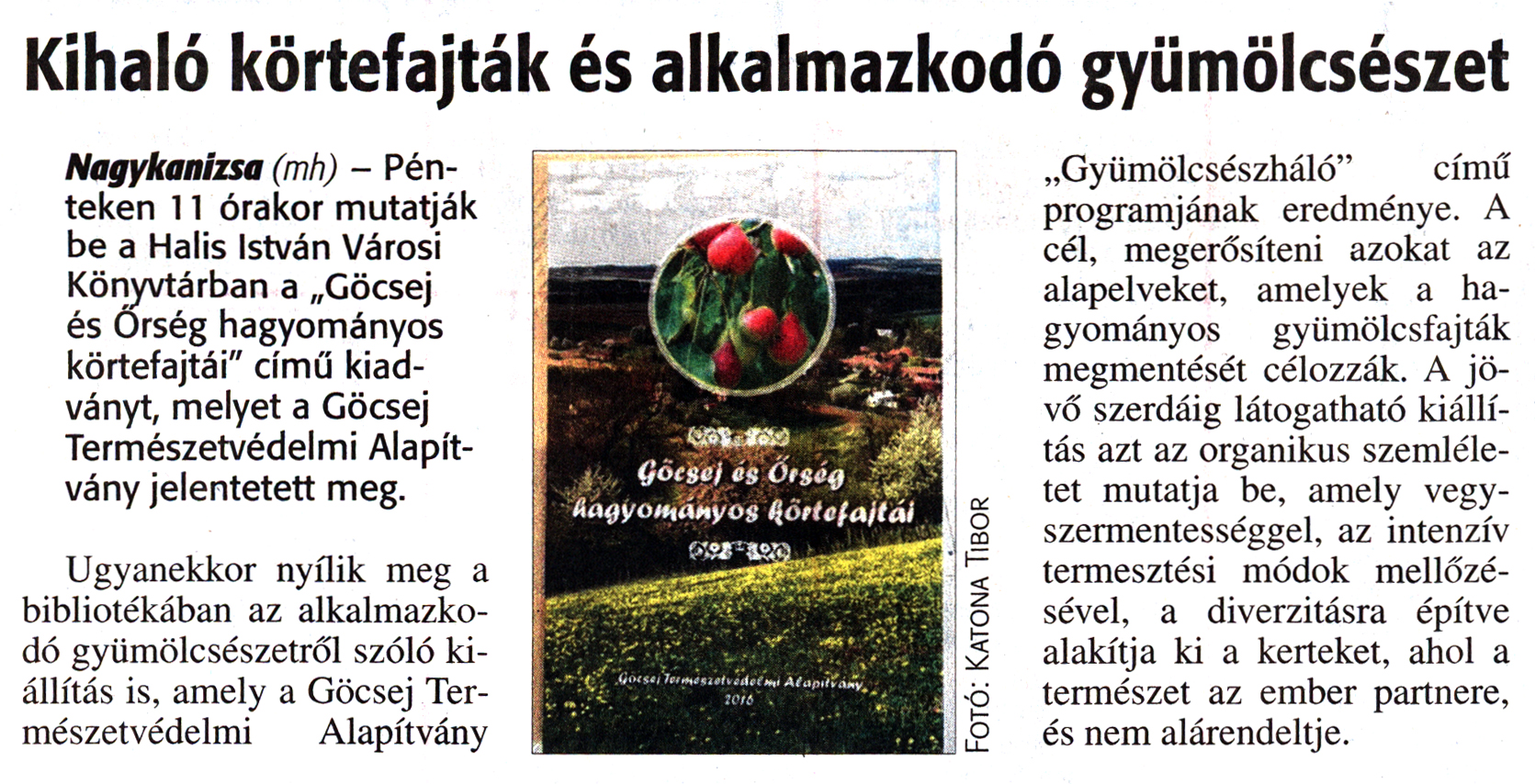 Nyilvános 2074 | 3724 | Zalai Hírlap 2016. június 22. 145. szám 7. oldal | Kihaló körtefajták és alkalmazkodó gyümölcsészet Nagykanizsa (mh) - Pénteken 11 órakor mutatják be a Halis István Városi Könyvtárban a „Göcsej és Őrség hagyományos körtefajtái" című kiadványt, melyet a Göcsej Természetvédelmi Alapítvány jelentetett meg. Ugyanekkor nyílik meg a bibliotékában az alkalmazkodó gyümölcsészetről szóló kiállítás is, amely a Göcsej Természetvédelmi Alapítvány „Gyümölcsészháló" című programjának eredménye. A cél, megerősíteni azokat az alapelveket, amelyek a hagyományos gyümölcsfajták megmentését célozzák. A jövő szerdáig látogatható kiállítás azt az organikus szemléletet mutatja be, amely vegyszermentességgel, az intenzív termesztési módok mellőzésével, a diverzitásra építve alakítja ki a kerteket, ahol a természet az ember partnere, és nem alárendeltje. |