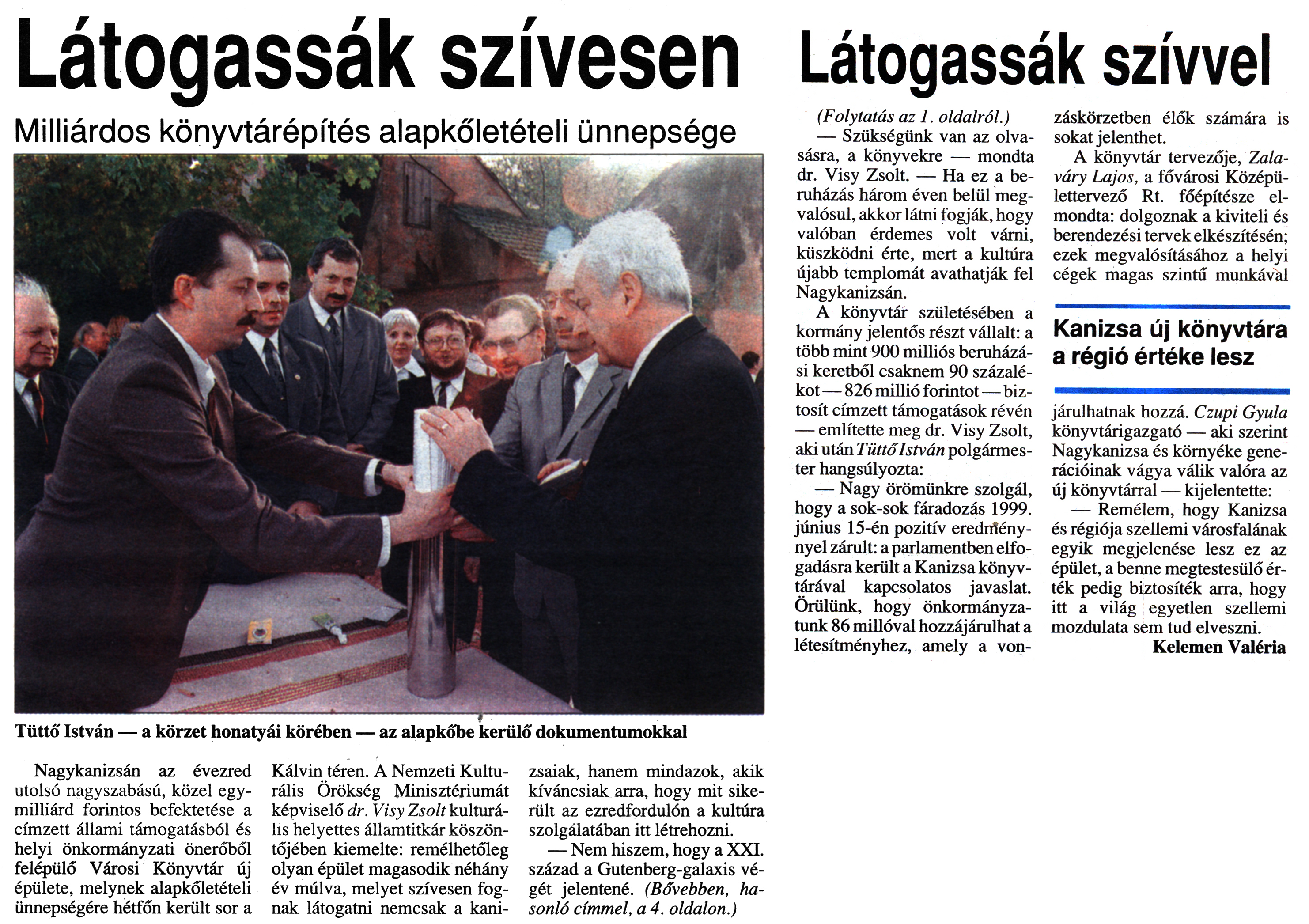 Nyilvános 1813 | 2802 | Zalai Hírlap 1999. október 26. 249. szám 1, 4. oldal - Látogassák szívesen | A cikk szövege: Látogassák szívesen Milliárdos könyvtárépítés alapkőletételi ünnepsége Tüttő István — a körzet honatyái körében — az alapkőbe kerülő dokumentumokkal Nagykanizsán az évezred utolsó nagyszabású, közel egymilliárd forintos befektetése a címzett állami támogatásból és helyi önkormányzati önerőből felépülő Városi Könyvtár új épülete, melynek alapkőletételi ünnepségére hétfőn került sor a Kálvin téren. A Nemzeti Kulturális Örökség Minisztériumát képviselő dr. Visy Zsolt kulturális helyettes államtitkár köszöntőjében kiemelte: remélhetőleg olyan épület magasodik néhány év múlva, melyet szívesen fognak látogatni nemcsak a kanizsaiak, hanem mindazok, akik kíváncsiak arra, hogy mit sikerült az ezredfordulón a kultúra szolgálatában itt létrehozni. — Nem hiszem, hogy a XXI. század a Gutenberg-galaxis végét jelentené. (Bővebben, hasonló címmel, a 4. oldalon.) Látogassák szívvel (Folytatás az 1. oldalról.) — Szükségünk van az olvasásra, a könyvekre — mondta dr. Visy Zsolt. — Ha ez a beruházás három éven belül megvalósul, akkor látni fogják, hogy valóban érdemes volt várni, küszködni érte, mert a kultúra újabb templomát avathatják fel Nagykanizsán. A könyvtár születésében a kormány jelentős részt vállalt: a több mint 900 milliós beruházási keretből csaknem 90 százalékot — 826 millió forintot—biztosít címzett támogatások révén — említette meg dr. Visy Zsolt, aki után Tüttő István polgármester hangsúlyozta: — Nagy örömünkre szolgál, hogy a sok-sok fáradozás 1999. június 15-én pozitív eredménnyel zárult: a parlamentben elfogadásra került a Kanizsa könyvtárával kapcsolatos javaslat. Örülünk, hogy önkormányzatunk 86 millóval hozzájárulhat a létesítményhez, amely a vonzáskörzetben élők számára is sokat jelenthet. A könyvtár tervezője, Zalaváry Lajos, a fővárosi Középülettervező Rt. főépítésze elmondta: dolgoznak a kiviteli és berendezési tervek elkészítésén; ezek megvalósításához a helyi cégek magas szintű munkával járulhatnak hozzá. Czupi Gyula könyvtárigazgató — aki szerint Nagykanizsa és környéke generációinak vágya válik valóra az új könyvtárral — kijelentette: — Remélem, hogy Kanizsa és régiója szellemi városfalának egyik megjelenése lesz ez az épület, a benne megtestesülő érték pedig biztosíték arra, hogy itt a világ egyetlen szellemi mozdulata sem tud elveszni. Kelemen Valéria |