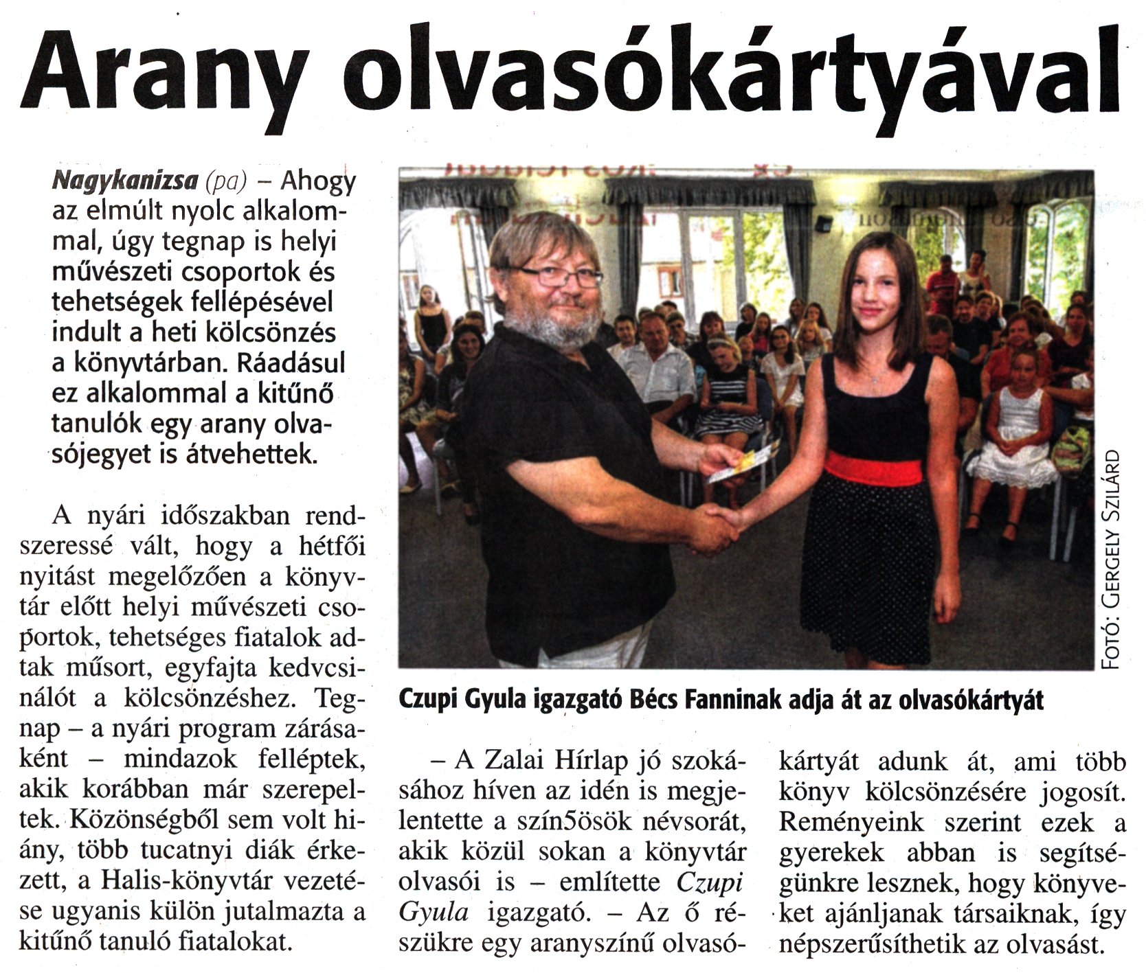 Nyilvános 1926 | 3164 | Zalai Hírlap 2016. augusztus 30. 203. szám 3. oldal | Arany olvasókártyával Nagykanizsa (pa) - Ahogy az elmúlt nyolc alkalommal, úgy tegnap is helyi művészeti csoportok és tehetségek fellépésével indult a heti kölcsönzés a könyvtárban. Ráadásul ez alkalommal a kitűnő tanulók egy arany olvasójegyet is átvehettek. A nyári időszakban rendszeressé vált, hogy a hétfői nyitást megelőzően a könyvtár előtt helyi művészeti csoportok, tehetséges fiatalok adtak műsort, egyfajta kedvcsinálót a kölcsönzéshez. Tegnap - a nyári program zárásaként - mindazok felléptek, akik korábban már szerepeltek. Közönségből sem volt hiány, több tucatnyi diák érkezett, a Halis-könyvtár vezetése ugyanis külön jutalmazta a kitűnő tanuló fiatalokat. Czupi Gyula igazgató Bécs Fanninak adja át az olvasókártyát - A Zalai Hírlap jó szokásához híven az idén is megjelentette a szín5ösök névsorát, akik közül sokan a könyvtár olvasói is - említette Czupi Gyula igazgató. - Az ő részükre egy aranyszínű olvasókártyát adunk át, ami több könyv kölcsönzésére jogosít. Reményeink szerint ezek a gyerekek abban is segítségünkre lesznek, hogy könyveket ajánljanak társaiknak, így népszerűsíthetik az olvasást. |