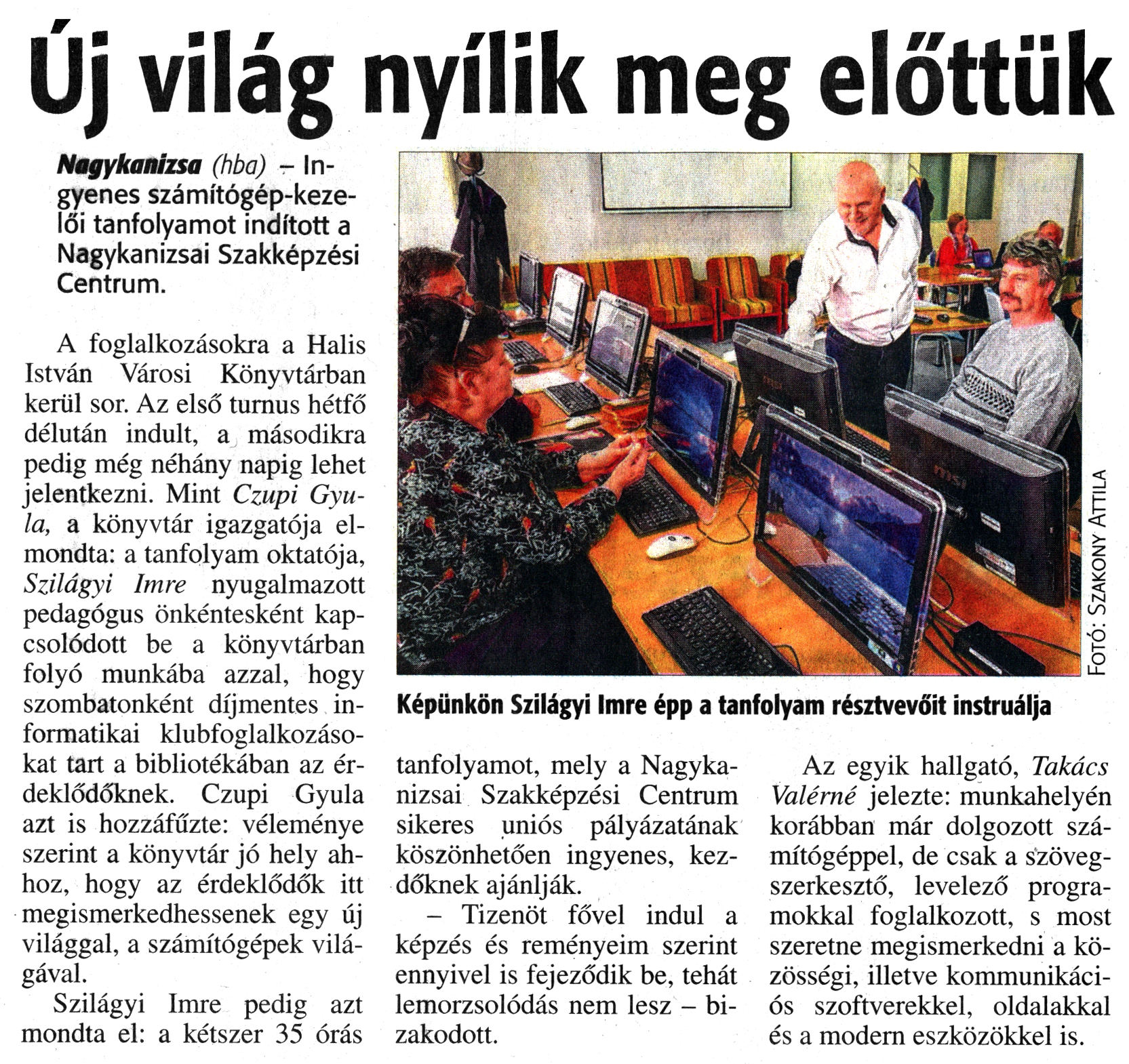Nyilvános 2123 | 3817 | Zalai Hírlap 2017. március 17. 64. szám 3. oldal | Új világ nyílik meg előttük Nagykanizsa (hba) - Ingyenes számítógép-kezelői tanfolyamot indított a Nagykanizsai Szakképzési Centrum. A foglalkozásokra a Halis István Városi Könyvtárban kerül sor. Az első turnus hétfő délután indult, a másodikra pedig még néhány napig lehet jelentkezni. Mint Czupi Gyula, a könyvtár igazgatója elmondta: a tanfolyam oktatója, Szilágyi Imre nyugalmazott pedagógus önkéntesként kapcsolódott be a könyvtárban folyó munkába azzal, hogy szombatonként díjmentes informatikai klubfoglalkozásokat tart a bibliotékában az érdeklődőknek. Czupi Gyula azt is hozzáfűzte: véleménye szerint a könyvtár jó hely ahhoz, hogy az érdeklődők itt megismerkedhessenek egy új világgal, a számítógépek világával. Szilágyi Imre pedig azt mondta el: a kétszer 35 órás tanfolyamot, mely a Nagykanizsai Szakképzési Centrum sikeres uniós pályázatának köszönhetően ingyenes, kezdőknek ajánlják. - Tizenöt fővel indul a képzés és reményeim szerint ennyivel is fejeződik be, tehát lemorzsolódás nem lesz - bizakodott. Az egyik hallgató, Takács Valérné jelezte: munkahelyén korábban már dolgozott számítógéppel, de csak a szövegszerkesztő, levelező programokkal foglalkozott, s most szeretne megismerkedni a közösségi, illetve kommunikációs szoftverekkel, oldalakkal és a modern eszközökkel is. Képünkön Szilágyi Imre épp a tanfolyam résztvevőit instruálja |