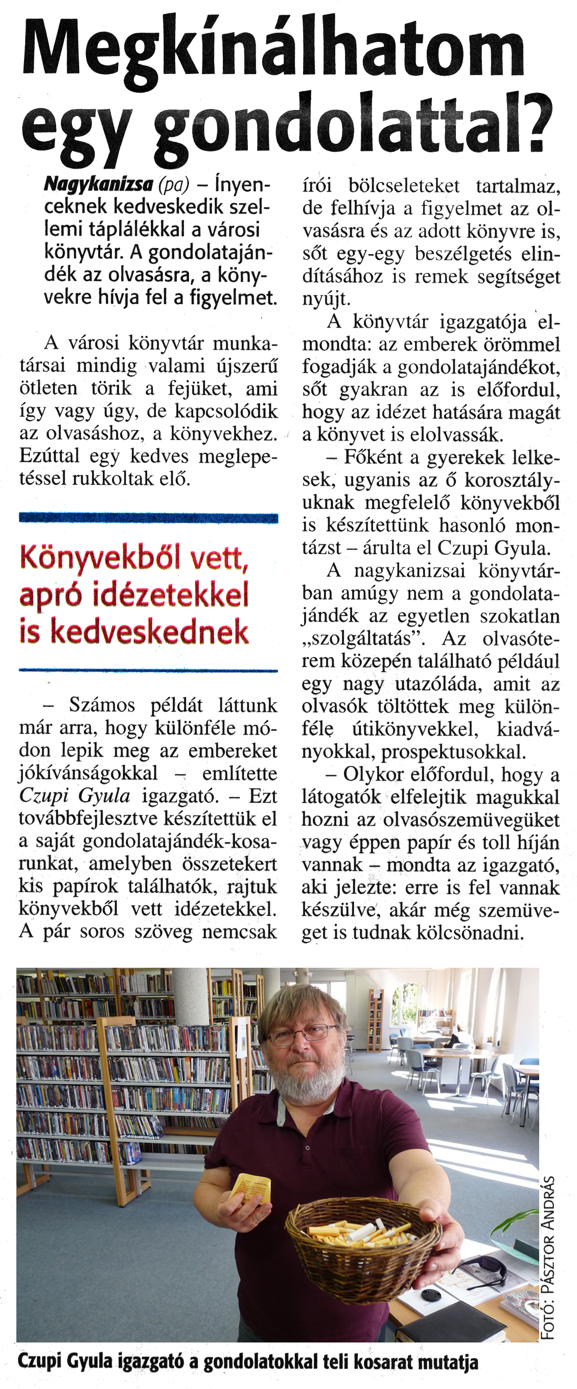 Nyilvános 2169 | 3726 | Zalai Hírlap 2017. március 28. 73. szám 2. oldal | Megkínálhatom egy gondolattal? Nagykanizsa (pa) - Ínyenceknek kedveskedik szellemi táplálékkal a városi könyvtár. A gondolatajándék az olvasásra, a könyvekre hívja fel a figyelmet. A városi könyvtár munkatársai mindig valami újszerű ötleten törik a fejüket, ami így vagy úgy, de kapcsolódik az olvasáshoz, a könyvekhez. Ezúttal egy kedves meglepetéssel rukkoltak elő. Könyvekből vett, apró idézetekkel is kedveskednek - Számos példát láttunk már arra, hogy különféle módon lepik meg az embereket jókívánságokkal - említette Czupi Gyula igazgató. - Ezt továbbfejlesztve készítettük el a saját gondolatajándék-kosarunkat, amelyben összetekert kis papírok találhatók, rajtuk könyvekből vett idézetekkel. A pár soros szöveg nemcsak írói bölcseleteket tartalmaz, de felhívja a figyelmet az olvasásra és az adott könyvre is, sőt egy-egy beszélgetés elindításához is remek segítséget nyújt. A könyvtár igazgatója elmondta: az emberek örömmel fogadják a gondolatajándékot, sőt gyakran az is előfordul, hogy az idézet hatására magát a könyvet is elolvassák. - Főként a gyerekek lelkesek, ugyanis az ő korosztályuknak megfelelő könyvekből is készítettünk hasonló montázst - árulta el Czupi Gyula. A nagykanizsai könyvtárban amúgy nem a gondolatajándék az egyetlen szokatlan „szolgáltatás". Az olvasóterem közepén található például egy nagy utazóláda, amit az olvasók töltöttek meg különféle útikönyvekkel, kiadványokkal, prospektusokkal. - Olykor előfordul, hogy a látogatók elfelejtik magukkal hozni az olvasószemüvegüket vagy éppen papír és toll híján vannak - mondta az igazgató, aki jelezte: erre is fel vannak készülve, akár még szemüveget is tudnak kölcsönadni. Czupi Gyula igazgató a gondolatokkal teli kosarat mutatja |