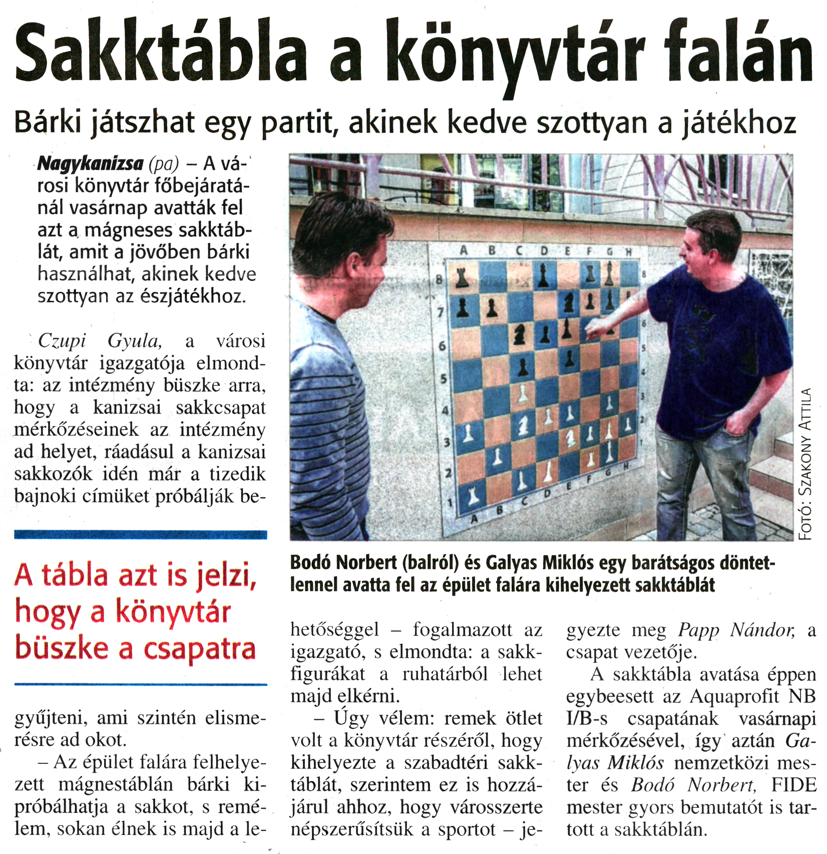 Nyilvános 2098 | 4326 | Zalai Hírlap 2017. április 11. 85. szám 3. oldal | Sakktábla a könyvtár falán Bárki játszhat egy partit, akinek kedve szottyan a játékhoz Bodó Norbert (balról) és Galyas Miklós egy barátságos döntetlennel avatta fel az épület falára kihelyezett sakktáblát Nagykanizsa (pa) - A városi könyvtár főbejáratánál vasárnap avatták fel azt a mágneses sakktáblát, amit a jövőben bárki használhat, akinek kedve szottyan az észjátékhoz. Czupi Gyula, a városi könyvtár igazgatója elmondta: az intézmény büszke arra, hogy a kanizsai sakkcsapat mérkőzéseinek az intézmény ad helyet, ráadásul a kanizsai sakkozók idén már a tizedik bajnoki címüket próbálják begyűjteni, ami szintén elismerésre ad okot. - Az épület falára felhelyezett mágnestáblán bárki kipróbálhatja a sakkot, s remélem, sokan élnek is majd a lehetőséggel - fogalmazott az igazgató, s elmondta: a sakk-figurákat a ruhatárból lehet majd elkérni. - Úgy vélem: remek ötlet volt a könyvtár részéről, hogy kihelyezte a szabadtéri sakktáblát, szerintem ez is hozzájárul ahhoz, hogy városszerte népszerűsítsük a sportot - jegyezte meg Papp Nándor, a csapat vezetője. A sakktábla avatása éppen egybeesett az Aquaprofit NB l/B-s csapatának vasárnapi mérkőzésével, így aztán Galyas Miklós nemzetközi mester és Bodó Norbert, FIDE mester gyors bemutatót is tartott a sakktáblán. Fotó: Szakony Attila |