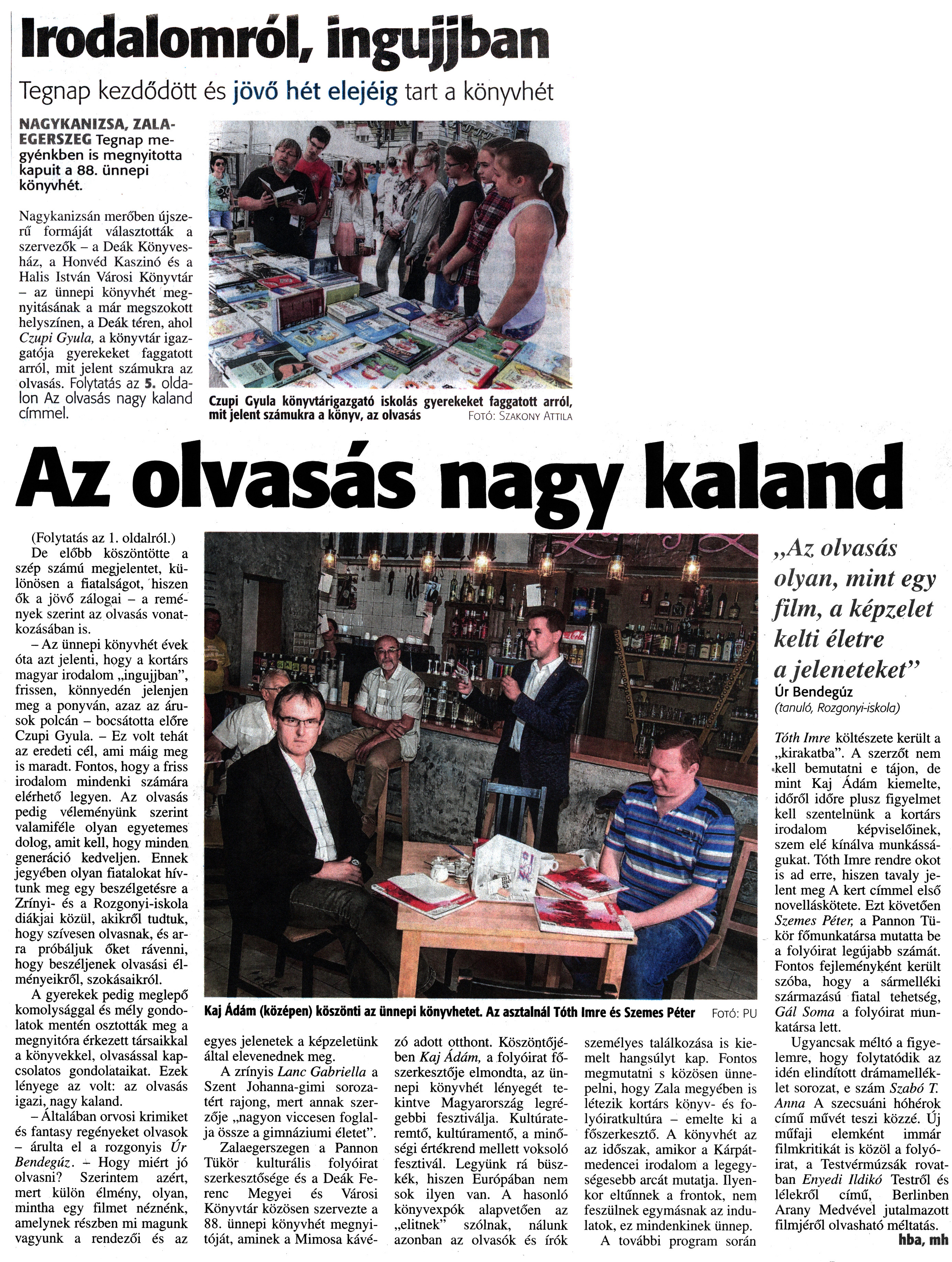 Nyilvános 2066 | 4447 | Zalai Hírlap 2017. június 9. 132. szám 1, 5. oldal - Ünnepi Könyvhét | Irodalomról, ingujjban Tegnap kezdődött és jövő hét elejéig tart a könyvhét NAGYKANIZSA, ZALAEGERSZEG Tegnap megyénkben is megnyitotta kapuit a 88. ünnepi könyvhét. Nagykanizsán merőben újszerű formáját választották a szervezők - a Deák Könyvesház, a Honvéd Kaszinó és a Halis István Városi Könyvtár - az ünnepi könyvhét megnyitásának a már megszokott helyszínen, a Deák téren, ahol Czupi Gyula, a könyvtár igazgatója gyerekeket faggatott arról, mit jelent számukra az olvasás. Folytatás az 5. oldalon Az olvasás nagy kaland Czupi Gyula könyvtárigazgató iskolás gyerekeket faggatott arról, címmel. mit jelent számukra a könyv, az olvasás Fotó: Szakony Attila Az olvasás nagy kaland (Folytatás az 1. oldalról.) De előbb köszöntötte a szép számú megjelentet, különösen a fiatalságot, hiszen ők a jövő zálogai - a remények szerint az olvasás vonatkozásában is. - Az ünnepi könyvhét évek óta azt jelenti, hogy a kortárs magyar irodalom „ingujjban", frissen, könnyedén jelenjen meg a ponyván, azaz az árusok polcán - bocsátotta előre Czupi Gyula. - Ez volt tehát az eredeti cél, ami máig meg is maradt. Fontos, hogy a friss irodalom mindenki számára elérhető legyen. Az olvasás pedig véleményünk szerint valamiféle olyan egyetemes dolog, amit kell, hogy minden generáció kedveljen. Ennek jegyében olyan fiatalokat hívtunk meg egy beszélgetésre a Zrínyi- és a Rozgonyi-iskola diákjai közül, akikről tudtuk, hogy szívesen olvasnak, és arra próbáljuk őket rávenni, hogy beszéljenek olvasási élményeikről, szokásaikról. A gyerekek pedig meglepő komolysággal és mély gondolatok mentén osztották meg a megnyitóra érkezett társaikkal a könyvekkel, olvasással kapcsolatos gondolataikat. Ezek lényege az volt: az olvasás igazi, nagy kaland. - Általában orvosi krimiket és fantasy regényeket olvasok - árulta el a rozgonyis Úr Bendegúz. - Hogy miért jó olvasni? Szerintem azért, mert külön élmény, olyan, mintha egy filmet néznénk, amelynek részben mi magunk vagyunk a rendezői és az egyes jelenetek a képzeletünk által elevenednek meg. A zrínyis Lanc Gabriella a Szent Johanna-gimi sorozatért rajong, mert annak szerzője „nagyon viccesen foglalja össze a gimnáziumi életet". Zalaegerszegen a Pannon Tükör kulturális folyóirat szerkesztősége és a Deák Ferenc Megyei és Városi Könyvtár közösen szervezte a 88. ünnepi könyvhét megnyitóját, aminek a Mimosa kávézó adott otthont. Köszöntőjében Kaj Ádám, a folyóirat főszerkesztője elmondta, az ünnepi könyvhét lényegét tekintve Magyarország legrégebbi fesztiválja. Kultúrateremtő, kultúramentő, a minőségi értékrend mellett voksoló fesztivál. Legyünk rá büszkék, hiszen Európában nem sok ilyen van. A hasonló könyvexpók alapvetően az „elitnek" szólnak, nálunk azonban az olvasók és írók személyes találkozása is kiemelt hangsúlyt kap. Fontos megmutatni s közösen ünnepelni, hogy Zala megyében is létezik kortárs könyv- és folyóiratkultúra - emelte ki a főszerkesztő. A könyvhét az az időszak, amikor a Kárpátmedencei irodalom a legegységesebb arcát mutatja. Ilyenkor eltűnnek a frontok, nem feszülnek egymásnak az indulatok, ez mindenkinek ünnep. A további program során Tóth Imre költészete került a „kirakatba". A szerzőt nem kell bemutatni e tájon, de mint Kaj Ádám kiemelte, időről időre plusz figyelmet kell szentelnünk a kortárs irodalom képviselőinek, szem elé kínálva munkásságukat. Tóth Imre rendre okot is ad erre, hiszen tavaly jelent meg A kert címmel első novelláskötete. Ezt követően Szemes Péter, a Pannon Tükör főmunkatársa mutatta be a folyóirat legújabb számát. Fontos fejleményként került szóba, hogy a sármelléki származású fiatal tehetség, Gál Soma a folyóirat munkatársa lett. Ugyancsak méltó a figyelemre, hogy folytatódik az idén elindított drámamelléklet sorozat, e szám Szabó T. Anna A szecsuáni hóhérok című művét teszi közzé. Új műfaji elemként immár filmkritikát is közöl a folyóirat, a Testvérmúzsák rovatban Enyedi Ildikó Testről és lélekről című, Berlinben Arany Medvével jutalmazott filmjéről olvasható méltatás. hba, mh |