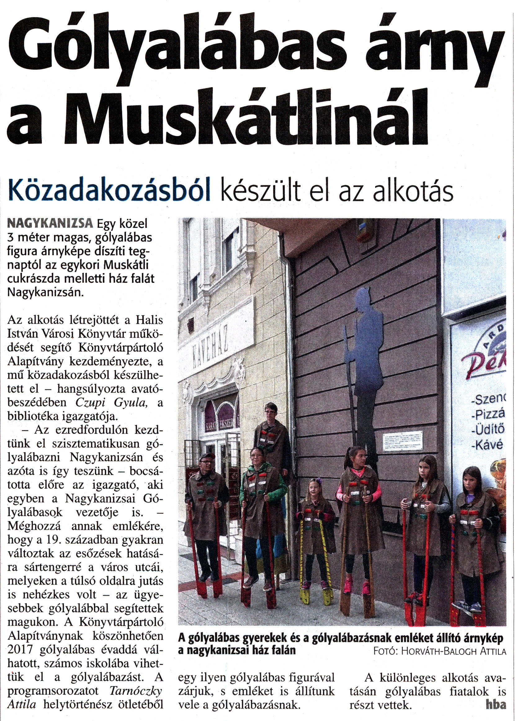 Nyilvános 2105 | 3815 | Zalai Hírlap 2017. október 7. 235. szám 16. oldal | Gólyalábas árny a Muskátlinál Közadakozásból készült el az alkotás NAGYKANIZSA Egy közel 3 méter magas, gólyalábas figura árnyképe díszíti tegnaptól az egykori Muskátli cukrászda melletti ház falát Nagykanizsán. Az alkotás létrejöttét a Halis István Városi Könyvtár működését segítő Könyvtárpártoló Alapítvány kezdeményezte, a mű közadakozásból készülhetett el - hangsúlyozta avatóbeszédében Czupi Gyula, a bibliotéka igazgatója. - Az ezredfordulón kezdtünk el szisztematikusan gólyalábazni Nagykanizsán és azóta is így teszünk - bocsátotta előre az igazgató, aki egyben a Nagykanizsai Gólyalábasok vezetője is. - Méghozzá annak emlékére, hogy a 19. században gyakran változtak az esőzések hatására sártengerré a város utcái, melyeken a túlsó oldalra jutás is nehézkes volt - az ügyesebbek gólyalábbal segítettek magukon. A Könyvtárpártoló Alapítványnak köszönhetően 2017 gólyalábas évaddá válhatott, számos iskolába vihettük el a gólyalábazást. A programsorozatot Tarnóczky Attila helytörténész ötletéből egy ilyen gólyalábas figurával zárjuk, s emléket is állítunk vele a gólyalábazásnak. A különleges alkotás avatásán gólyalábas fiatalok is részt vettek. hba A gólyalábas gyerekek és a gólyalábazásnak emléket állító árnykép a nagykanizsai ház falán Fotó: Horváth-Balogh Attila A cikk online változata: https://www.zaol.hu/kozelet/helyi-kozelet/kozadakozasbol-keszult-el-kulonleges-golyalabas-figura-2165943/ |