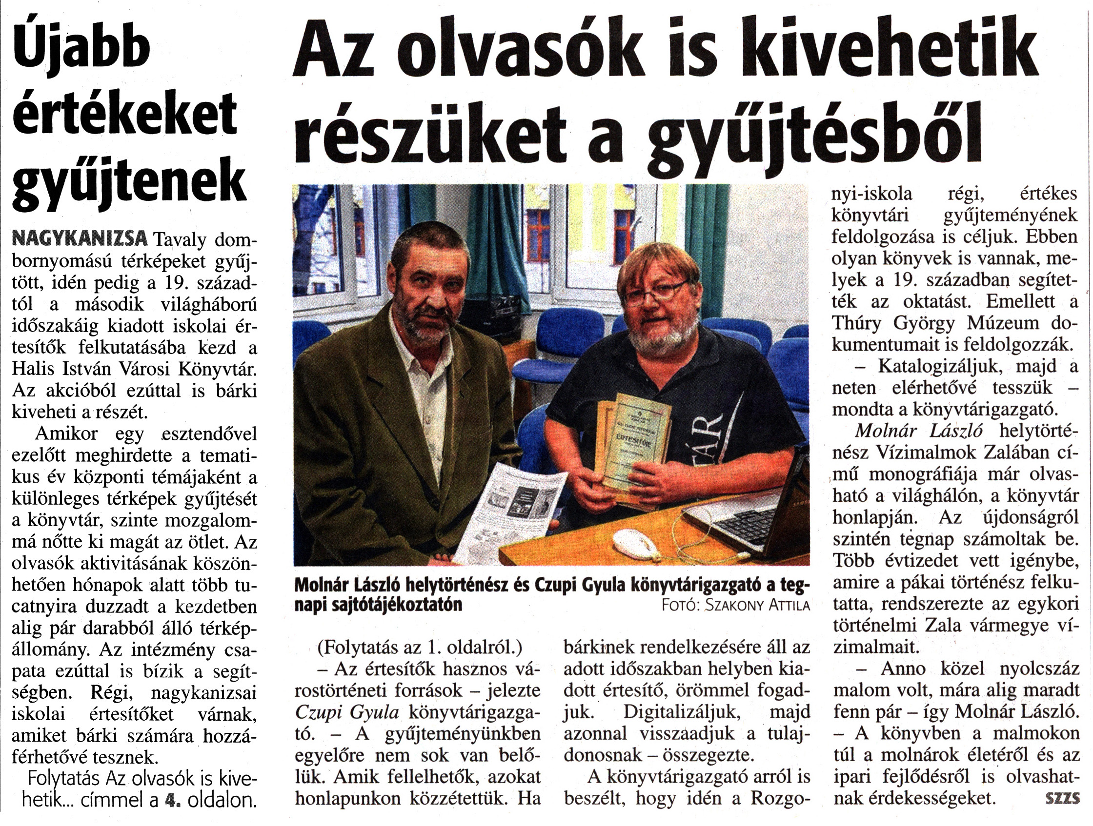 Nyilvános 2177 | 3437 | Zalai Hírlap 2018. január 3. 2. szám 1, 4. oldal | Újabb értékeket gyűjtenek NAGYKANIZSA Tavaly dombornyomású térképeket gyűjtött, idén pedig a 19. századtól a második világháború időszakáig kiadott iskolai értesítők felkutatásába kezd a Halis István Városi Könyvtár. Az akcióból ezúttal is bárki kiveheti a részét. Amikor egy esztendővel ezelőtt meghirdette a tematikus év központi témájaként a különleges térképek gyűjtését a könyvtár, szinte mozgalommá nőtte ki magát az ötlet. Az olvasók aktivitásának köszönhetően hónapok alatt több tucatnyira duzzadt a kezdetben alig pár darabból álló térképállomány. Az intézmény csapata ezúttal is bízik a segítségben. Régi, nagykanizsai iskolai értesítőket várnak, amiket bárki számára hozzáférhetővé tesznek. Folytatás Az olvasók is kivehetik... címmel a 4. oldalon. Az olvasók is kivehetik részüket a gyűjtésből Molnár László helytörténész és Czupi Gyula könyvtárigazgató a tegnapi sajtótájékoztatón Fotó: Szakony Attila (Folytatás az 1. oldalról.) - Az értesítők hasznos várostörténeti források - jelezte Czupi Gyula könyvtárigazgató. - A gyűjteményünkben egyelőre nem sok van belőlük. Amik fellelhetők, azokat honlapunkon közzétettük. Ha bárkinek rendelkezésére áll az adott időszakban helyben kiadott értesítő, örömmel fogadjuk. Digitalizáljuk, majd azonnal visszaadjuk a tulajdonosnak - összegezte. A könyvtárigazgató arról is beszélt, hogy idén a Rozgonyi-iskola régi, értékes könyvtári gyűjteményének feldolgozása is céljuk. Ebben olyan könyvek is vannak, melyek a 19. században segítették az oktatást. Emellett a Thúry György Múzeum dokumentumait is feldolgozzák. - Katalogizáljuk, majd a neten elérhetővé tesszük - mondta a könyvtárigazgató. Molnár László helytörténész Vízimalmok Zalában című monográfiája már olvasható a világhálón, a könyvtár honlapján. Az újdonságról szintén tegnap számoltak be. Több évtizedet vett igénybe, amire a pákai történész felkutatta, rendszerezte az egykori történelmi Zala vármegye vízimalmait. - Anno közel nyolcszáz malom volt, mára alig maradt fenn pár - így Molnár László. - A könyvben a malmokon túl a molnárok életéről és az ipari fejlődésről is olvashatnak érdekességeket. SZZS |