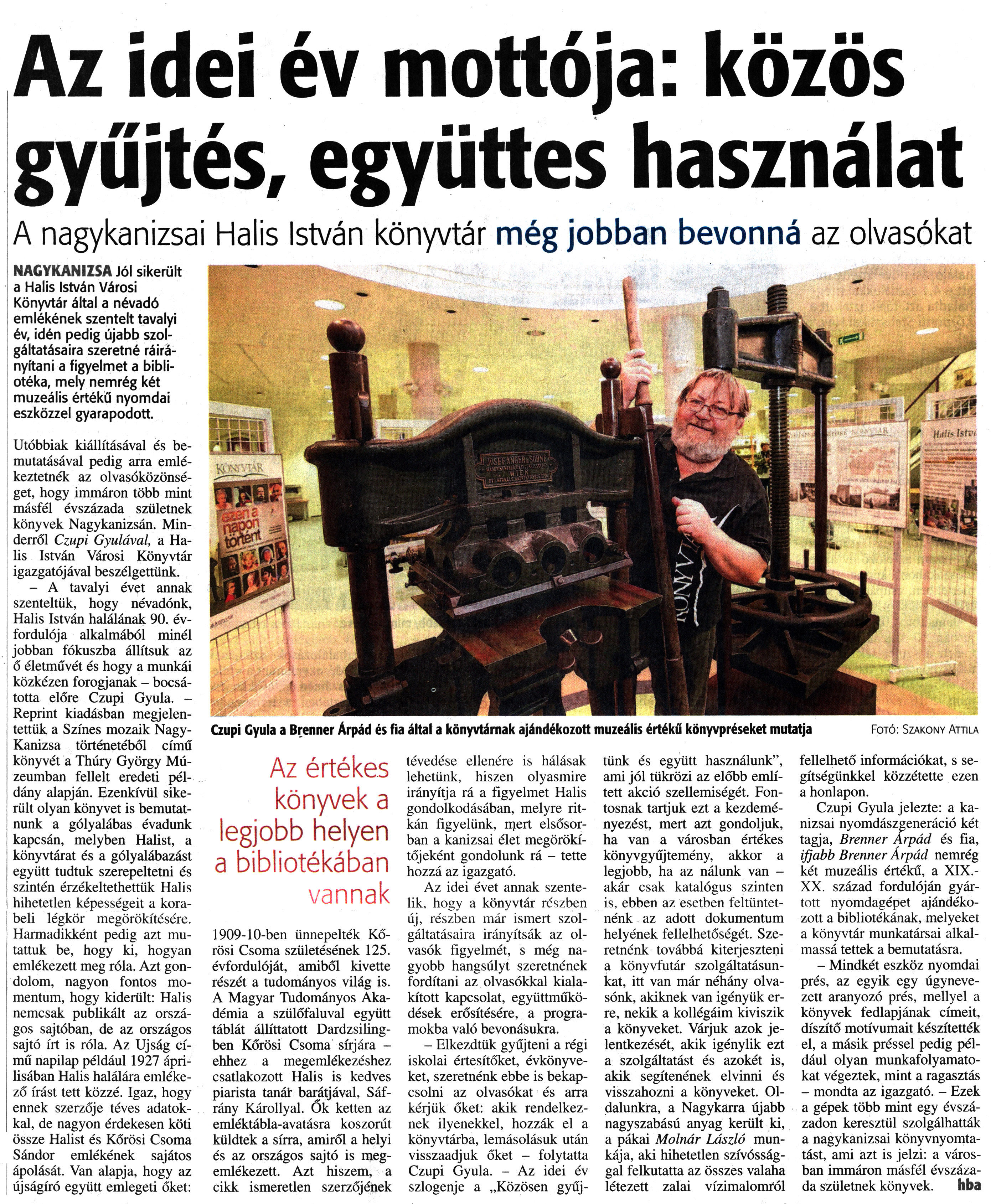 Nyilvános 2060 | 3833 | Zalai Hírlap 2018. január 29. 24. szám 6. oldal - Az idei év mottója | Az idei év mottója: közös gyűjtés, együttes használat A nagykanizsai Halis István könyvtár még jobban bevonná az olvasókat Czupi Gyula a Brenner Árpád és fia által a könyvtárnak ajándékozott muzeális értékű könyvpréseket mutatja Fotó: Szakony Attila NAGYKANIZSA Jól sikerült a Halis István Városi Könyvtár által a névadó emlékének szentelt tavalyi év, idén pedig újabb szolgáltatásaira szeretné ráirányítani a figyelmet a bibliotéka, mely nemrég két muzeális értékű nyomdai eszközzel gyarapodott. Utóbbiak kiállításával és bemutatásával pedig arra emlékeztetnék az olvasóközönséget, hogy immáron több mint másfél évszázada születnek könyvek Nagykanizsán. Minderről Czupi Gyulával, a Halis István Városi Könyvtár igazgatójával beszélgettünk. - A tavalyi évet annak szenteltük, hogy névadónk, Halis István halálának 90. évfordulója alkalmából minél jobban fókuszba állítsuk az ő életművét és hogy a munkái közkézen forogjanak - bocsátotta előre Czupi Gyula. -Reprint kiadásban megjelentettük a Színes mozaik Nagy-Kanizsa történetéből című könyvét a Thúry György Múzeumban fellelt eredeti példány alapján. Ezenkívül sikerült olyan könyvet is bemutatnunk a gólyalábas évadunk kapcsán, melyben Halist, a könyvtárat és a gólyalábazást együtt tudtuk szerepeltetni és szintén érzékeltethettük Halis hihetetlen képességeit a korabeli légkör megörökítésére. Harmadikként pedig azt mutattuk be, hogy ki, hogyan emlékezett meg róla. Azt gondolom, nagyon fontos momentum, hogy kiderült: Halis nemcsak publikált az országos sajtóban, de az országos sajtó írt is róla. Az Újság című napilap például 1927 áprilisában Halis halálára emlékező írást tett közzé. Igaz, hogy ennek szerzője téves adatokkal, de nagyon érdekesen köti össze Halist és Kőrösi Csoma Sándor emlékének sajátos ápolását. Van alapja, hogy az újságíró együtt emlegeti őket: Az értékes könyvek a legjobb helyen a bibliotékában vannak 1909-10-ben ünnepelték Kőrösi Csoma születésének 125. évfordulóját, amiből kivette részét a tudományos világ is. A Magyar Tudományos Akadémia a szülőfaluval együtt táblát állíttatott Dardzsiling-ben Kőrösi Csoma sírjára -ehhez a megemlékezéshez csatlakozott Halis is kedves piarista tanát barátjával, Sáfrány Károllyal. Ők ketten az emléktábla-avatásra koszorút küldtek a sírra, amiről a helyi és az országos sajtó is megemlékezett. Azt hiszem, a cikk ismeretlen szerzőjének tévedése ellenére is hálásak lehetünk, hiszen olyasmire irányítja rá a figyelmet Halis gondolkodásában, melyre ritkán figyelünk, mert elsősorban a kanizsai élet megörökítőjeként gondolunk rá - tette hozzá az igazgató. Az idei évet annak szentelik, hogy a könyvtár részben új, részben már ismert szolgáltatásaira irányítsák az olvasók figyelmét, s még nagyobb hangsúlyt szeretnének fordítani az olvasókkal kialakított kapcsolat, együttműködések erősítésére, a programokba való bevonásukra. - Elkezdtük gyűjteni a régi iskolai értesítőket, évkönyveket, szeretnénk ebbe is bekapcsolni az olvasókat és arra kérjük őket: akik rendelkeznek ilyenekkel, hozzák el a könyvtárba, lemásolásuk után visszaadjuk őket - folytatta Czupi Gyula. - Az idei év szlogenje a „Közösen gyűjtünk és együtt használunk", ami jól tükrözi az előbb említett akció szellemiségét. Fontosnak tartjuk ezt a kezdeményezést, mert azt gondoljuk, ha van a városban értékes könyvgyűjtemény, akkor a legjobb, ha az nálunk van -akár csak katalógus szinten is, ebben az esetben feltüntetnénk az adott dokumentum helyének fellelhetőségét. Szeretnénk továbbá kiterjeszteni a könyvfutár szolgáltatásunkat, itt van már néhány olvasónk, akiknek van igényük erre, nekik a kollégáim kiviszik a könyveket. Várjuk azok jelentkezését, akik igénylik ezt a szolgáltatást és azokét is, akik segítenének elvinni és visszahozni a könyveket. Oldalunkra, a Nagykarra újabb nagyszabású anyag került ki, a pákai Molnár László munkája, aki hihetetlen szívóssággal felkutatta az összes valaha létezett zalai vízimalomról fellelhető információkat, s segítségünkkel közzétette ezen a honlapon. Czupi Gyula jelezte: a kanizsai nyomdászgeneráció két tagja, Brenner Árpád és fia, ifjabb Brenner Árpád nemrég két muzeális értékű, a XIX.-XX. század fordulóján gyártott nyomdagépet ajándékozott a bibliotékának, melyeket a könyvtár munkatársai alkalmassá tettek a bemutatásra. - Mindkét eszköz nyomdai prés, az egyik egy úgynevezett aranyozó prés, mellyel a könyvek fedlapjának címeit, díszítő motívumait készítették el, a másik préssel pedig például olyan munkafolyamatokat végeztek, mint a ragasztás - mondta az igazgató. - Ezek a gépek több mint egy évszázadon keresztül szolgálhatták a nagykanizsai könyvnyomtatást, ami azt is jelzi: a városban immáron másfél évszázada születnek könyvek. hba |