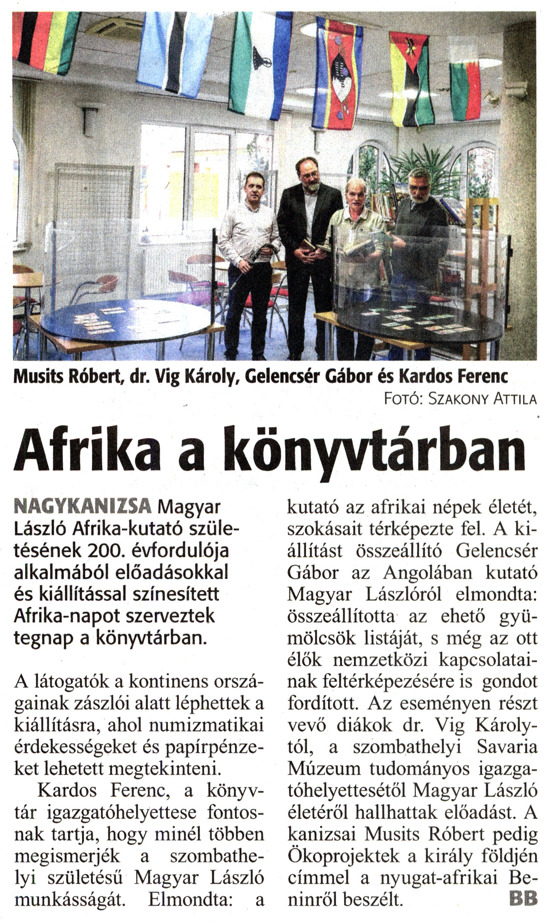 Nyilvános 1964 | 3020 | Zalai Hírlap 2018. november 14. 264. szám 4. oldal - Afrika a könyvtárban | Musits Róbert, dr. Vig Károly, Gelencsér Gábor és Kardos Ferenc Fotó: Szakony Attila Afrika a könyvtárban NAGYKANIZSA Magyar László Afrika-kutató születésének 200. évfordulója alkalmából előadásokkal és kiállítással színesített Afrika-napot szerveztek tegnap a könyvtárban. A látogatók a kontinens országainak zászlói alatt léphettek a kiállításra, ahol numizmatikai érdekességeket és papírpénzeket lehetett megtekinteni. Kardos Ferenc, a könyvtár igazgatóhelyettese fontosnak tartja, hogy minél többen megismerjék a szombathelyi születésű Magyar László munkásságát. Elmondta: a kutató az afrikai népek életét, szokásait térképezte fel. A kiállítást összeállító Gelencsér Gábor az Angolában kutató Magyar Lászlóról elmondta: összeállította az ehető gyümölcsök listáját, s még az ott élők nemzetközi kapcsolatainak feltérképezésére is gondot fordított. Az eseményen részt vevő diákok dr. Vig Károlytól, a szombathelyi Savaria Múzeum tudományos igazgatóhelyettesétől Magyar László életéről hallhattak előadást. A kanizsai Musits Róbert pedig Ökoprojektek a király földjén címmel a nyugat-afrikai Beninről beszélt. BB |