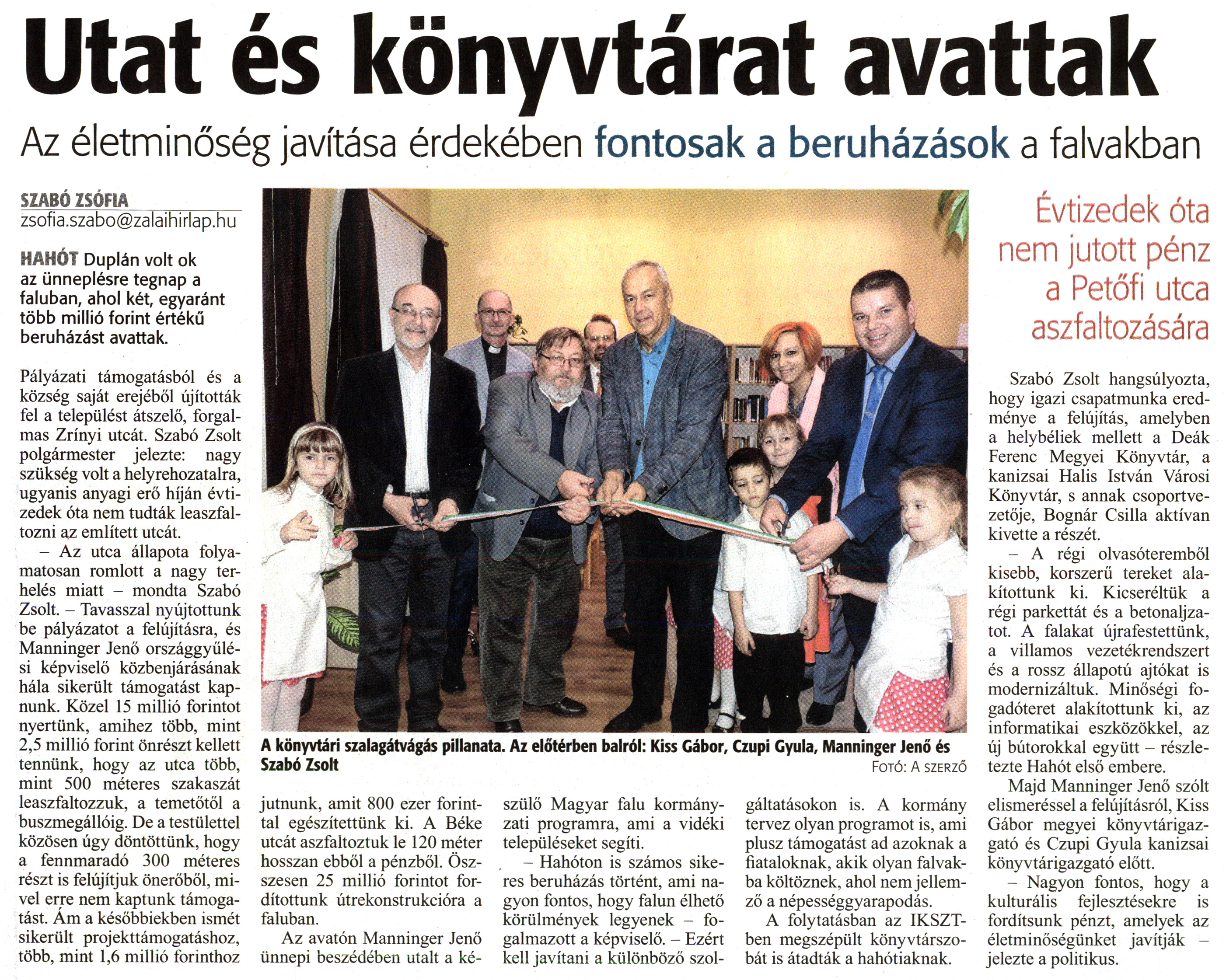 Nyilvános 1861 | 2904 | Zalai Hírlap 2018. november 24. 273. szám 3. oldal | Utat és könyvtárat avattak Az életminőség javítása érdekében fontosak a beruházások a falvakban A könyvtári szalagátvágás pillanata. Az előtérben balról: Kiss Gábor, Czupi Gyula, Manninger Jenő és Szabó Zsolt Fotó: A szerző SZABÓ ZSÓFIA_______ zsofia.szabo@zalaihirlap.hu HAHÓT Duplán volt ok az ünneplésre tegnap a faluban, ahol két, egyaránt több millió forint értékű beruházást avattak. Pályázati támogatásból és a község saját erejéből újították fel a települést átszelő, forgalmas Zrínyi utcát. Szabó Zsolt polgármester jelezte: nagy szükség volt a helyrehozatalra, ugyanis anyagi erő híján évtizedek óta nem tudták leaszfaltozni az említett utcát. - Az utca állapota folyamatosan romlott a nagy terhelés miatt - mondta Szabó Zsolt. - Tavasszal nyújtottunk be pályázatot a felújításra, és Manninger Jenő országgyűlési képviselő közbenjárásának hála sikerült támogatást kapnunk. Közel 15 millió forintot nyertünk, amihez több, mint 2,5 millió forint önrészt kellett tennünk, hogy az utca több, mint 500 méteres szakaszát leaszfaltozzuk, a temetőtől a buszmegállóig. De a testülettel közösen úgy döntöttünk, hogy a fennmaradó 300 méteres részt is felújítjuk önerőből, mivel erre nem kaptunk támogatást. Ám a későbbiekben ismét sikerült projekttámogatáshoz, több, mint 1,6 millió forinthoz jutnunk, amit 800 ezer forinttal egészítettünk ki. A Béke utcát aszfaltoztuk le 120 méter hosszan ebből a pénzből. Összesen 25 millió forintot fordítottunk útrekonstrukcióra a faluban. Az avatón Manninger Jenő ünnepi beszédében utalt a ké- szülő Magyar falu kormányzati programra, ami a vidéki településeket segíti. - Hahóton is számos sikeres beruházás történt, ami nagyon fontos, hogy falun élhető körülmények legyenek - fogalmazott a képviselő. - Ezért kell javítani a különböző szol- gáltatásokon is. A kormány tervez olyan programot is, ami plusz támogatást ad azoknak a fiataloknak, akik olyan falvakba költöznek, ahol nem jellemző a népességgyarapodás. A folytatásban az IKSZT-ben megszépült könyvtárszobát is átadták a hahótiaknak. Évtizedek óta nem jutott pénz a Petőfi utca aszfaltozására Szabó Zsolt hangsúlyozta, hogy igazi csapatmunka eredménye a felújítás, amelyben a helybéliek mellett a Deák Ferenc Megyei Könyvtár, a kanizsai Halis István Városi Könyvtár, s annak csoportvezetője, Bognár Csilla aktívan kivette a részét. - A régi olvasóteremből kisebb, korszerű tereket alakítottunk ki. Kicseréltük a régi parkettát és a betonaljzatot. A falakat újrafestettünk, a villamos vezetékrendszert és a rossz állapotú ajtókat is modernizáltuk. Minőségi fogadóteret alakítottunk ki, az informatikai eszközökkel, az új bútorokkal együtt - részletezte Hahót első embere. Majd Manninger Jenő szólt elismeréssel a felújításról, Kiss Gábor megyei könyvtárigazgató és Czupi Gyula kanizsai könyvtárigazgató előtt. - Nagyon fontos, hogy a kulturális fejlesztésekre is fordítsunk pénzt, amelyek az életminőségünket javítják - jelezte a politikus. |