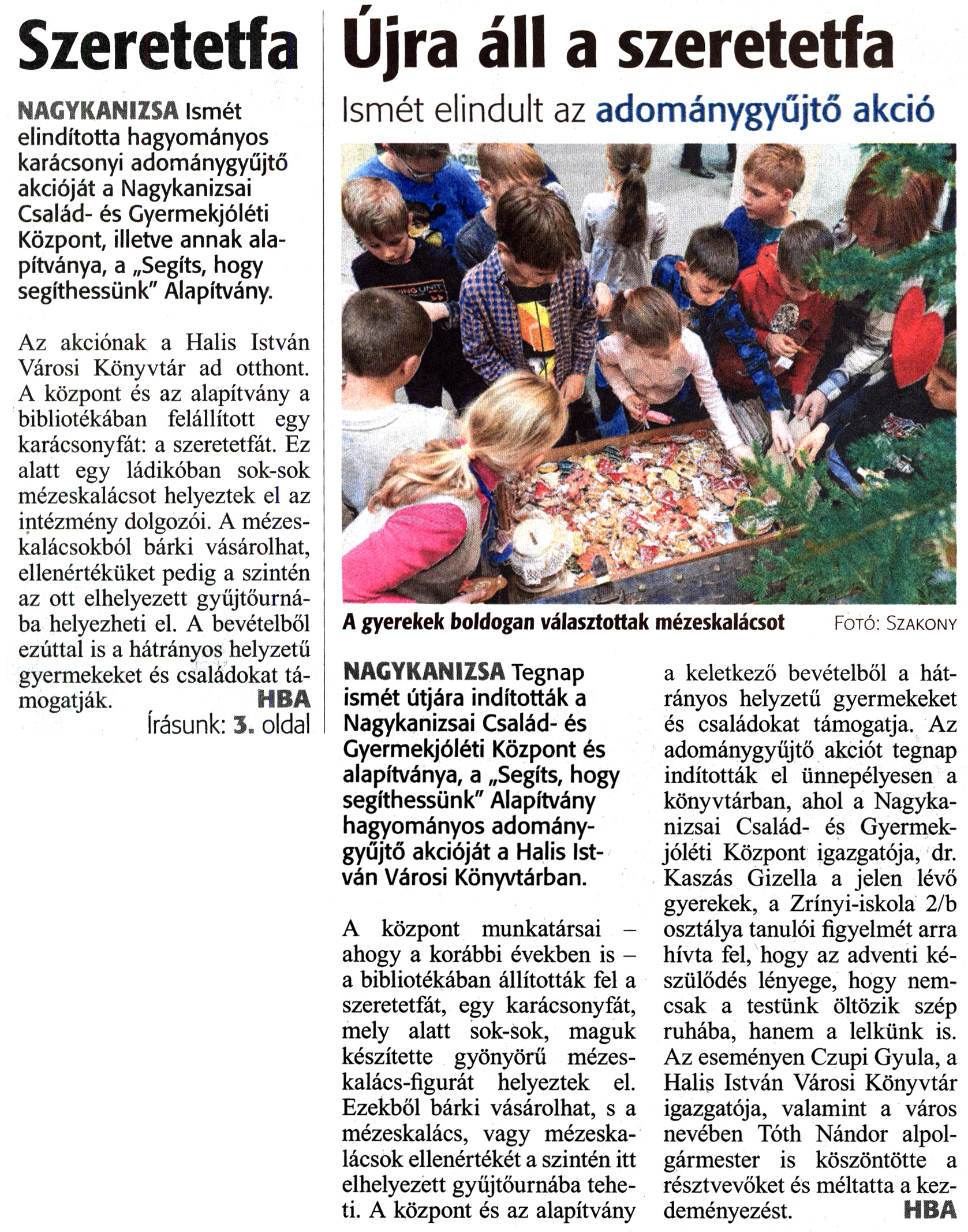Nyilvános 1853 | 2995 | Zalai Hírlap 2018. december 4. 281. szám 1, 3. oldal | Szeretetfa Újra áll a szeretetfa Ismét elindult az adománygyűjtő akció A gyerekek boldogan választottak mézeskalácsot Fotó: Szakony NAGYKANIZSA Ismét elindította hagyományos karácsonyi adománygyűjtő akcióját a Nagykanizsai Család- és Gyermekjóléti Központ, illetve annak alapítványa, a „Segíts, hogy segíthessünk" Alapítvány. Az akciónak a Halis István Városi Könyvtár ad otthont. A központ és az alapítvány a bibliotékában felállított egy karácsonyfát: a szeretetfát. Ez alatt egy ládikóban sok-sok mézeskalácsot helyeztek el az intézmény dolgozói. A mézeskalácsokból bárki vásárolhat, ellenértéküket pedig a szintén az ott elhelyezett gyűjtőurná-ba helyezheti el. A bevételből ezúttal is a hátrányos helyzetű gyermekeket és családokat támogatják. HBA írásunk: 3. oldal NAGYKANIZSA Tegnap ismét útjára indították a Nagykanizsai Család- és Gyermekjóléti Központ és alapítványa, a „Segíts, hogy segíthessünk" Alapítvány hagyományos adománygyűjtő akcióját a Halis István Városi Könyvtárban. A központ munkatársai -ahogy a korábbi években is -a bibliotékában állították fel a szeretetfát, egy karácsonyfát, mely alatt sok-sok, maguk készítette gyönyörű mézeskalács-figurát helyeztek el. Ezekből bárki vásárolhat, s a mézeskalács, vagy mézeskalácsok ellenértékét a szintén itt elhelyezett gyűjtőurnába teheti. A központ és az alapítvány a keletkező bevételből a hátrányos helyzetű gyermekeket és családokat támogatja. Az adománygyűjtő akciót tegnap indították el ünnepélyesen a könyvtárban, ahol a Nagykanizsai Család- és Gyermekjóléti Központ igazgatója, dr. Kaszás Gizella a jelen lévő gyerekek, a Zrínyi-iskola 2/b osztálya tanulói figyelmét arra hívta fel, hogy az adventi készülődés lényege, hogy nemcsak a testünk öltözik szép ruhába, hanem a lelkünk is. Az eseményen Czupi Gyula, a Halis István Városi Könyvtár igazgatója, valamint a város nevében Tóth Nándor alpolgármester is köszöntötte a résztvevőket és méltatta a kezdeményezést. HBA |