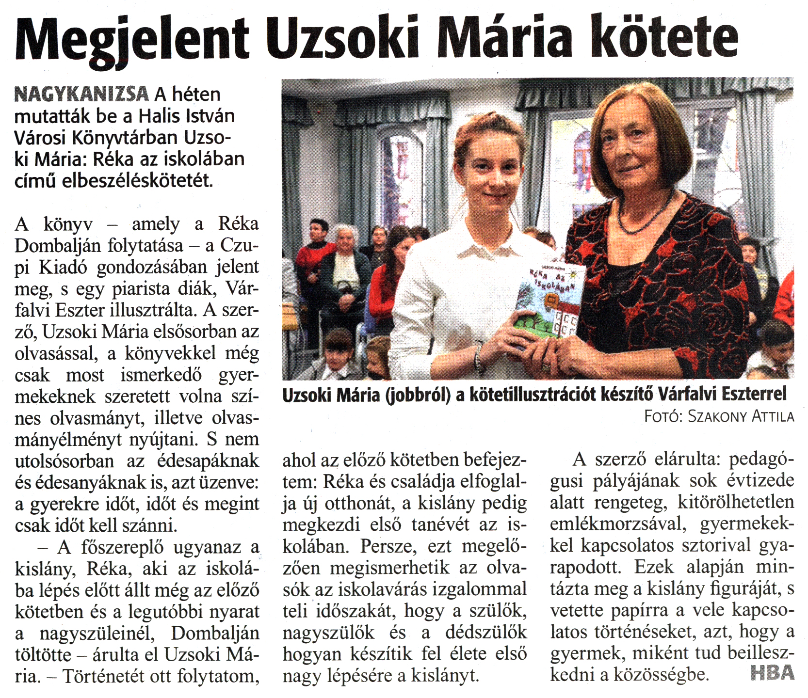Nyilvános 1884 | 3113 | Zalai Hírlap 2018. december 20. 295. szám 6. oldal | Megjelent Uzsoki Mária kötete NAGYKANIZSA A héten mutatták be a Halis István Városi Könyvtárban Uzsoki Mária: Réka az iskolában című elbeszéléskötetét. A könyv - amely a Réka Dombalján folytatása - a Czupi Kiadó gondozásában jelent meg, s egy piarista diák, Várfalvi Eszter illusztrálta. A szerző, Uzsoki Mária elsősorban az olvasással, a könyvekkel még csak most ismerkedő gyermekeknek szeretett volna színes olvasmányt, illetve olvasmányélményt nyújtani. S nem utolsósorban az édesapáknak és édesanyáknak is, azt üzenve: a gyerekre időt, időt és megint csak időt kell szánni. - A főszereplő ugyanaz a kislány, Réka, aki az iskolába lépés előtt állt még az előző kötetben és a legutóbbi nyarat a nagyszüleinél, Dombalján töltötte - árulta el Uzsoki Mária. - Történetét ott folytatom, ahol az előző kötetben befejeztem: Réka és családja elfoglalja új otthonát, a kislány pedig megkezdi első tanévét az iskolában. Persze, ezt megelőzően megismerhetik az olvasók az iskolavárás izgalommal teli időszakát, hogy a szülők, nagyszülők és a dédszülők hogyan készítik fel élete első nagy lépésére a kislányt. A szerző elárulta: pedagógusi pályájának sok évtizede alatt rengeteg, kitörölhetetlen emlékmorzsával, gyermekekkel kapcsolatos sztorival gyarapodott. Ezek alapján mintázta meg a kislány figuráját, s vetette papírra a vele kapcsolatos történéseket, azt, hogy a gyermek, miként tud beilleszkedni a közösségbe. HBA Uzsoki Mária (jobbról) a kötetillusztrációt készítő Várfalvi Eszterrel Fotó: Szakony Attila |