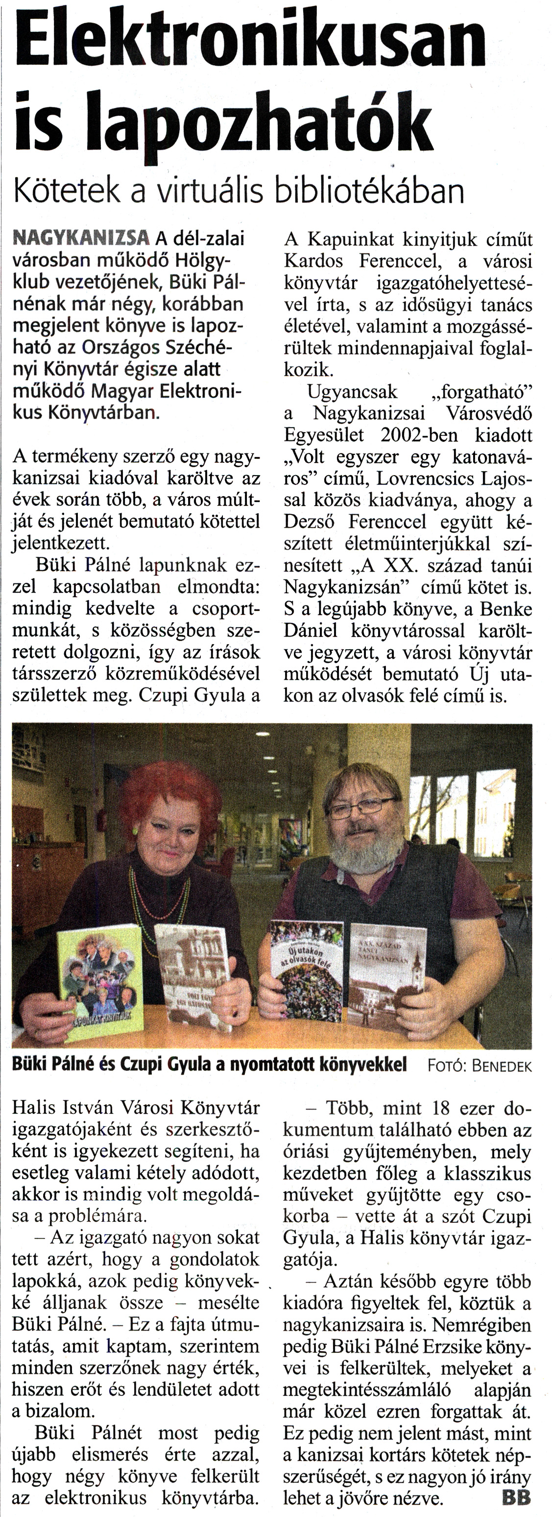 Nyilvános 1954 | 3194 | Zalai Hírlap 2019. január 16. 13. szám 7. oldal - Elektronikusan is lapozhatók | Elektronikusan is lapozhatok Kötetek a virtuális bibliotékában NAGYKANIZSA A dél-zalai városban működő Hölgyklub vezetőjének, Büki Pálnénak már négy, korábban megjelent könyve is lapozható az Országos Széchényi Könyvtár égisze alatt működő Magyar Elektronikus Könyvtárban. A termékeny szerző egy nagykanizsai kiadóval karöltve az évek során több, a város múltját és jelenét bemutató kötettel jelentkezett. Büki Pálné lapunknak ezzel kapcsolatban elmondta: mindig kedvelte a csoportmunkát, s közösségben szeretett dolgozni, így az írások társszerző közreműködésével születtek meg. Czupi Gyula a Halis István Városi Könyvtár igazgatójaként és szerkesztőként is igyekezett segíteni, ha esetleg valami kétely adódott, akkor is mindig volt megoldása a problémára. - Az igazgató nagyon sokat tett azért, hogy a gondolatok lapokká, azok pedig könyvekké álljanak össze - mesélte Büki Pálné. - Ez a fajta útmutatás, amit kaptam, szerintem minden szerzőnek nagy érték, hiszen erőt és lendületet adott a bizalom. Büki Pálnét most pedig újabb elismerés érte azzal, hogy négy könyve felkerült az elektronikus könyvtárba. A Kapuinkat kinyitjuk címűt Kardos Ferenccel, a városi könyvtár igazgatóhelyettesével írta, s az idősügyi tanács életével, valamint a mozgássérültek mindennapjaival foglalkozik. Ugyancsak „forgatható" a Nagykanizsai Városvédő Egyesület 2002-ben kiadott „Volt egyszer egy katonaváros" című, Lovrencsics Lajossal közös kiadványa, ahogy a Dezső Ferenccel együtt készített életműinterjúkkal színesített „A XX. század tanúi Nagykanizsán" című kötet is. S a legújabb könyve, a Benke Dániel könyvtárossal karöltve jegyzett, a városi könyvtár működését bemutató Új utakon az olvasók felé című is. - Több, mint 18 ezer dokumentum található ebben az óriási gyűjteményben, mely kezdetben főleg a klasszikus műveket gyűjtötte egy csokorba - vette át a szót Czupi Gyula, a Halis könyvtár igazgatója. - Aztán később egyre több kiadóra figyeltek fel, köztük a nagykanizsaira is. Nemrégiben pedig Büki Pálné Erzsike könyvei is felkerültek, melyeket a megtekintésszámláló alapján már közel ezren forgattak át. Ez pedig nem jelent mást, mint a kanizsai kortárs kötetek népszerűségét, s ez nagyon jó irány lehet a jövőre nézve. BB |
