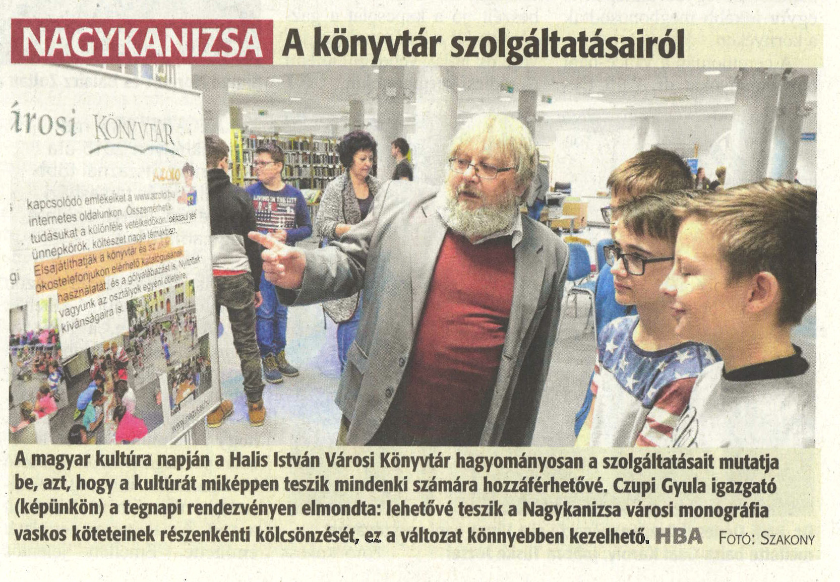 Nyilvános 1899 | 3253 | Zalai Hírlap 2019. január 23. 19. szám 4. oldal - A könyvtár szolgáltatásairól | A magyar kultúra napján a Halis István Városi Könyvtár hagyományosan a szolgáltatásait mutatja be, azt, hogy a kultúrát miképpen teszik mindenki számára hozzáférhetővé. Czupi Gyula igazgató (képünkön) a tegnapi rendezvényen elmondta: lehetővé teszik a Nagykanizsa városi monográfia köteteinek részenkénti kölcsönzését, ez a változat könnyebben kezelhető. |