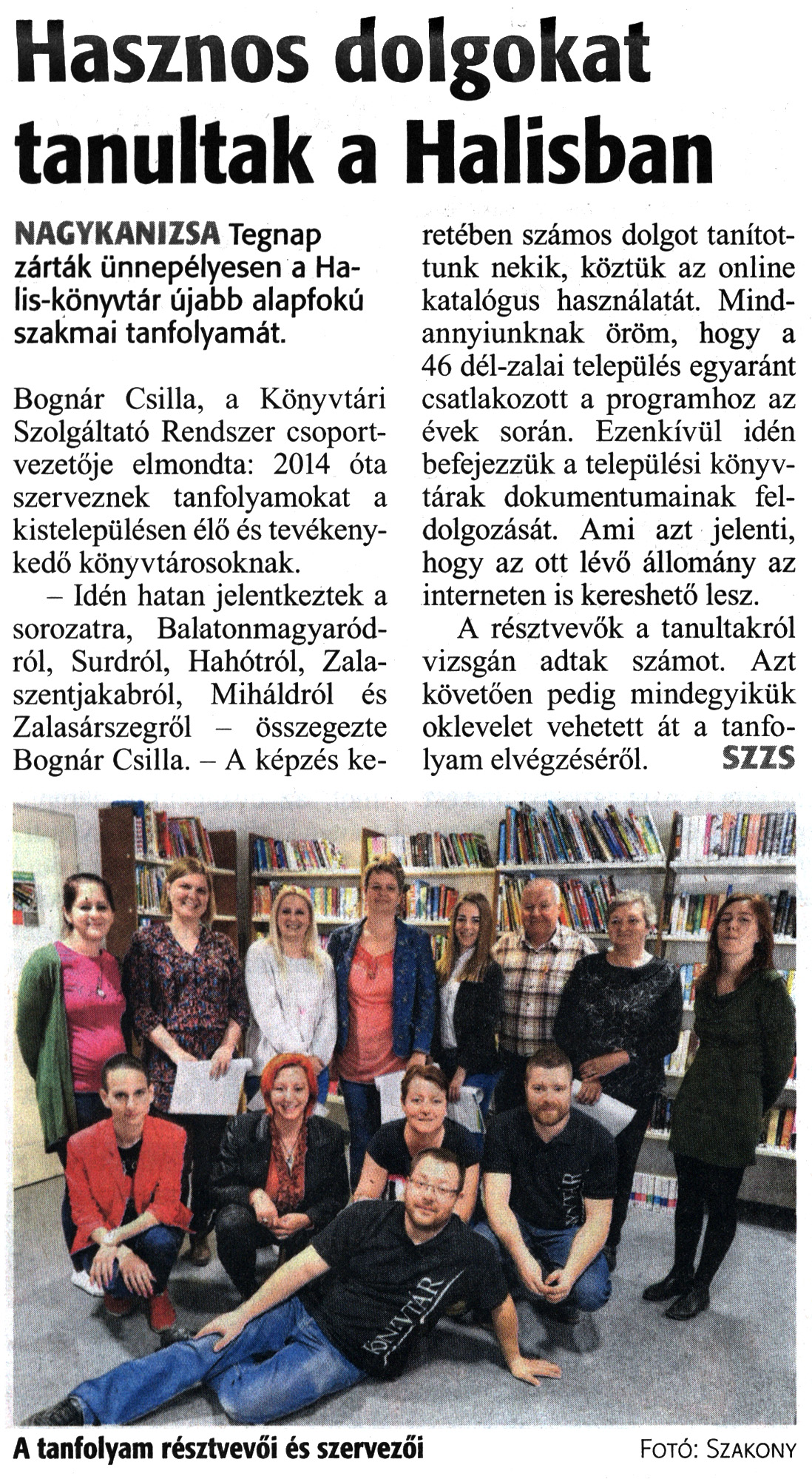 Nyilvános 1897 | 3183 | Zalai Hírlap 2019. április 10. 84. szám 3. oldal | Hasznos dolgokat tanultak a Halisban NAGYKANIZSA Tegnap zárták ünnepélyesen a Halis-könyvtár újabb alapfokú szakmai tanfolyamát. Bognár Csilla, a Könyvtári Szolgáltató Rendszer csoportvezetője elmondta: 2014 óta szerveznek tanfolyamokat a kistelepülésen élő és tevékenykedő könyvtárosoknak. - Idén hatan jelentkeztek a sorozatra, Balatonmagyaródról, Surdról, Hahótról, Zalaszentjakabról, Miháldról és Zalasárszegről - összegezte Bognár Csilla. - A képzés keretében számos dolgot tanítottunk nekik, köztük az online katalógus használatát. Mindannyiunknak öröm, hogy a 46 dél-zalai település egyaránt csatlakozott a programhoz az évek során. Ezenkívül idén befejezzük a települési könyvtárak dokumentumainak feldolgozását. Ami azt jelenti, hogy az ott lévő állomány az interneten is kereshető lesz. A résztvevők a tanultakról vizsgán adtak számot. Azt követően pedig mindegyikük oklevelet vehetett át a tanfolyam elvégzéséről. SZZS |